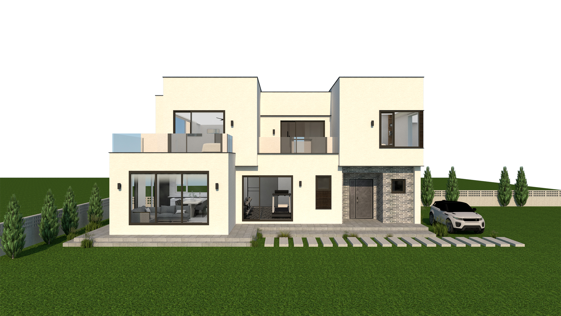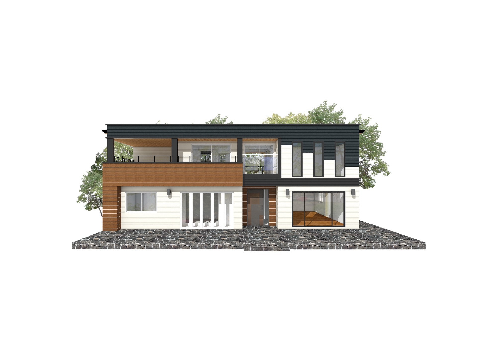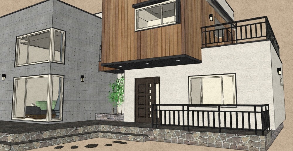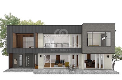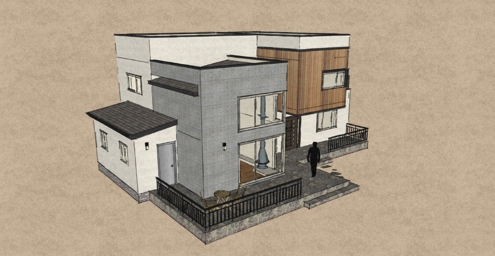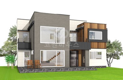 44평형 강화 초지리} |직사각형의 메스를 조화있게 조함한 도시형 주택 입체적으로 입면을 배치한 모던주택 2층에 있는 실을 앞으로 당겨놓은 메스가 현관 케노피로서의 기능적인 역할도 하면서 주택에 입체감을 실려주며, 단순한 메스의 조함으로 깔끔하고 세련됨을 느낄수 있는 실용적인 전원주택