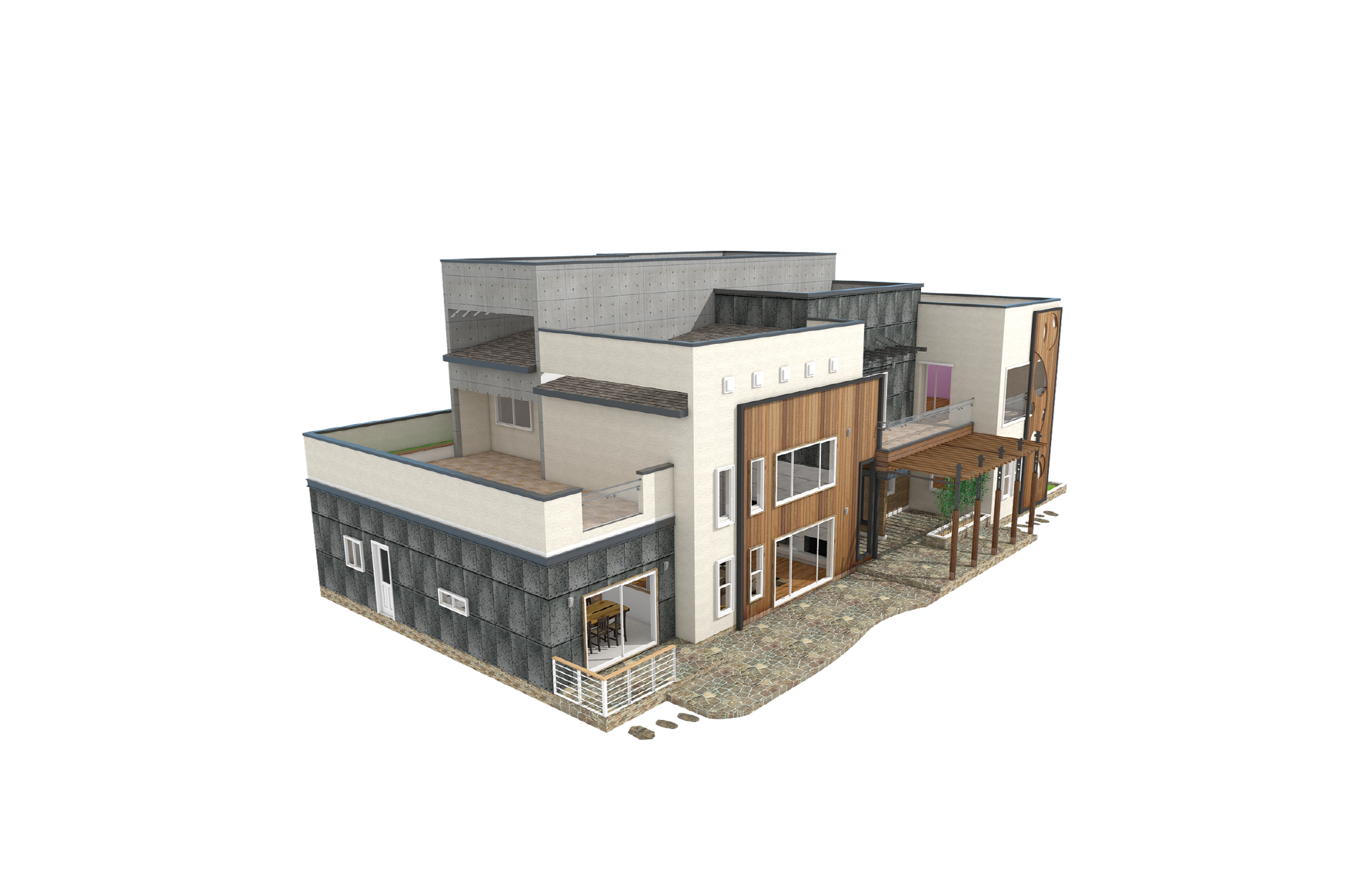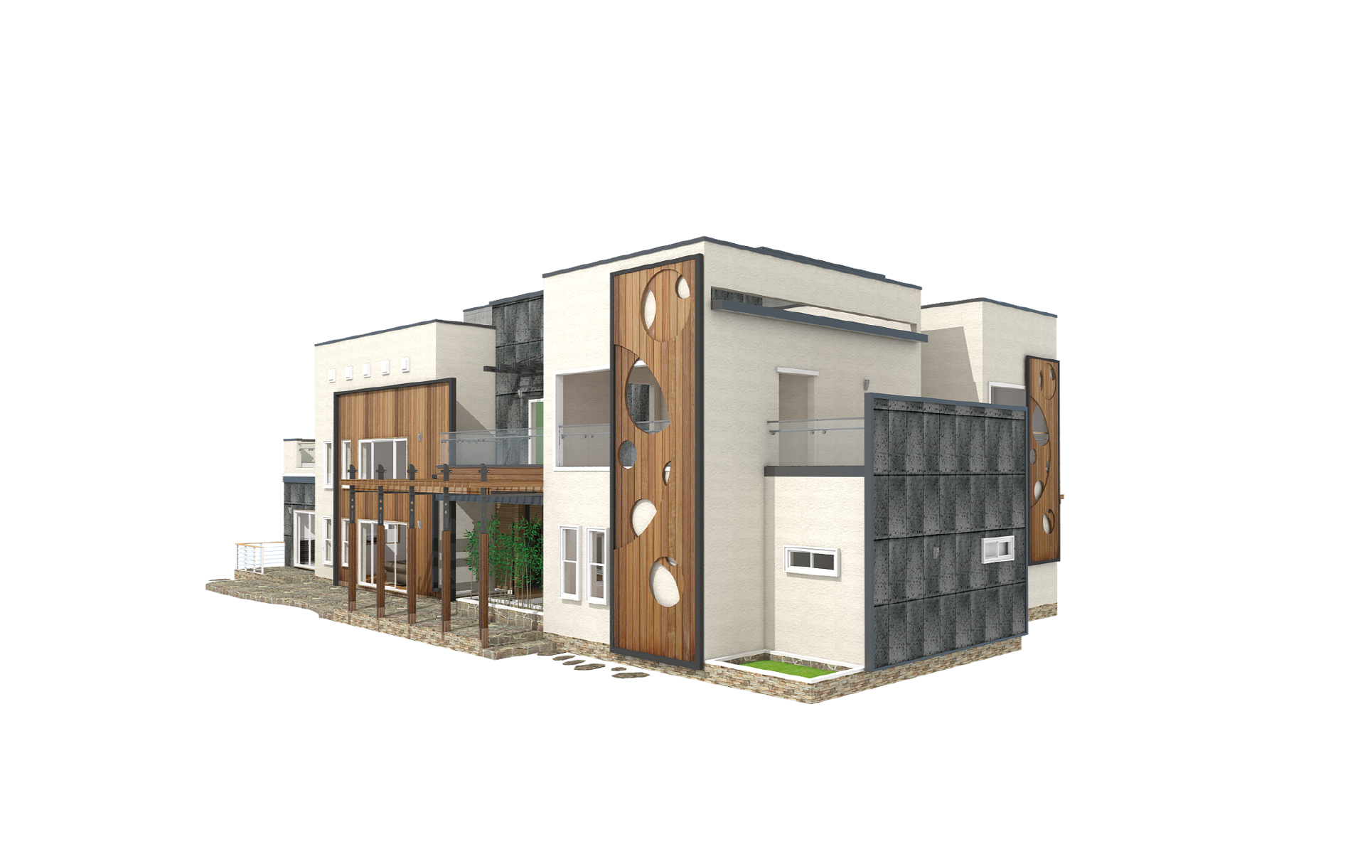 125평형 청라 1호|고급스런 기하학 무늬의 포인트월을 접목시킨 모던주택 집안 곳곳에 전원의 아늑함을 모두 갖춘 고급주택 외관의 이미지는 목재의 따뜻하고 자연스러운 느낌을 포인트로 사용하였다. 원형을 겹쳐서 표현한 부분은 '나무로 된 물통에 시원한 빗방울이 떨어지는 모습'을 형상화시켰으며, 목조주택이라는 친환경 주택의 이미지와의 연장선상에서 디자인된 단독주택