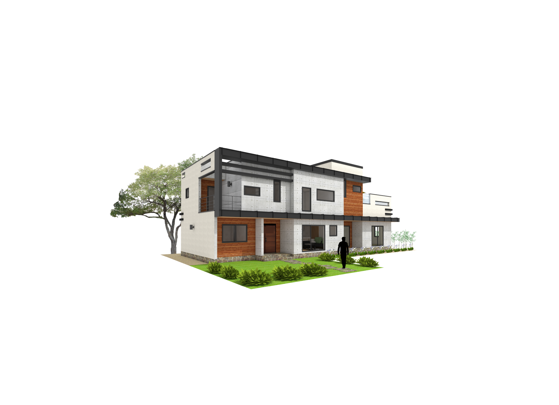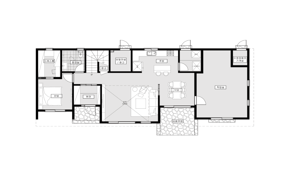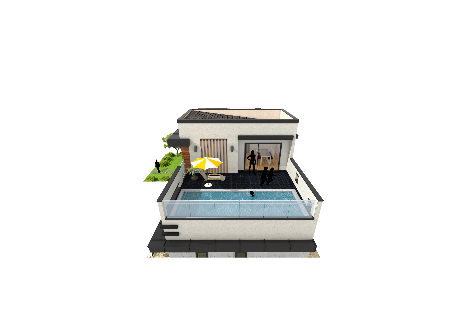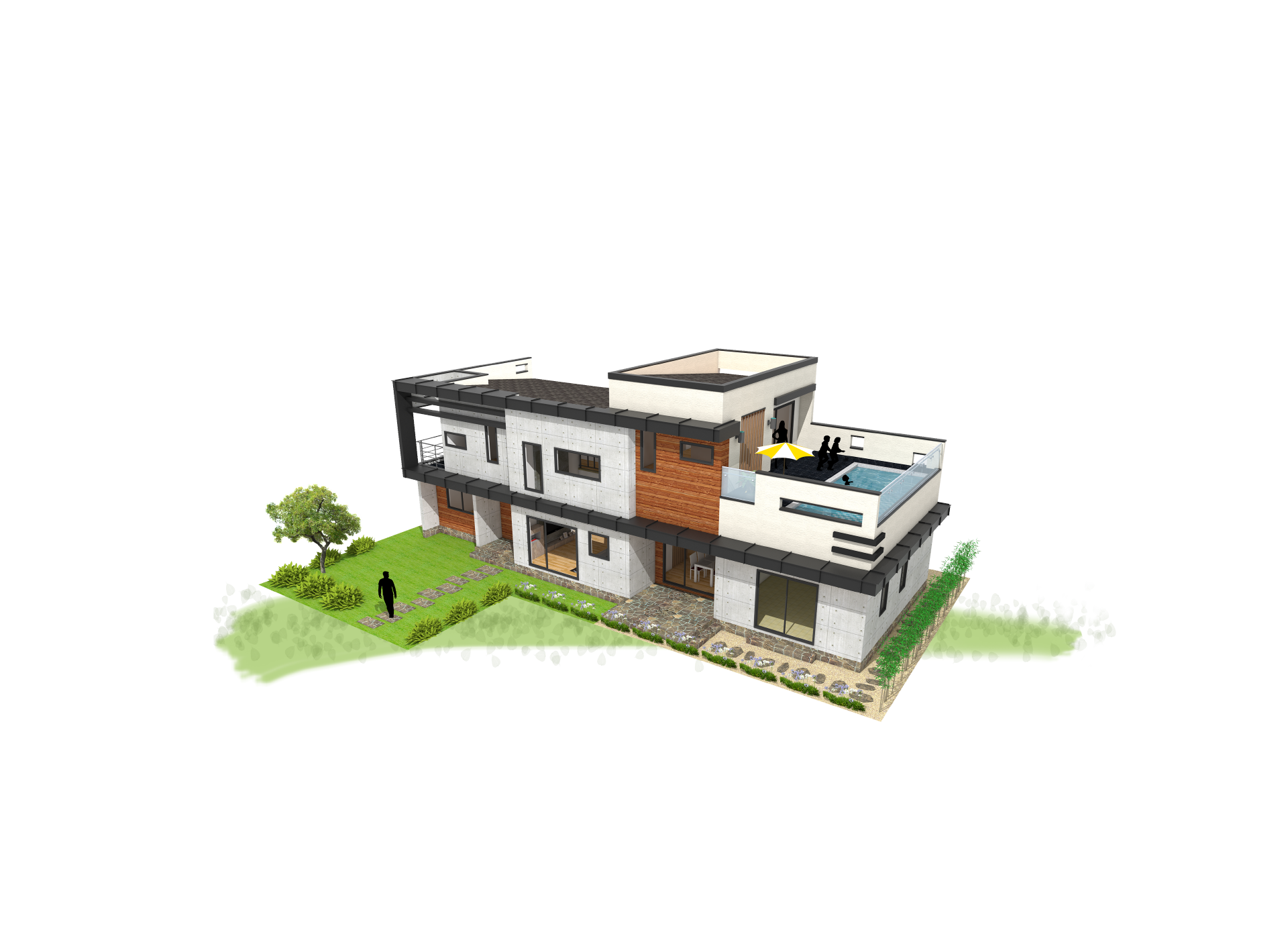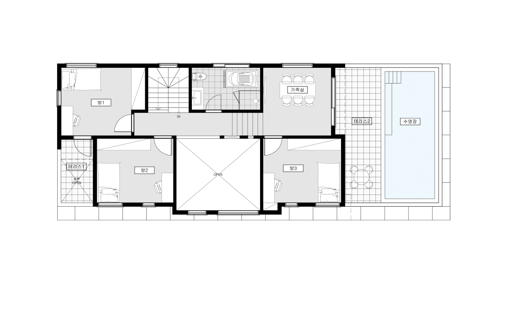 64평형 용인 상현동|ㄷ자 형태의 곧은 직선 속에 담은 다양한 형태의 창문으로 예술적 디자인과 수영장이 있는 모던주택 블랙의 선을 강조한 디자인 속에 다양한 형태의 창과 입체감을 통해 심플하면서 단조롭지 않은 디자인 계획과 2층에 수영장이 있는 공간이 집과 노출콘크리트 패널과 적삼목 사이딩의 색이 조화로 어울리는 모던주택.