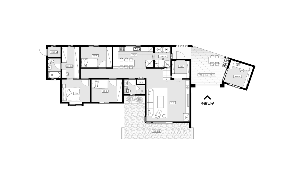 현관에 들어섰을때 확 트여있는 거실공간이 구성됨으로써 답답하지 않은 구조의 클래식한 모던주택