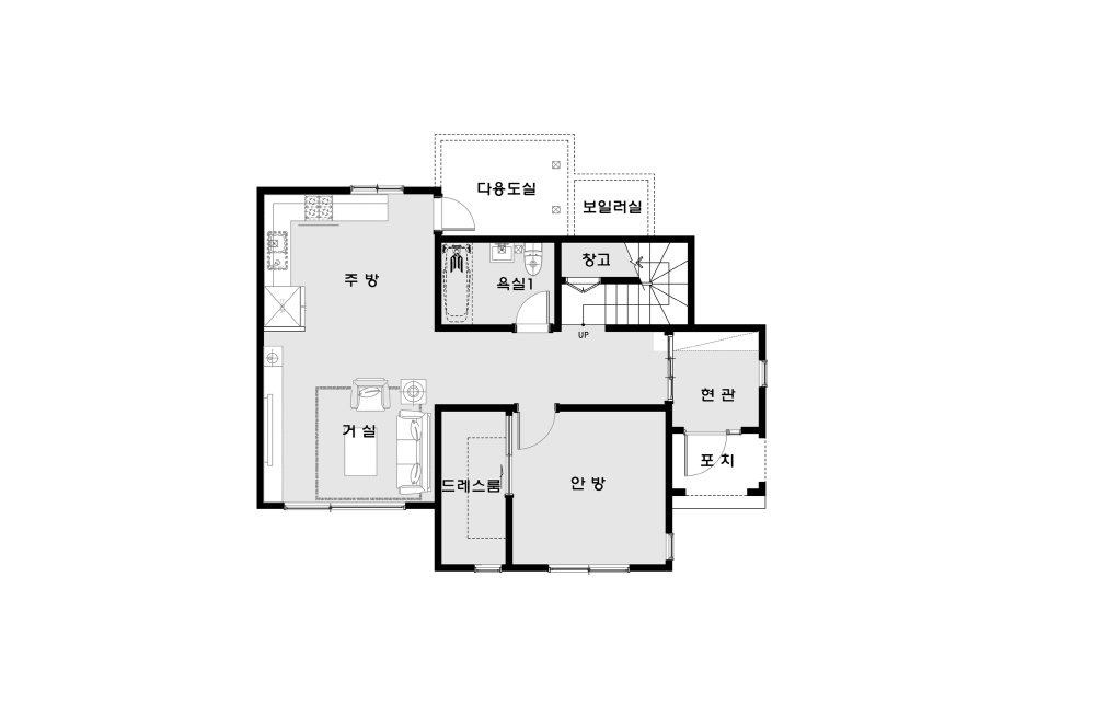 깔끔함과 세련됨이 돋보이는 주택이며, 거실과 주방의 일자배열로 실용적인 공간의 전원주택.