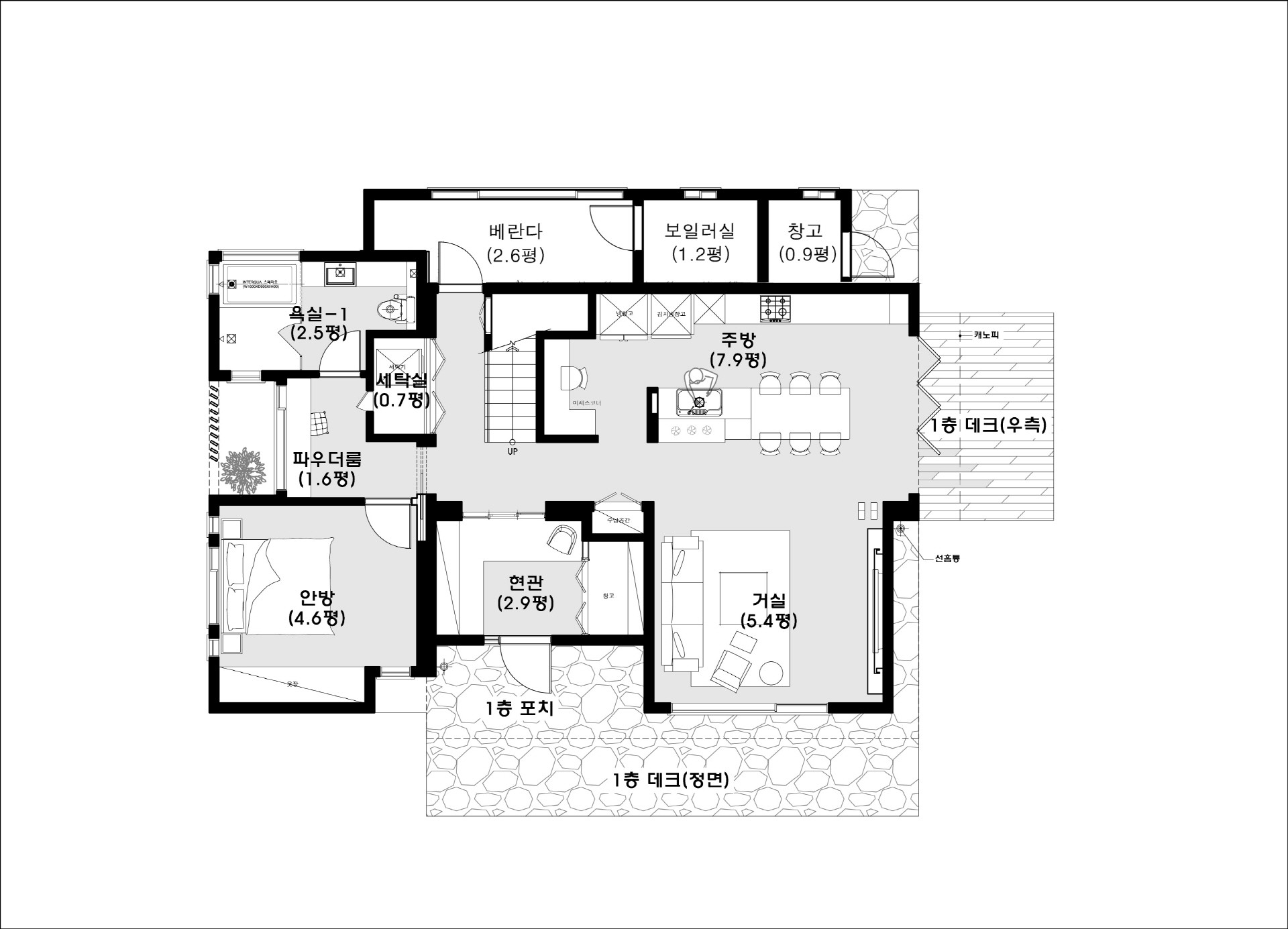 현관은 그집의 얼굴이라 넓은 현관과 중문을 열고 들어갔을때 확 트이는 느낌을 줄수있게 평면계획을 하였고|주부의 동선을 고려안 설계로써 가사일을 해야하는 주부들이 소외되지 않게 주방에서 요리를하면서