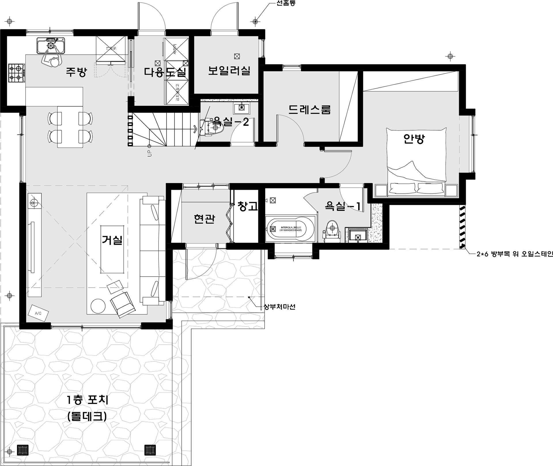 현관옆에 창고를 배치함으로써 사용자의 편리를 배려했고, 복도면에 일자계단과 주방과 거실의 일자배열로