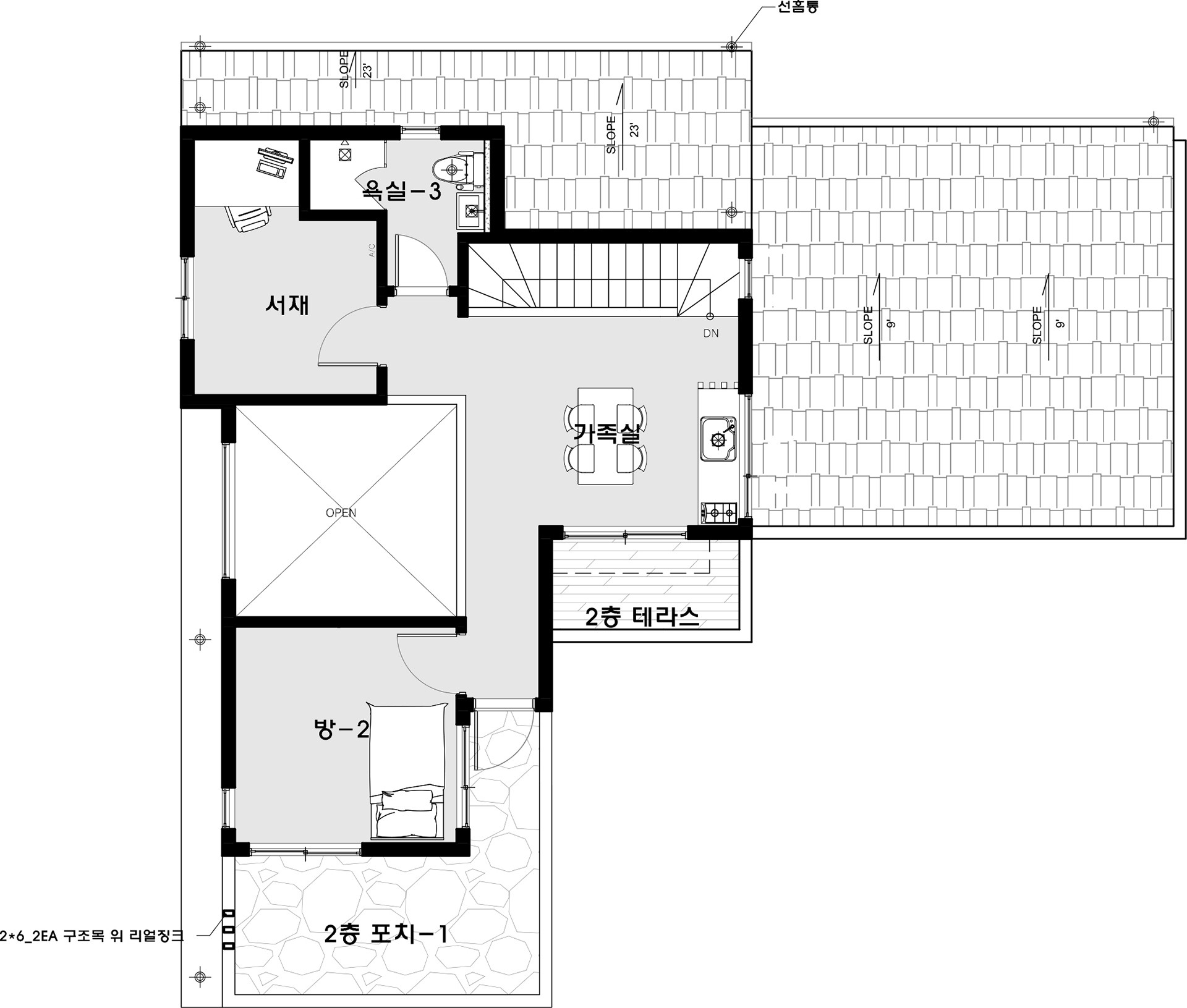 구조 및 규모 : 미국식 경량목구조 / 지상2층|지붕재 : 이중그림자슁글