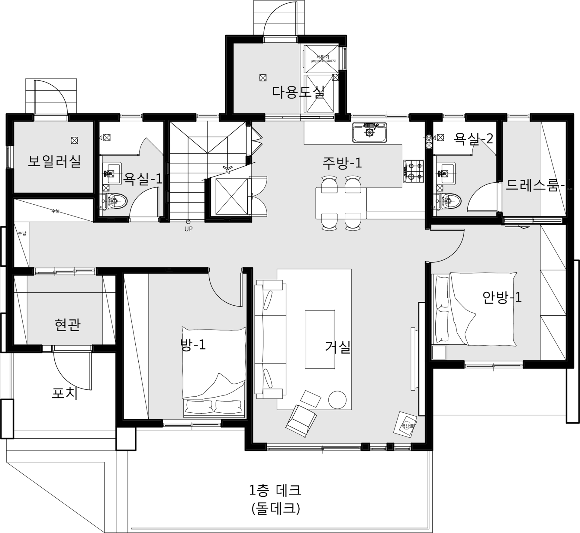 삼대가 같이사는 주택으로써 1층에는 부모님세대가, 2층에는 자녀부부내외가 거주하는 단독주택