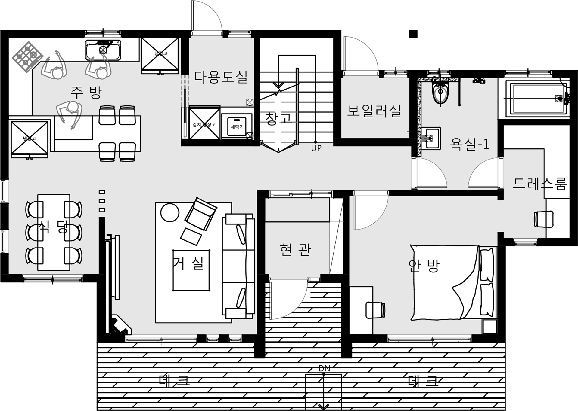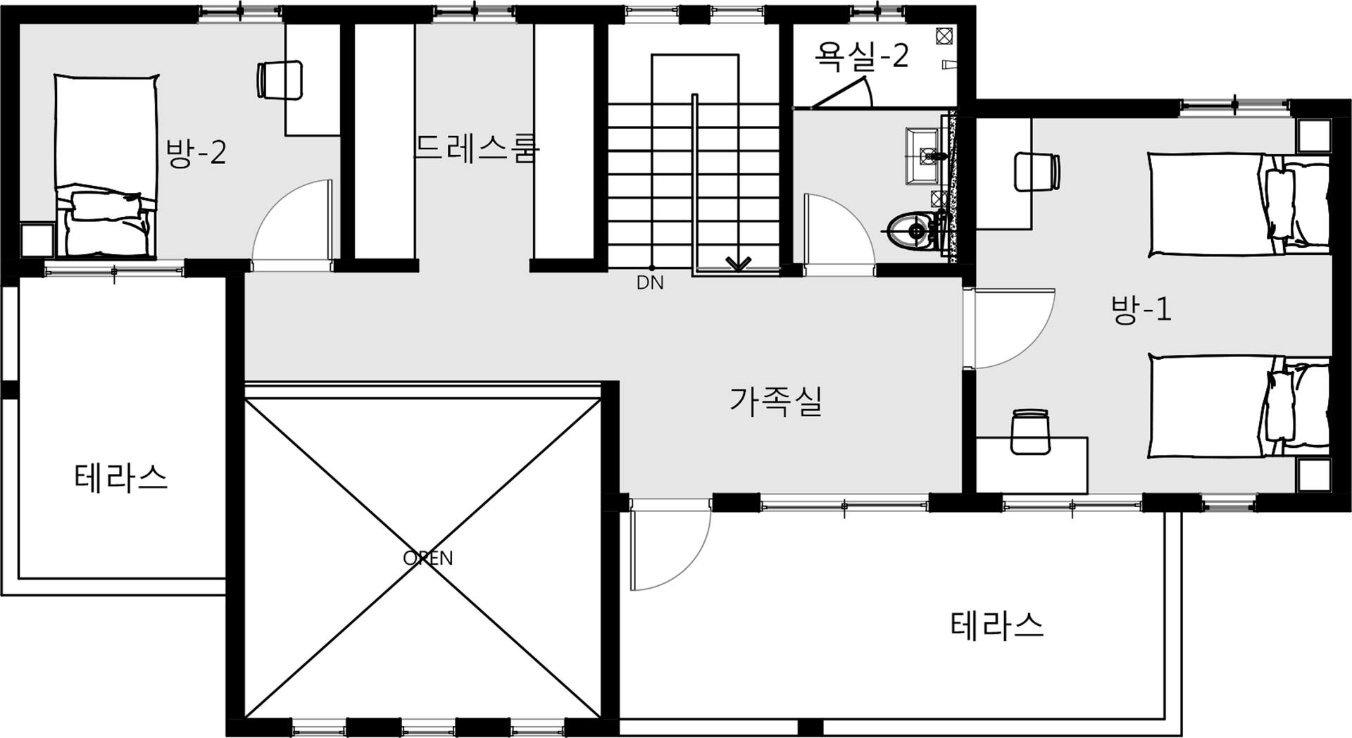 49평형 양주 석우리|깔끔함이 돋보이는 모임지붕으로 스타코플렉스와 부분적으로 일본 세라믹타일,리얼징크 외장재로 포인트를 준 세련미가 돋보이는 세미모던형주택 부부와 3명의 딸이 같이사는 주택으로 1층에는 부부내외가, 2층에는 자녀3명이 거주하는 단독주택 1층거실은 상부를 오픈하여 시원한 느낌을 더하였고 주방은 여러명이 작업이 가능하도록 충분한 공간을 확보하였다 2층은 자녀들 공간으로 별도의 드레스룸을 두어 많은 수납이 가능하게 하였고 2개의 테라스로 나가는 입구에는 지붕덮인 테라스공간이 되게하여 사용성을 높였다.