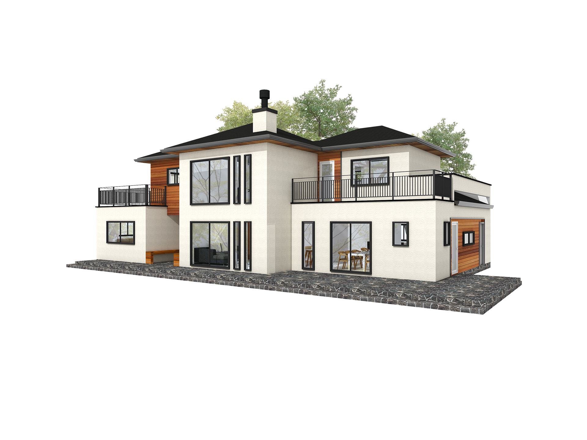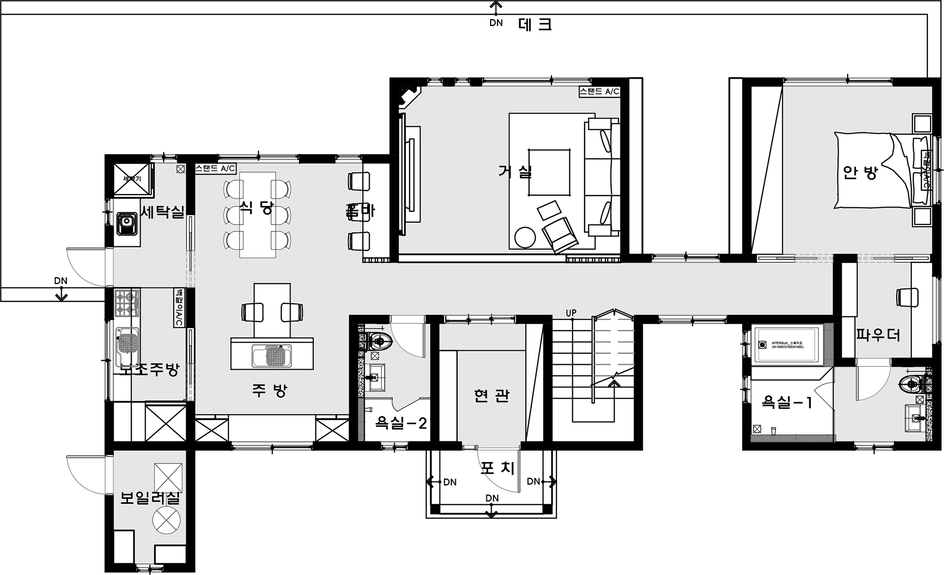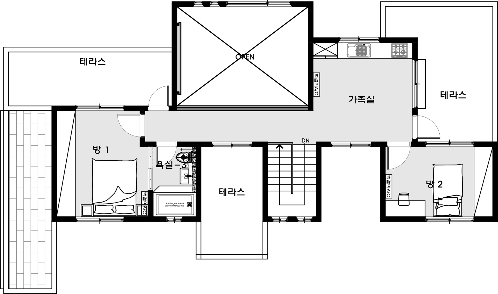 60평형 홍천 모곡리|북향주택의 단점을 극복하고자 주택내 매스사이의 공간을 두어 빛의유입을 적극적으로 유도하였고 모임지붕을 계획하여 전체적으로 차분하면서 세련된 느낌이 나는 세미모던형주택 외국에서 사업하시는 건축주내외분의 주택으로 동생내외분과 같이 생활가능한 주택으로 계획 1층은 건축주분 공간으로 안방과 공용공간으로 구획하였으며, 2층은 동생내외분과 자녀방으로 계획 강을 바라보는 북향주택으로 남쪽의 창문배치와 사이공간의 구성으로 빛의유입을 극대화했다 거실상부는 오픈하여 시원한 느낌을 더하였고 주방과 식당, 보조공간등은 건축주분의 동선을 고려하여 계획하였다.식당 전면의 공간은 바베큐 가능한 데크공간을 두었으며 2층의 각방에서도 강조망이 가능한 테라스계획을 하였다.