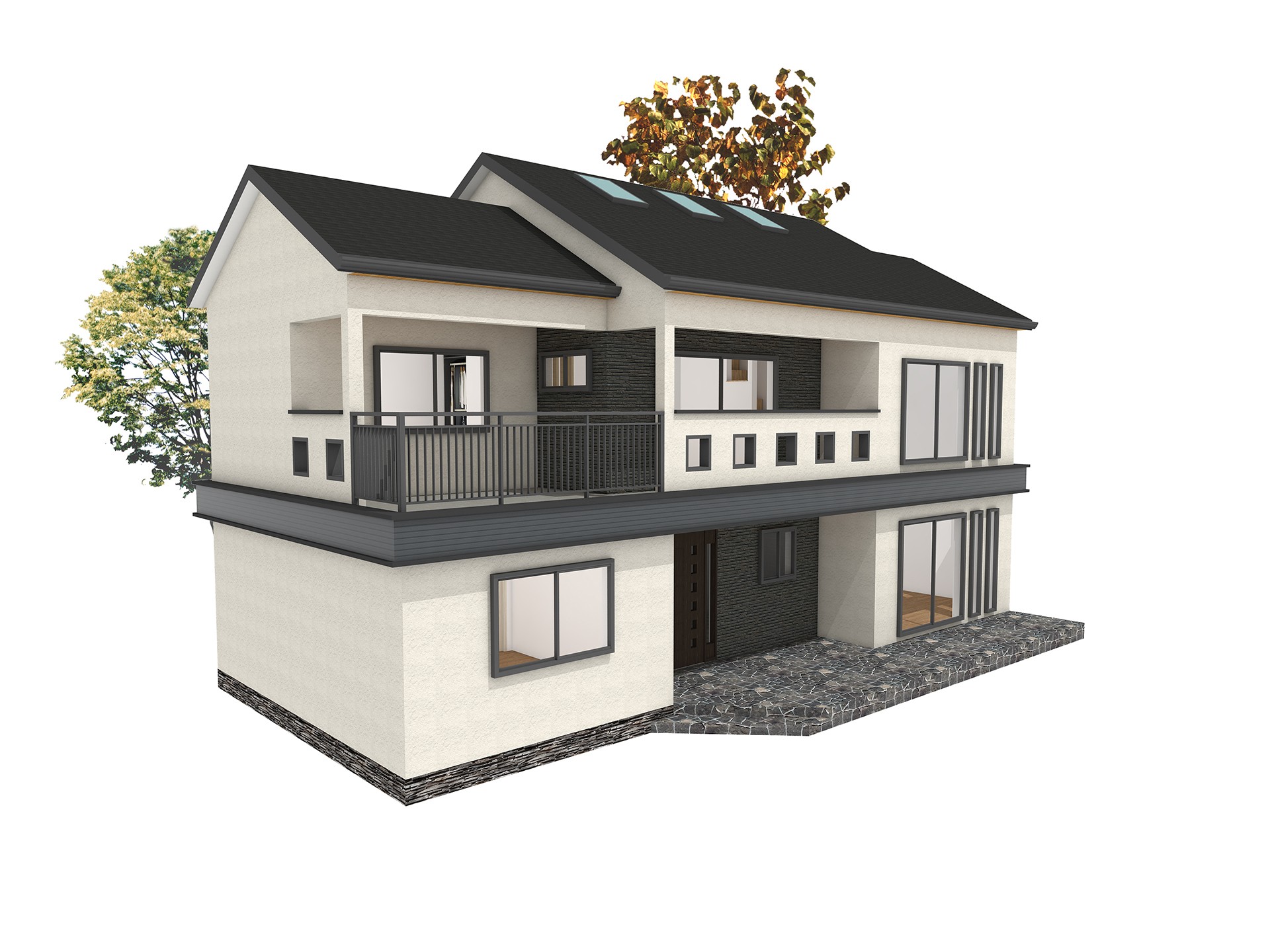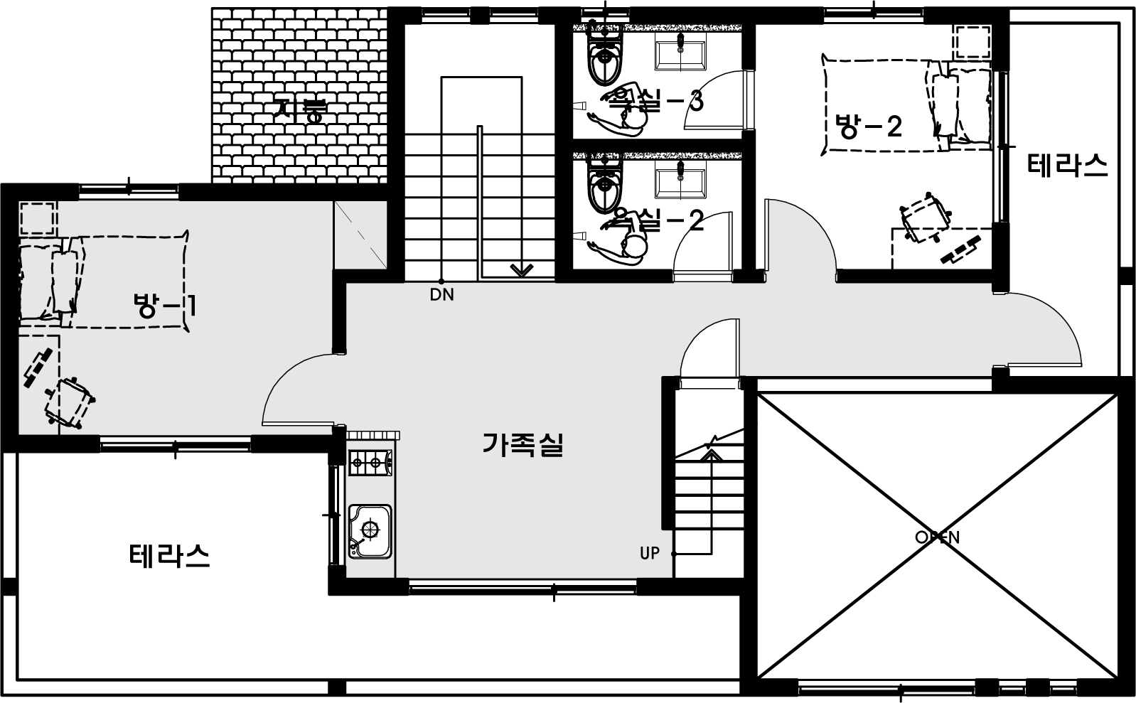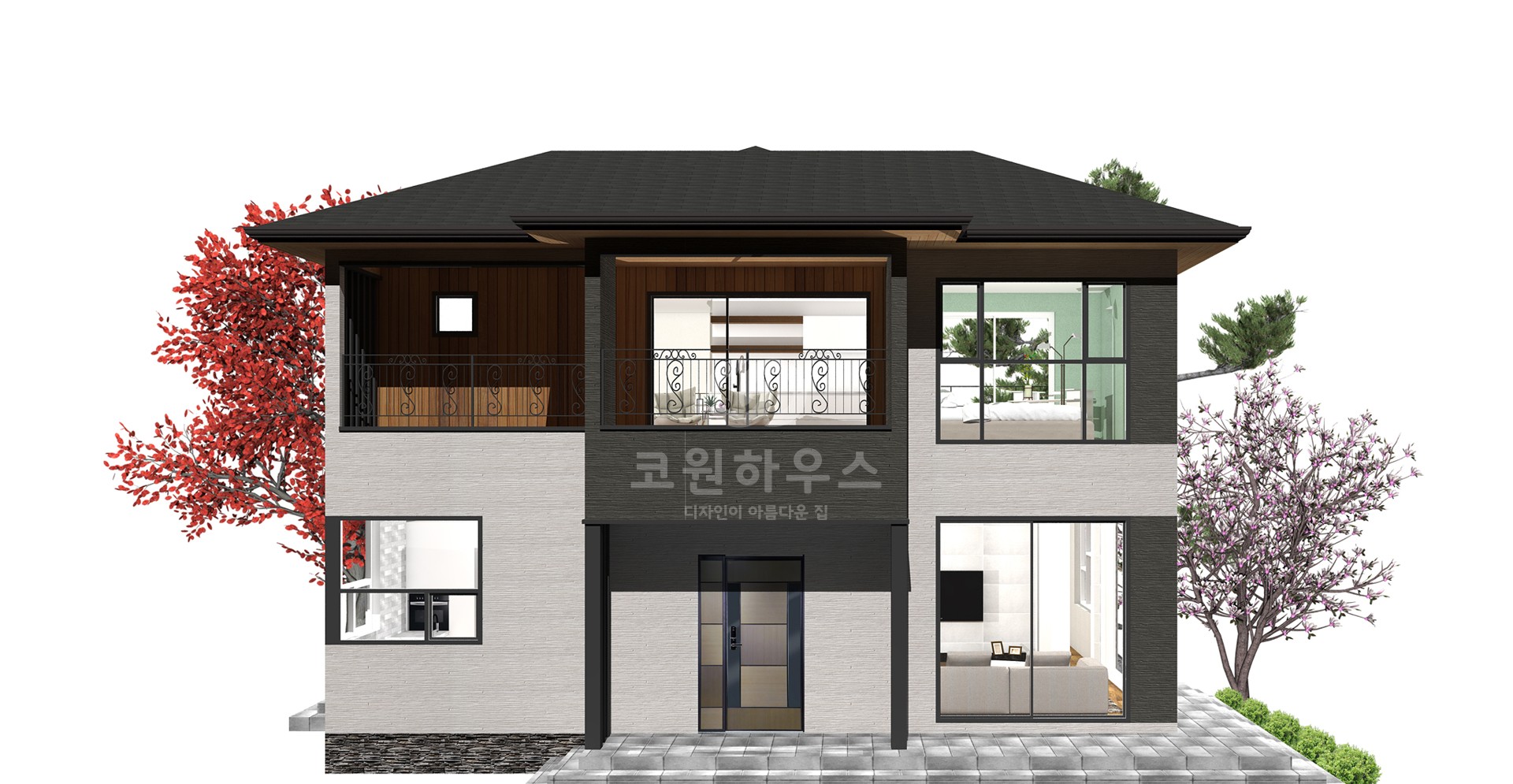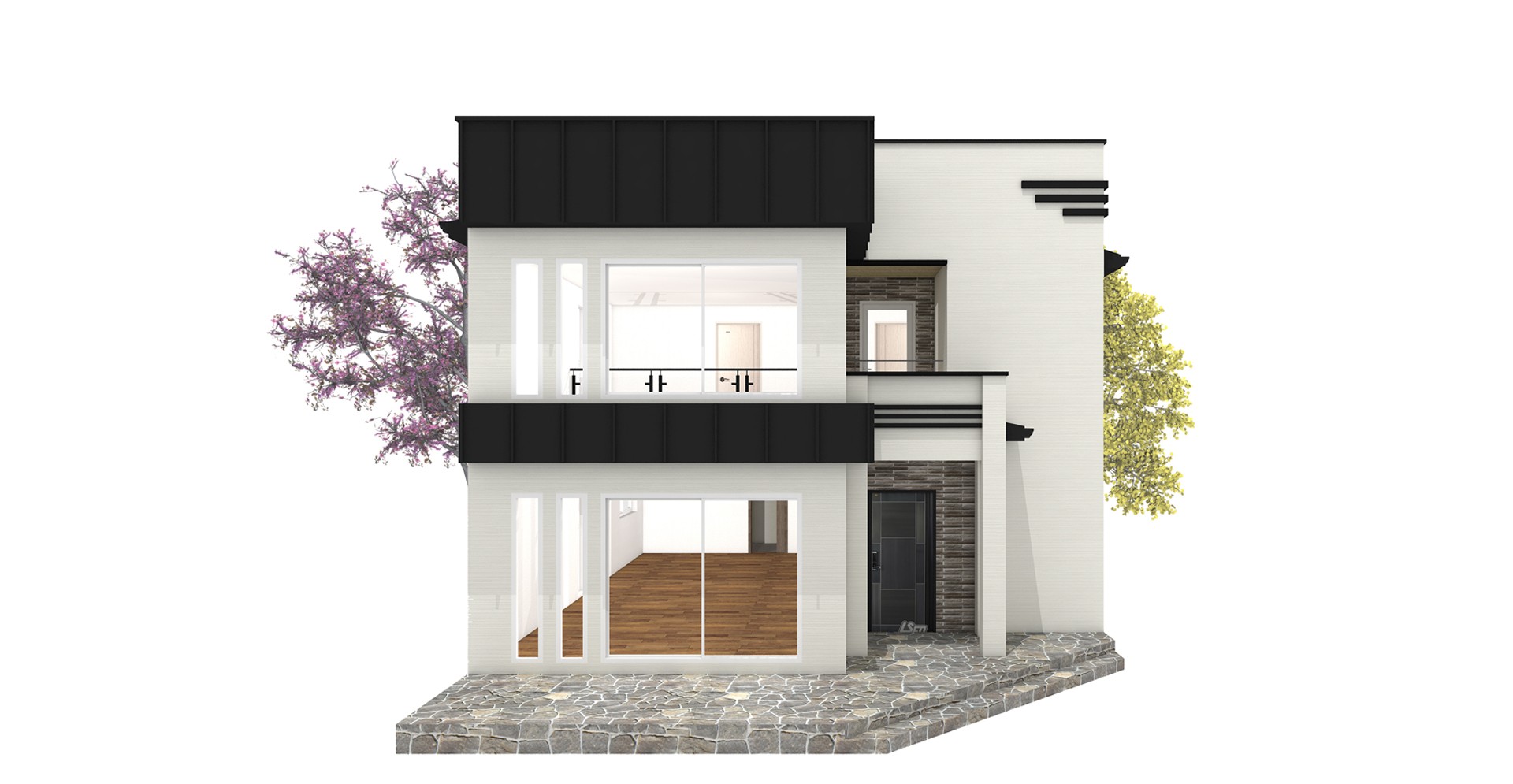 56평형 아산 장재리|흑백의 대비를 통해 깔끔함과 모던함을 강조하였고 부분적 매스의 분리는 재료를 달리해 표현하였다. 흑색계열의 세라믹 지붕을 통해 차분한 느낌이 들게하였고 그아래 작은 매스분절을 통해 지루하지 않은 집이 되게 하였다. 부부와 2자녀를 위한주택으로 1층은 부부공간, 2층은 자녀공간으로 계획하였다. 캠핑계획이 많은 남편분을 위해 현관에 아웃도어룸을 설치하였고, 모자란 수납공간은 다락방을 이용하도록 하였다 2층은 자녀를위한 공간으로 넉넉한 침실, 소규모 간이주방, 2개의 화장실을 설치했다.