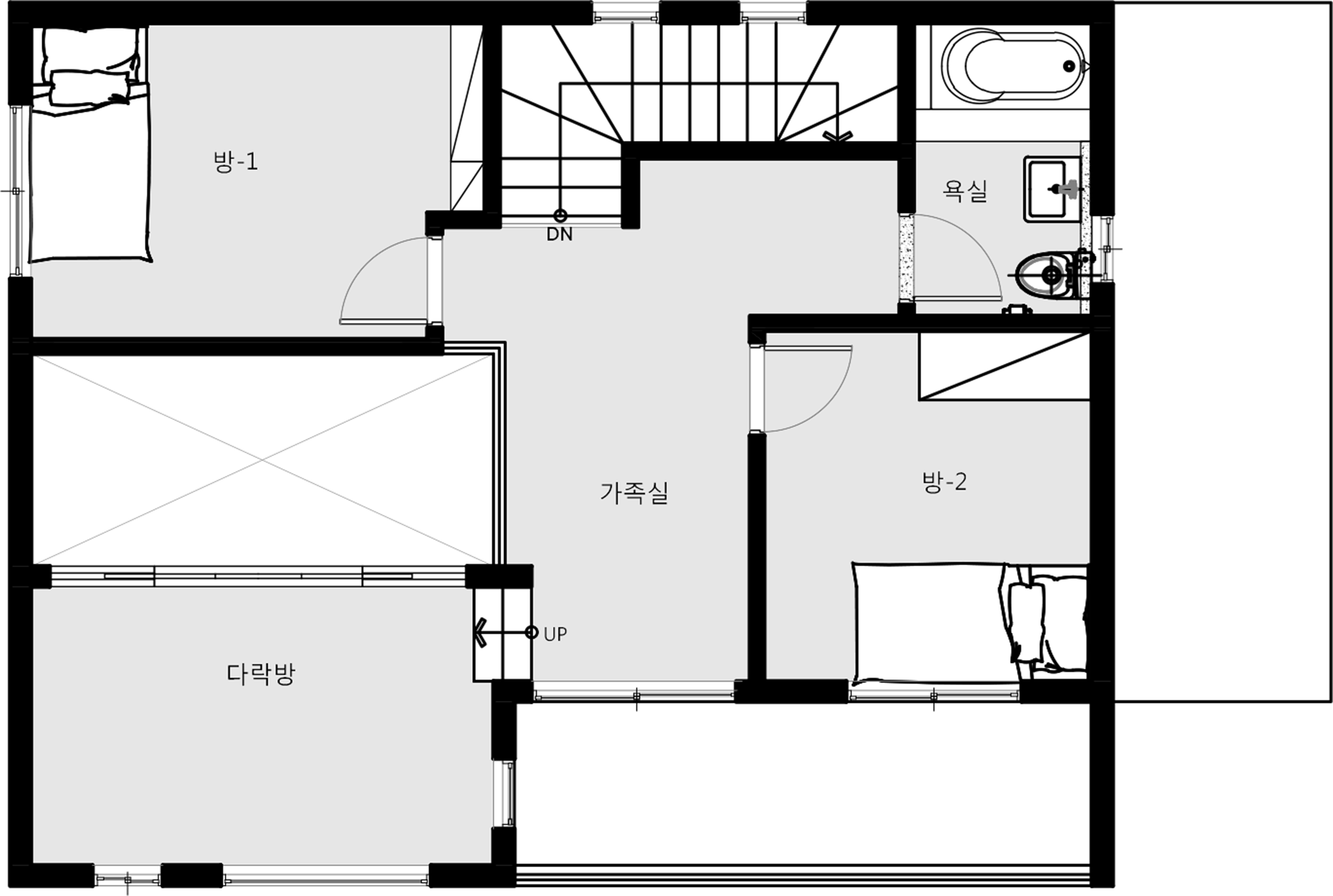 2층 아이들과 가족을 위한 다락방은 낮에는 푸른하늘을 밤에는 별이 가득한 밤하늘을 보며 아이들의 꿈과 희망을 만들 수 있는 공간으로 천창디자인 계획