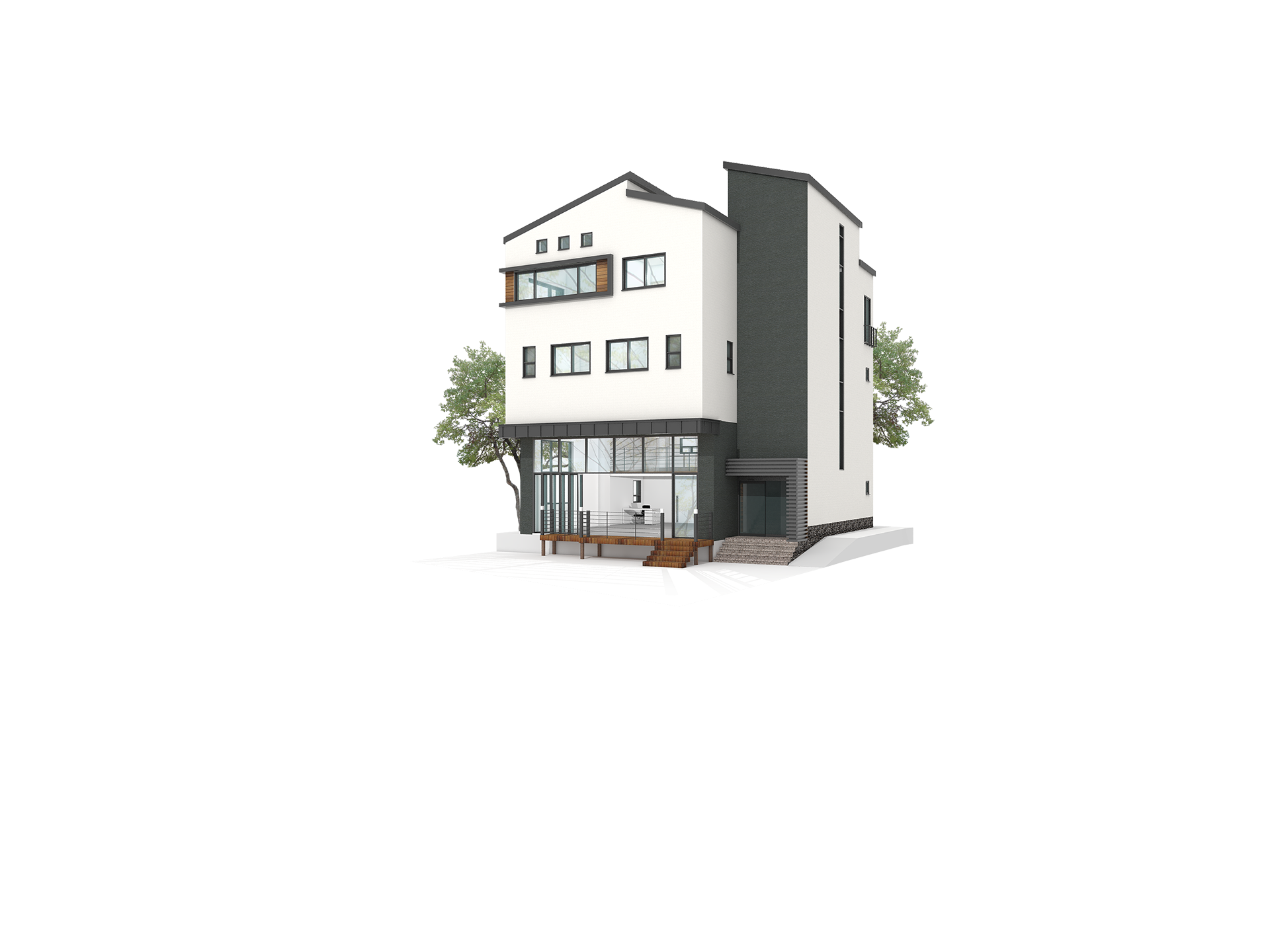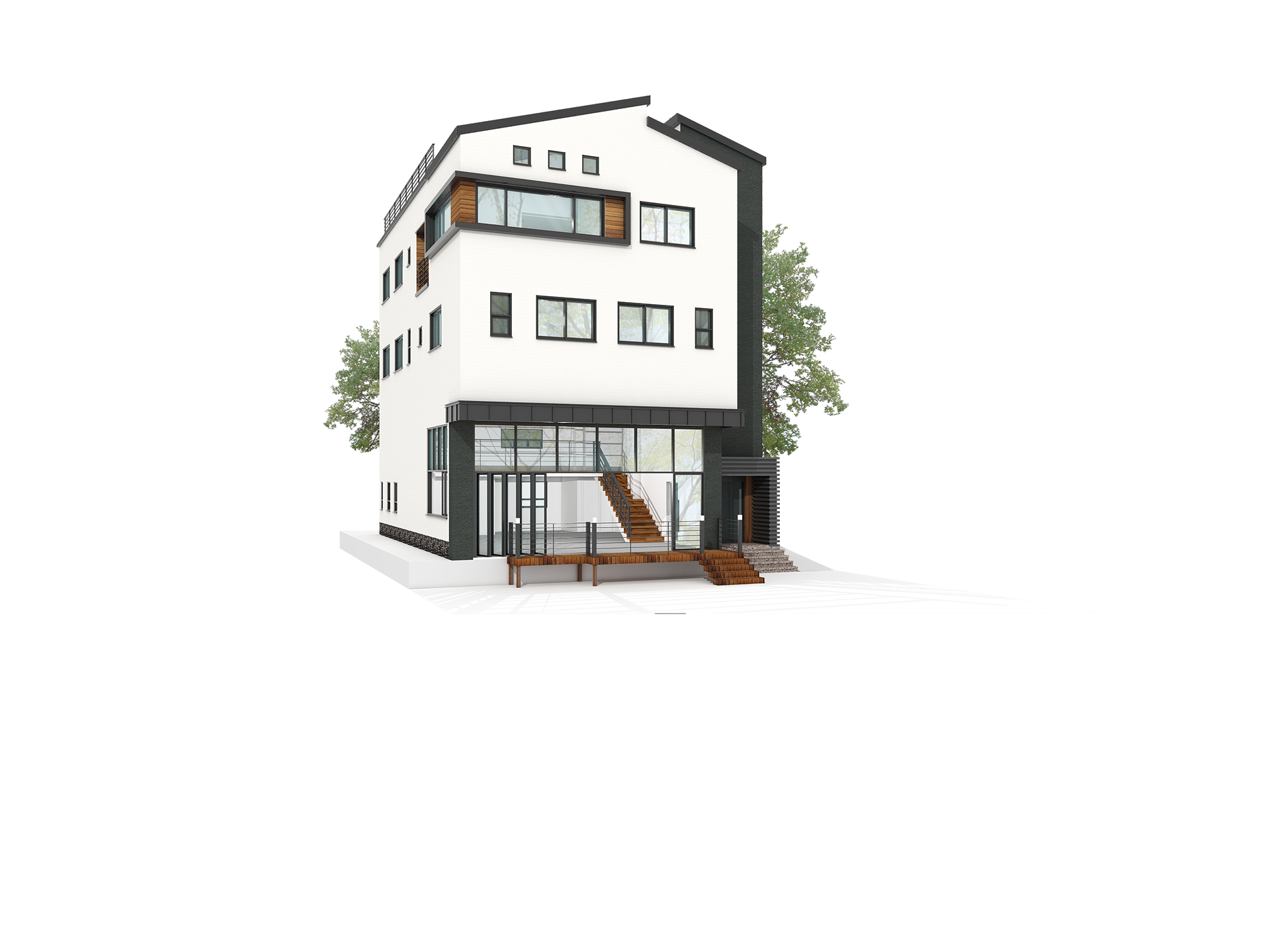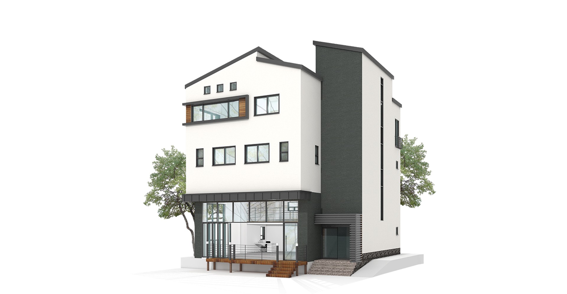 주변 근린생활시설들과 조화를 고려하여 심플한 매스에 리얼징크, 세라믹 사이딩, 합성목재를 사용하여