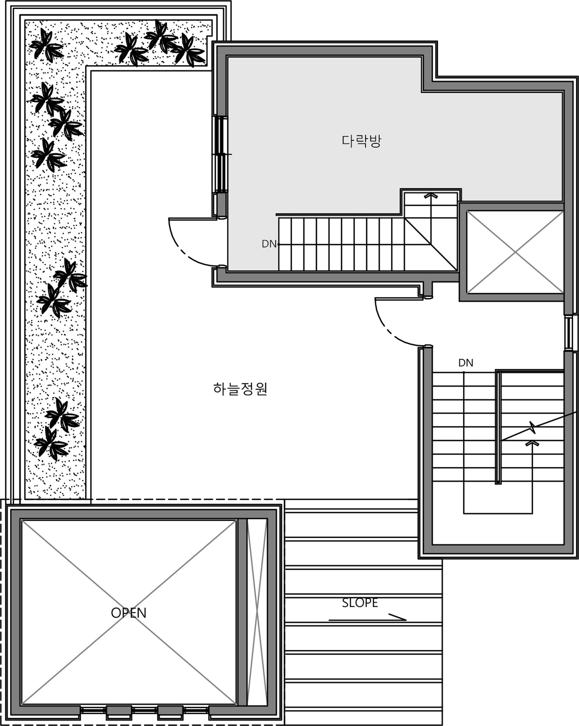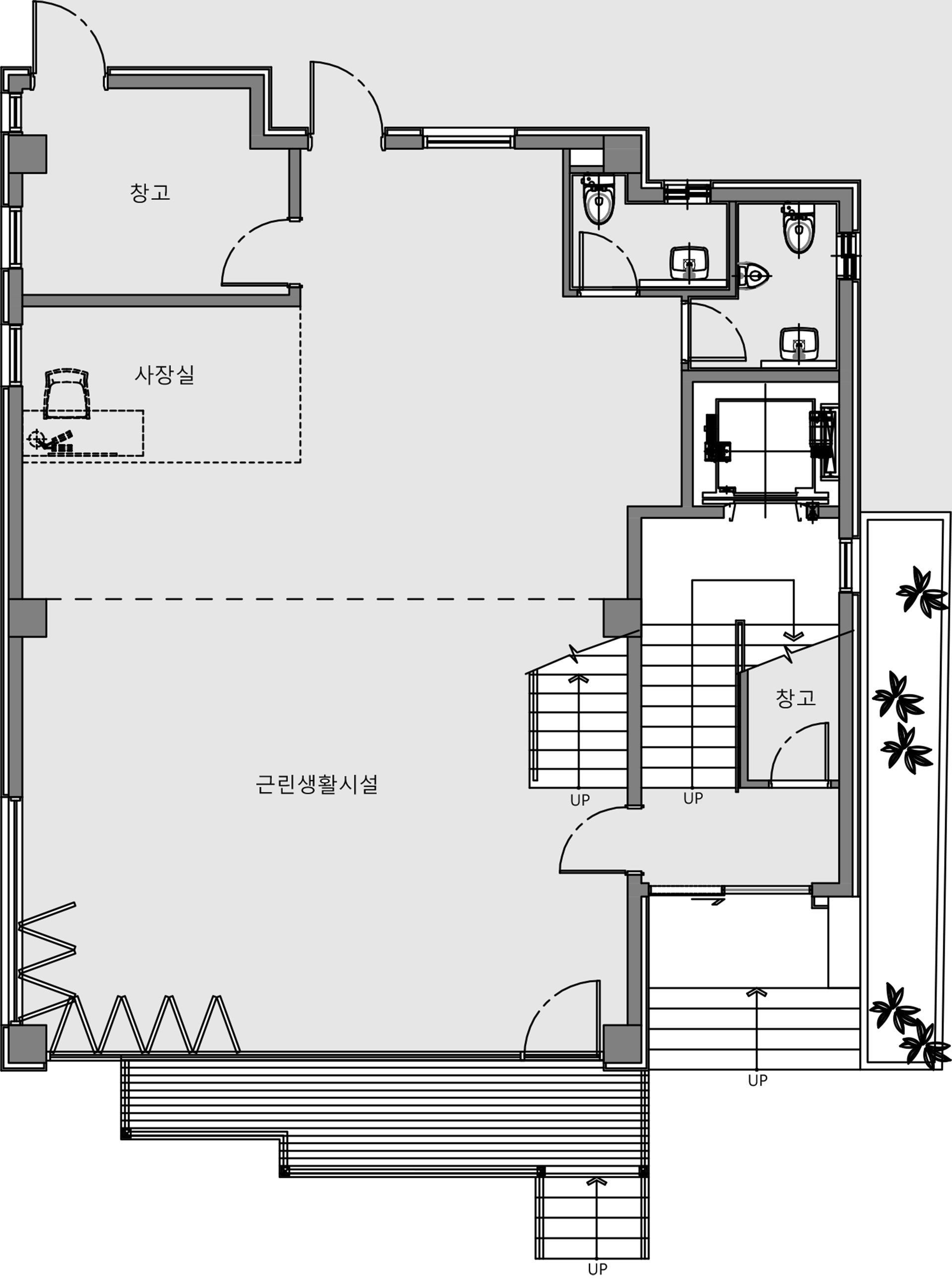 대지형태와 레벨차이를 고려하여 전면을 주도로를 향하도로 배치하여 보행자 및 차량 출입이 용이하게 계획하였음