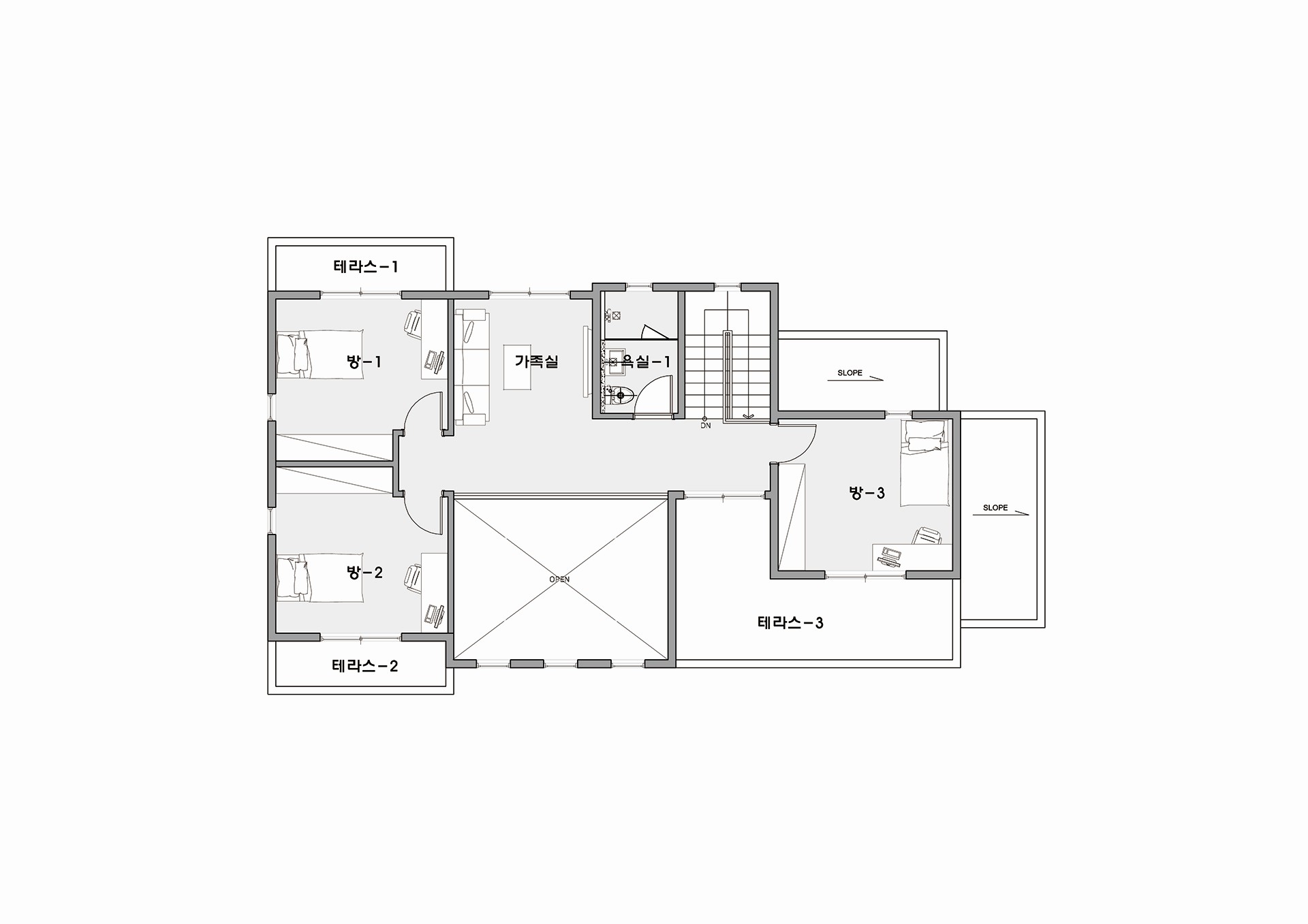 2층은 각 방마다 테라스를 두어 주변 풍경을 조망하는데 용이하게 하였다.
