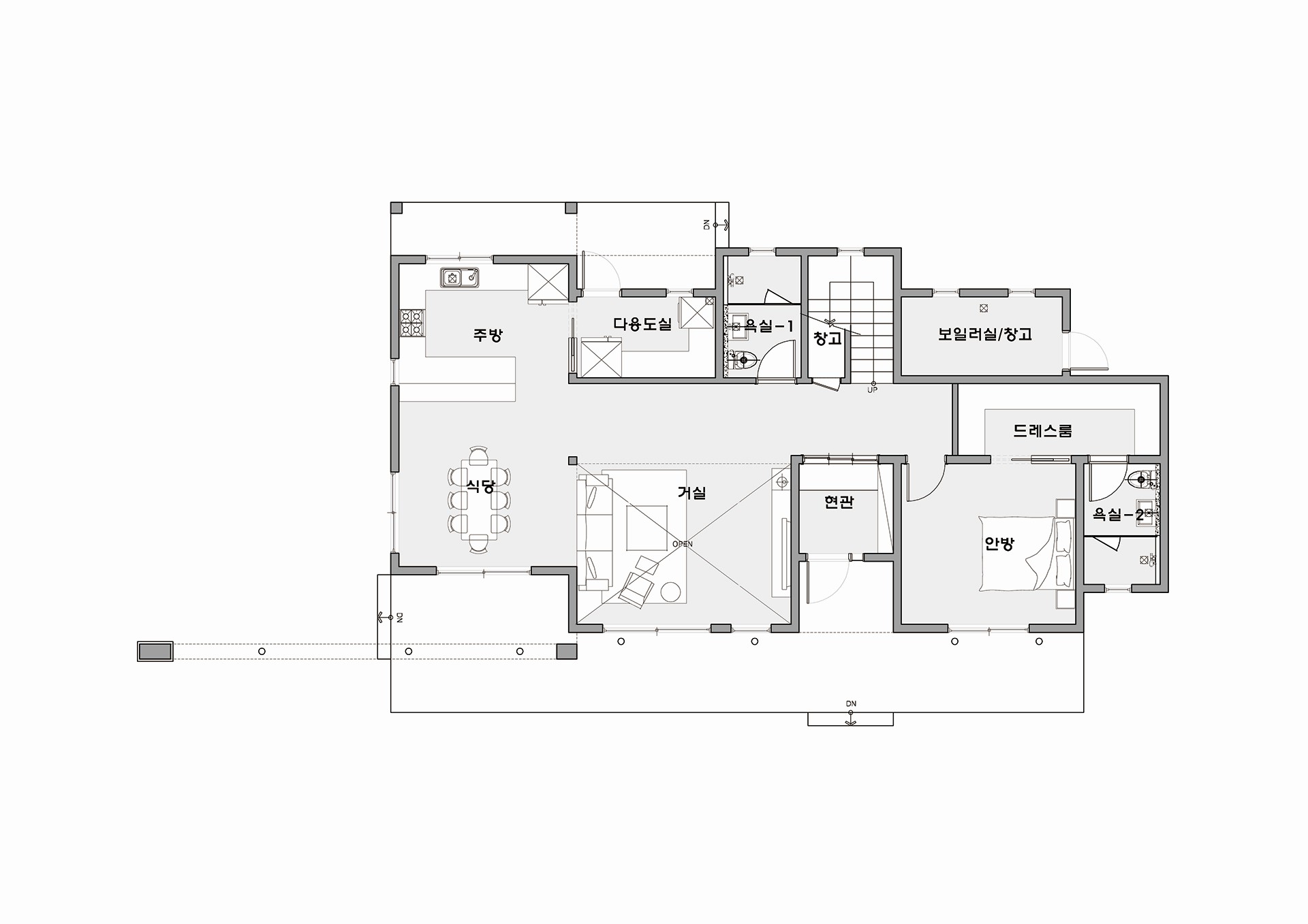 1층은 많은 가족수를 고려하여 거실과 주방을 넓게 계획하였으며 거실 상부를 하이실링 처리하여 공간이 더욱 넓어 보일 수 있도록 하였다.