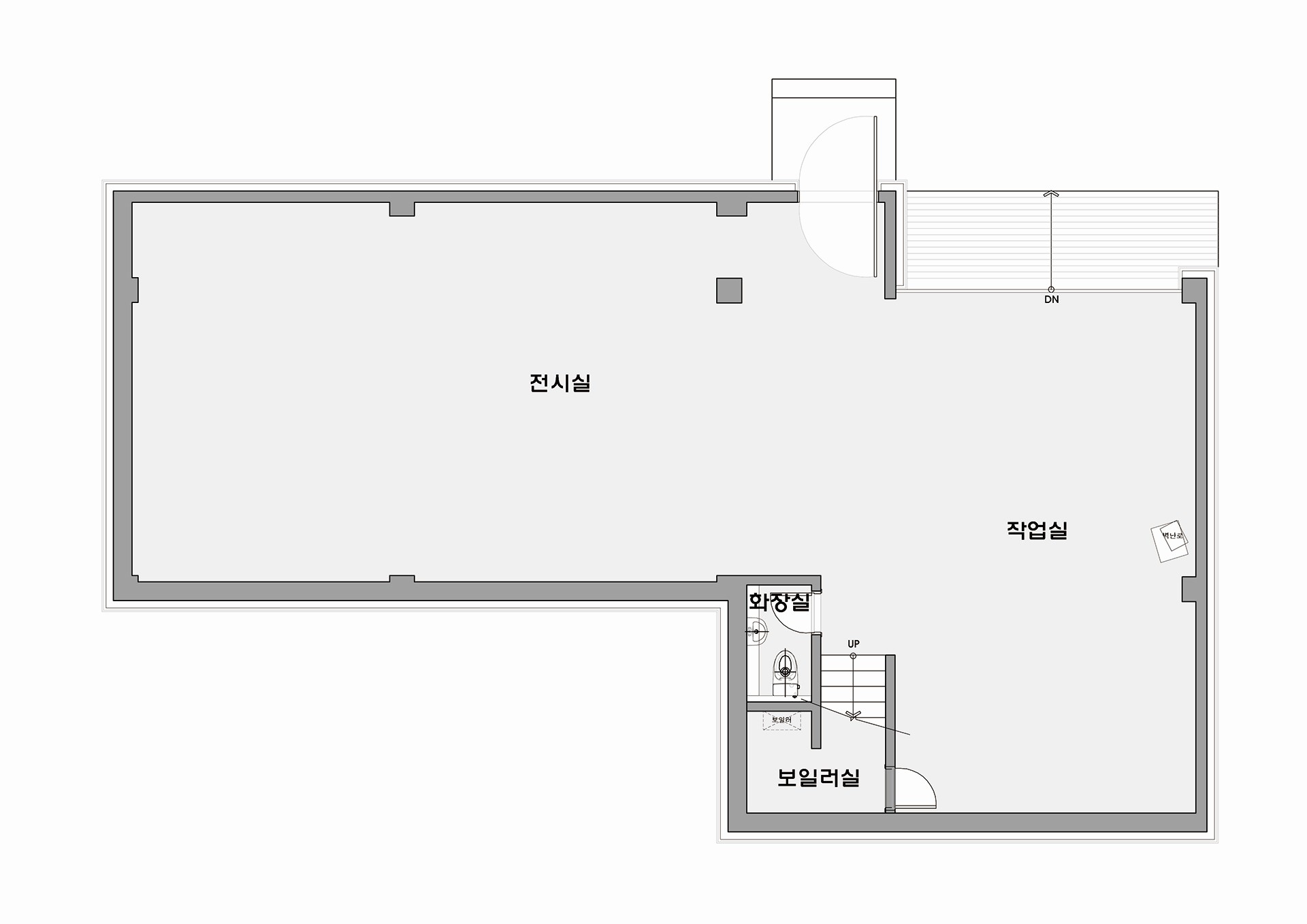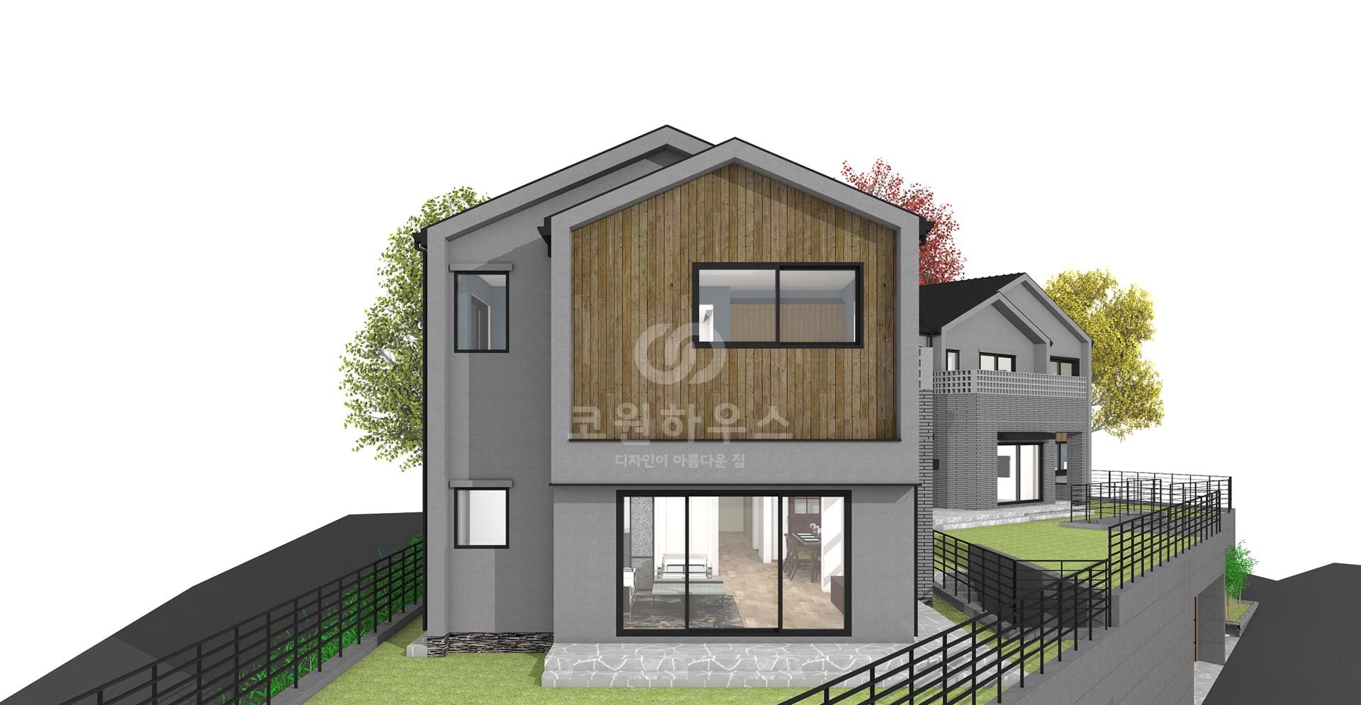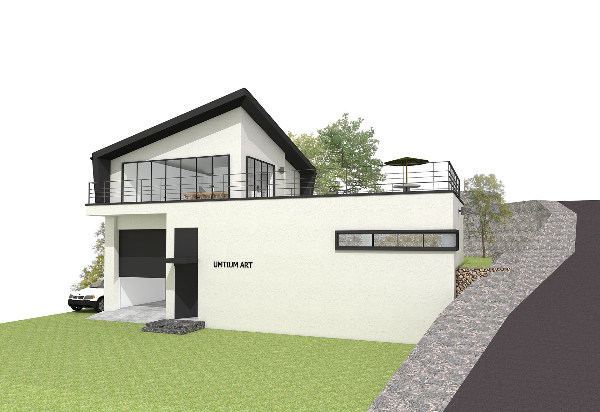 60평형 가평 삼회리|두개의 메스를 조화롭게 구성하고 경사대지를 적절히 활용한 모던갤러리 조각가인 건축주를 위해 1층에는 높은 천정고의 갤러리 + 작업 공간을 구성하고 2층에는 건축주가 힘든 작업을 마치고 쉴 수 있는 휴식 공간과 사무 공간을 배치 하였다. 화려한 색의 조각 작품이 돋보일 수 있도록 건물의 전체적인 마감을 흰색으로 하고 검은색의 징크로 포인트를 주었다.