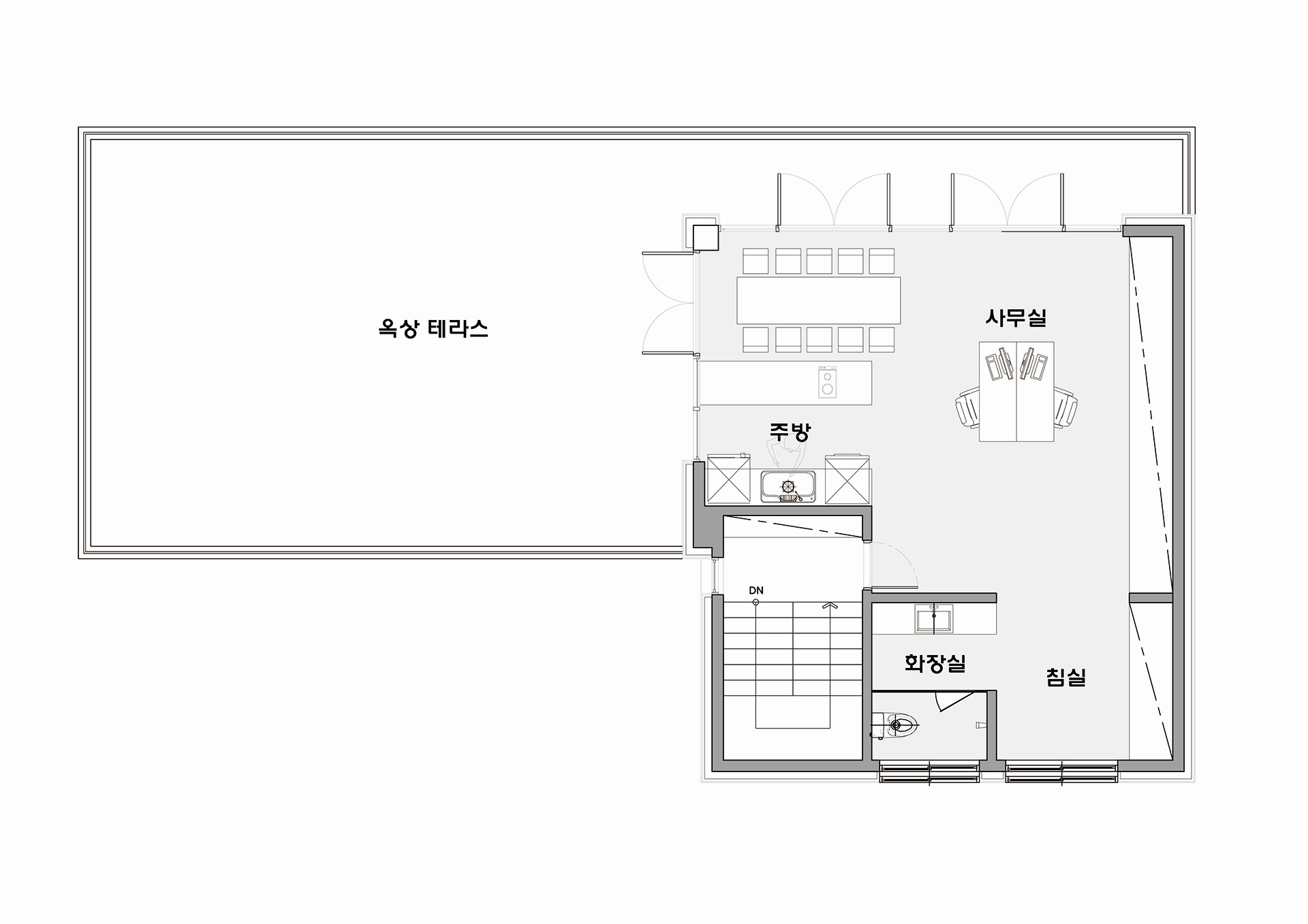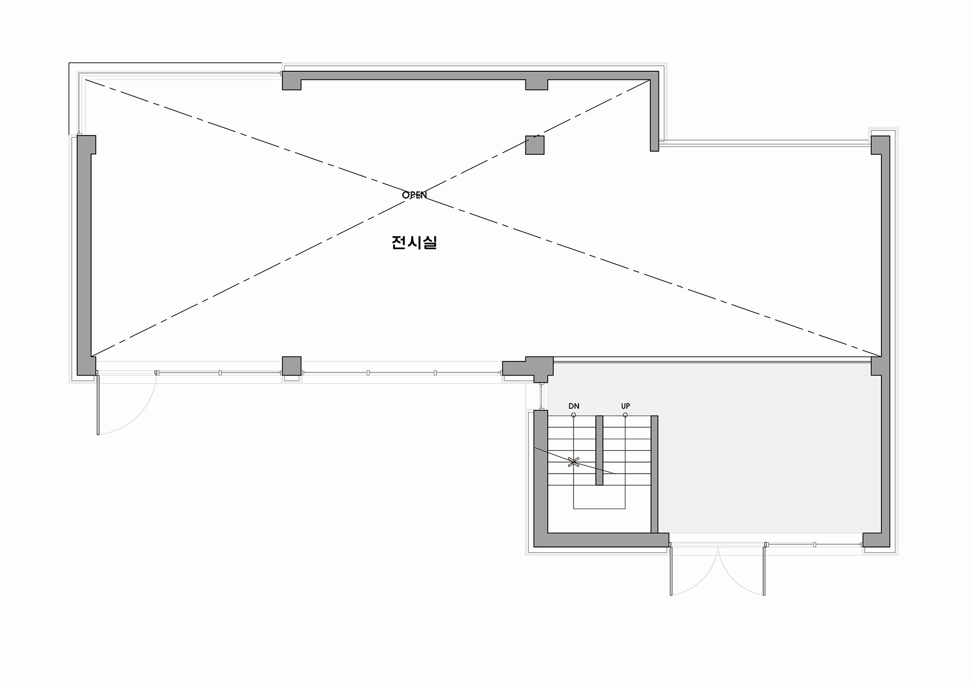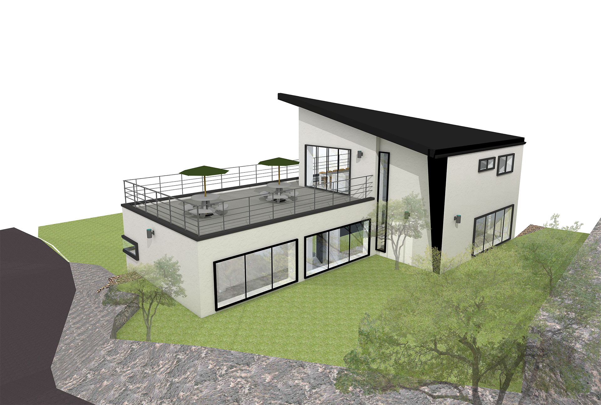 60평형 가평 삼회리|두개의 메스를 조화롭게 구성하고 경사대지를 적절히 활용한 모던갤러리 조각가인 건축주를 위해 1층에는 높은 천정고의 갤러리 + 작업 공간을 구성하고 2층에는 건축주가 힘든 작업을 마치고 쉴 수 있는 휴식 공간과 사무 공간을 배치 하였다. 화려한 색의 조각 작품이 돋보일 수 있도록 건물의 전체적인 마감을 흰색으로 하고 검은색의 징크로 포인트를 주었다.