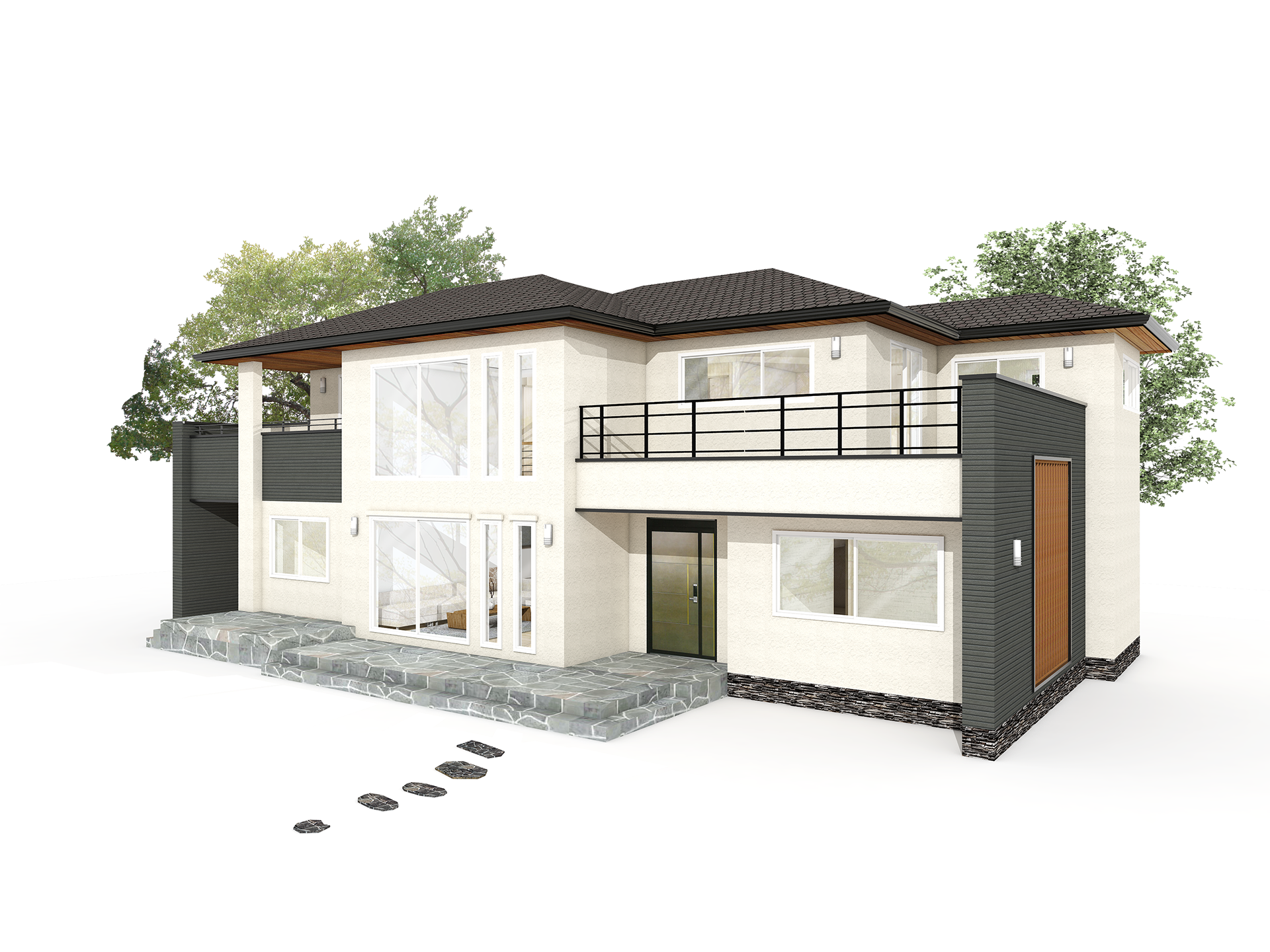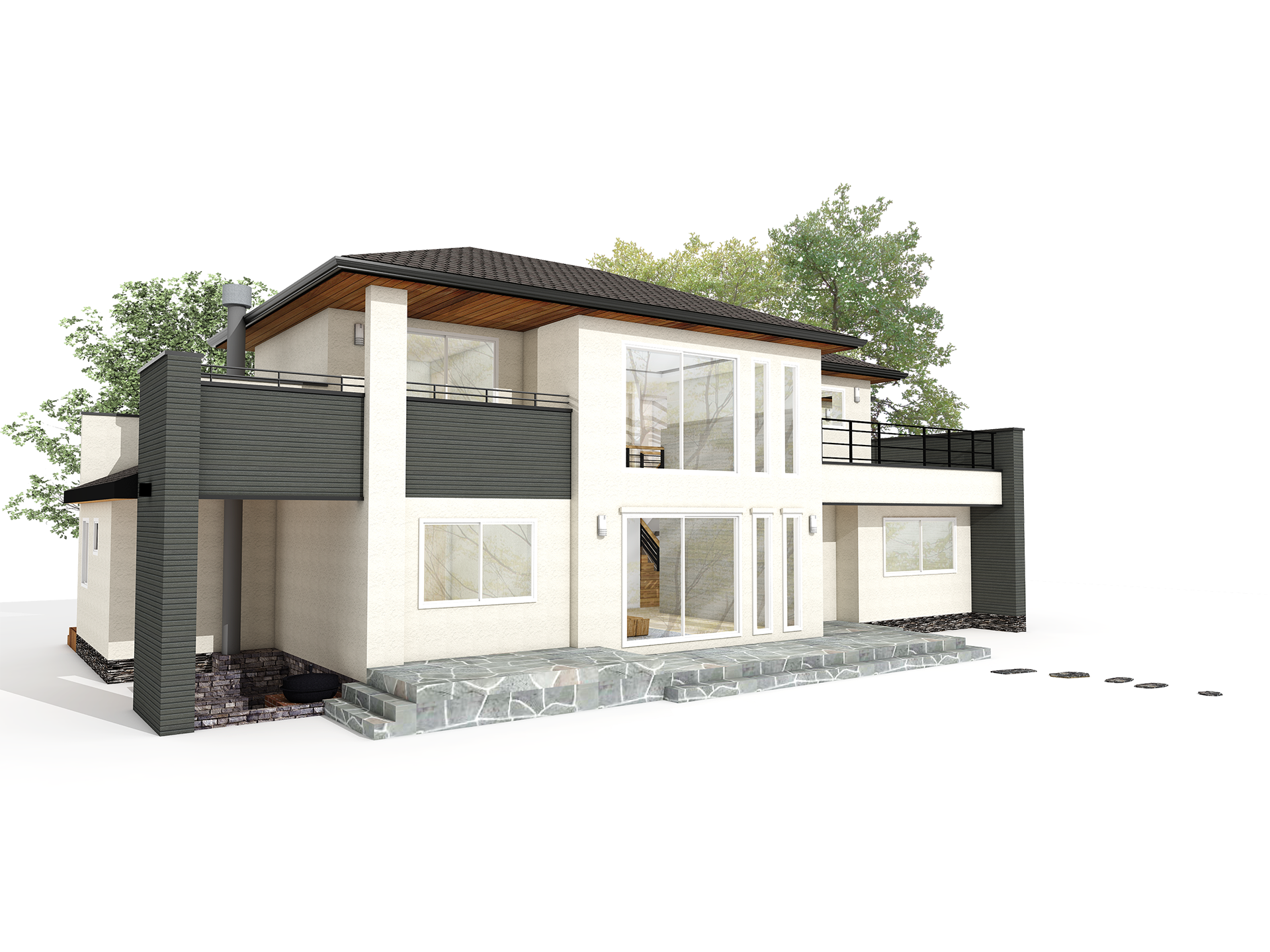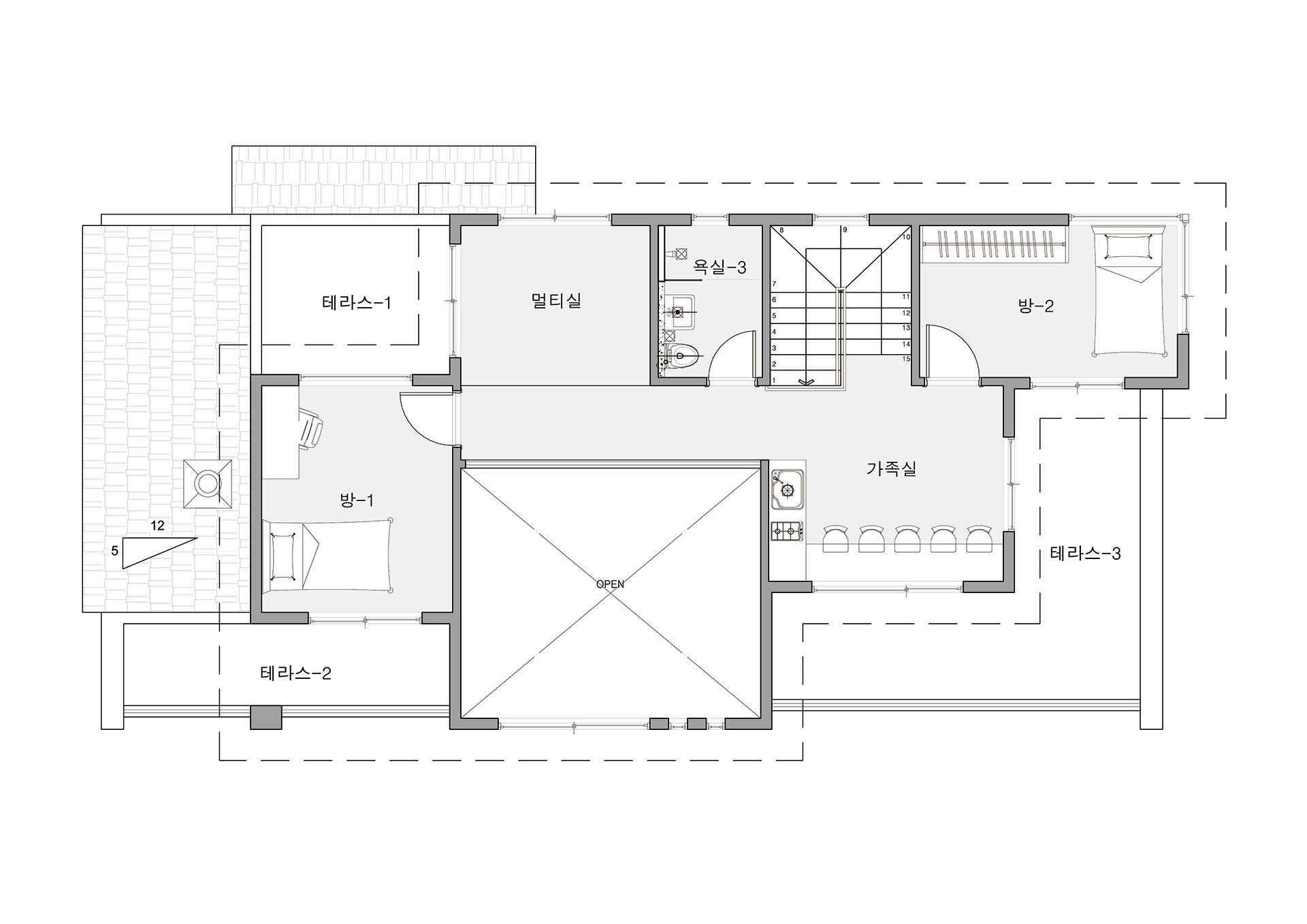 전체적으로 1층에 무게감을 심어주기 위해 2층의 볼륨을 작게하여 구성하였고, 볼륨감의 차이로 만들어진 테라스를 적극 이용한 설계이다.