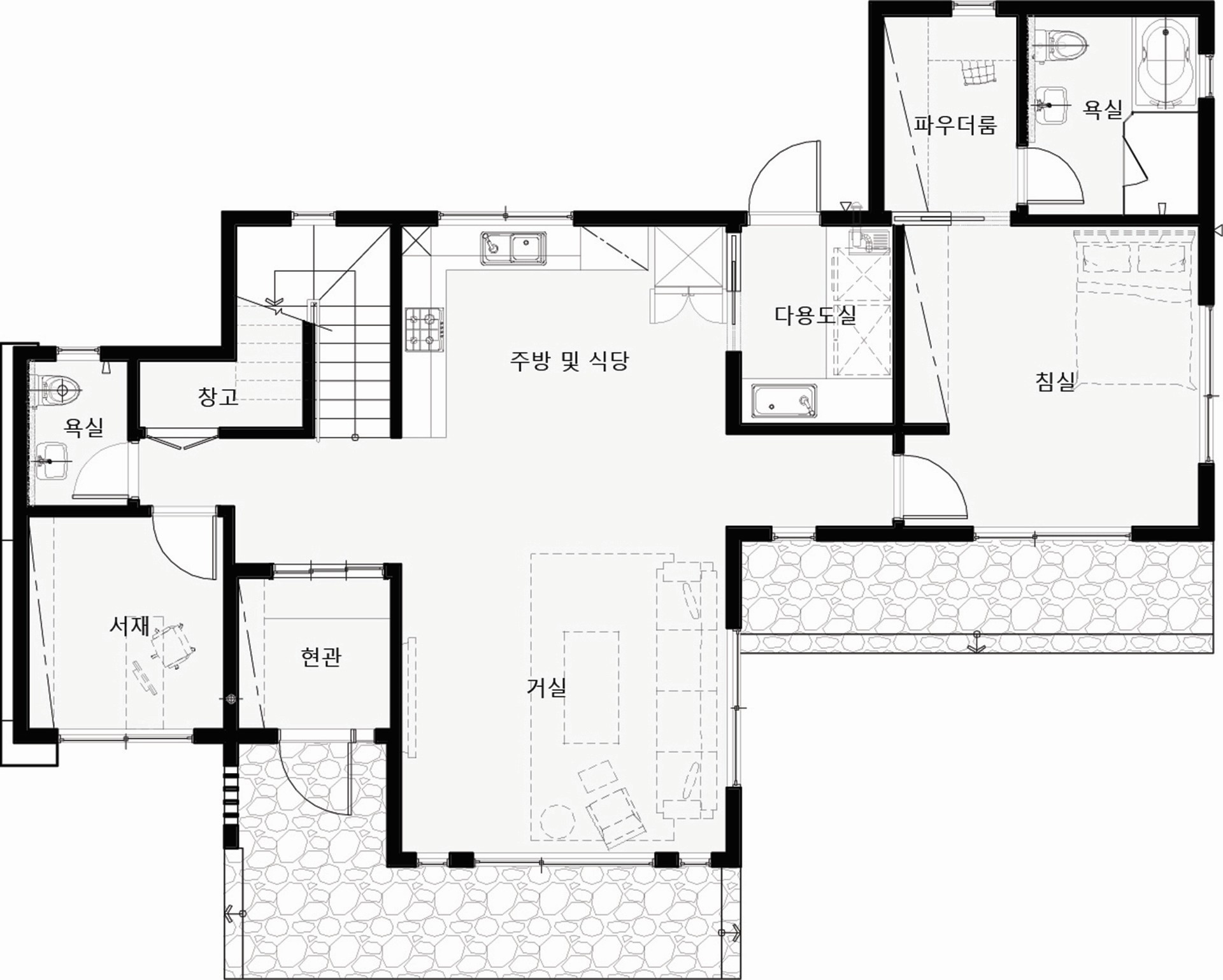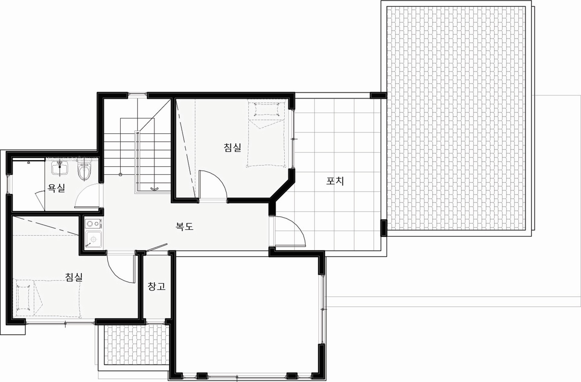 52평형 안산 대부북동|전체적으로 무채색계열의 서로다른 재질감을 가진 외장재를 적용한 클래식 스타일. 전체적으로 밝은 계통의 스타코에 어두운 세라믹타일과 회색의 스타코로 무게감있게 건물을 지지하고 있다. 1층은 거실, 주방, 서재와 부부의 공간으로 구성되어있고, 2층에 자녀들의 방과 포치로 구성되어있다. 채광방향과 바다로의 조망권이 서로 달라 거실과 안방에 두방향으로 창을내어 조망과 채광을 할 수 있도록 하였다.