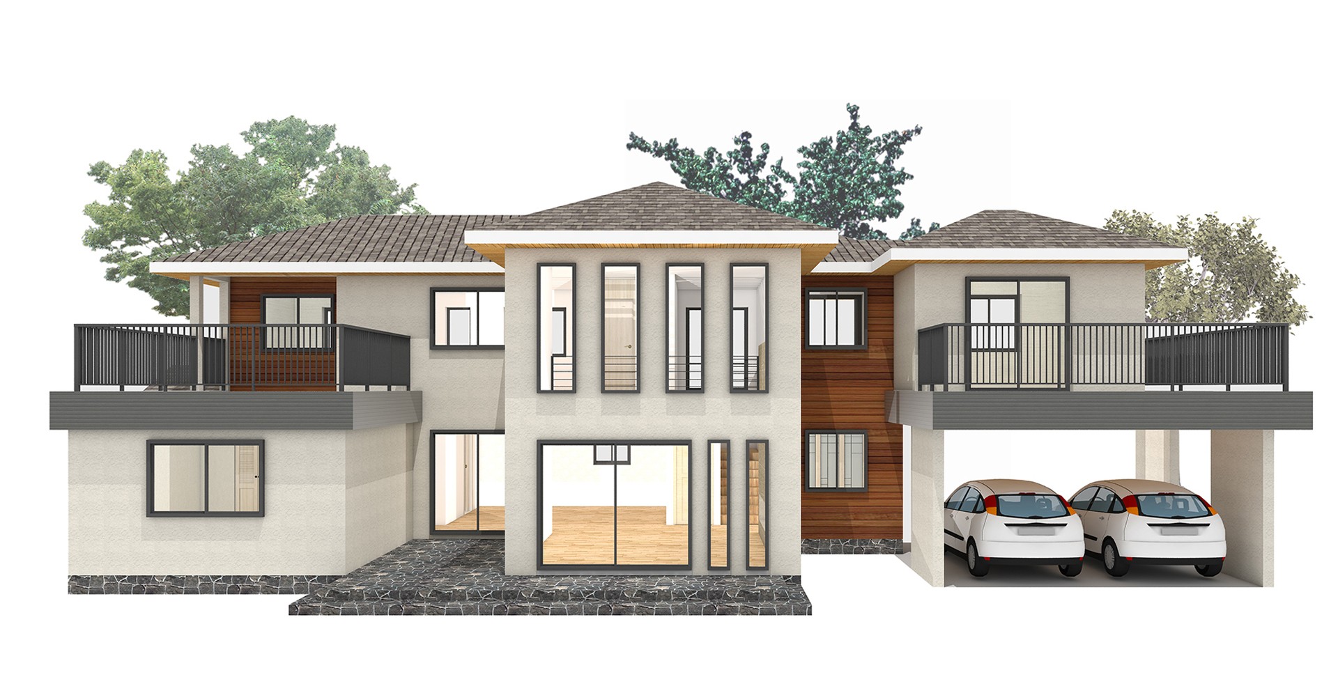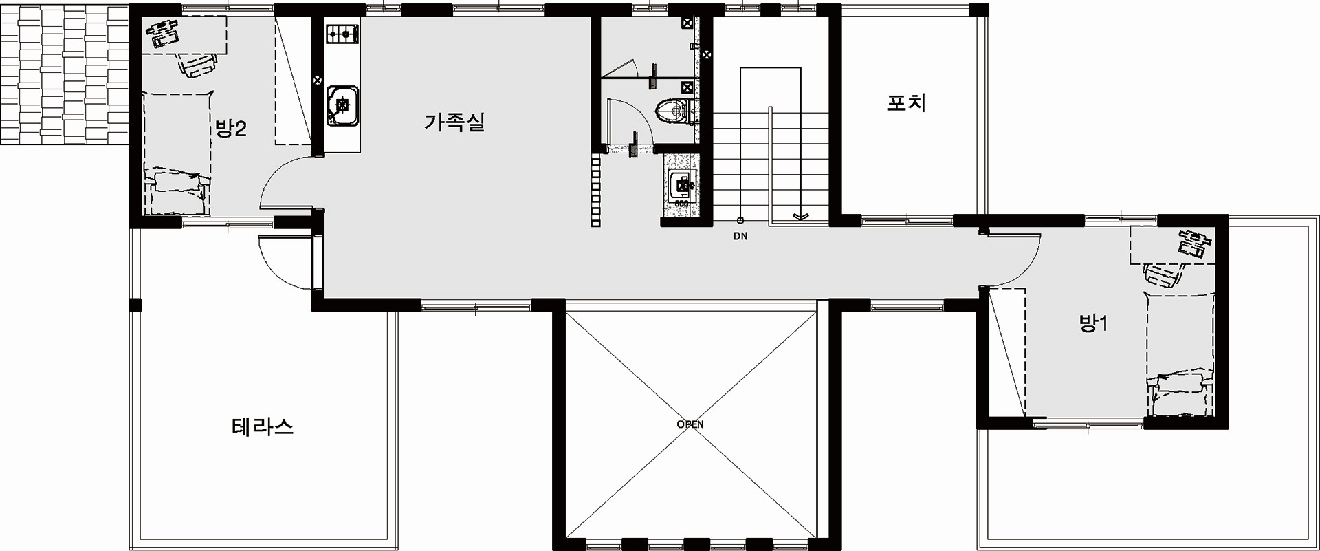 가운데는 거실천정을 오픈한 큰매스로 두었고,양측매스 상부는 전면에 외부공간으로 구성한후 모임지붕을 두어 전체주택에 비례미를 두고자 하였다.
