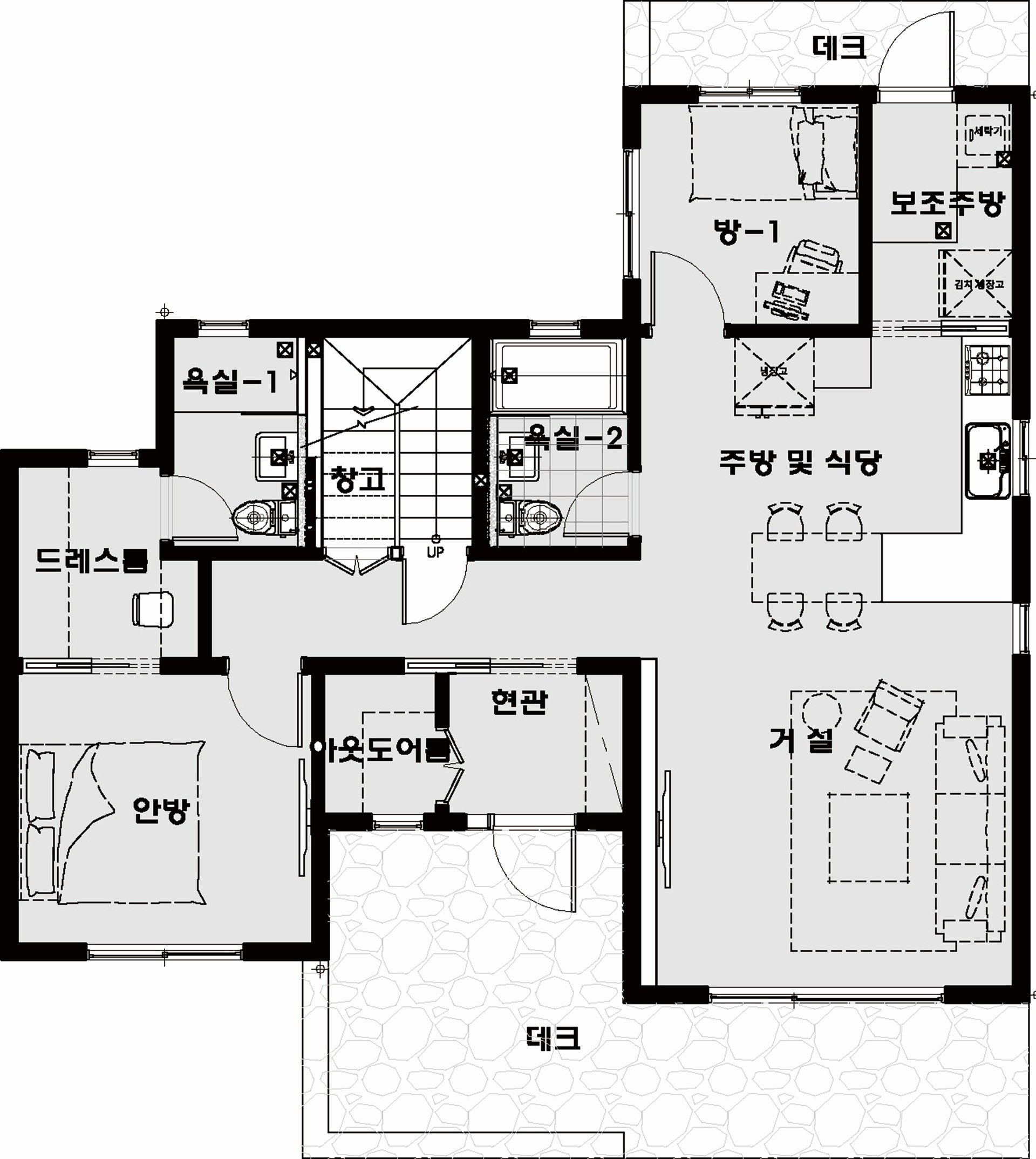다락방과 현관의 아웃도어룸으로 수납공간을 최대한 확보하였다.