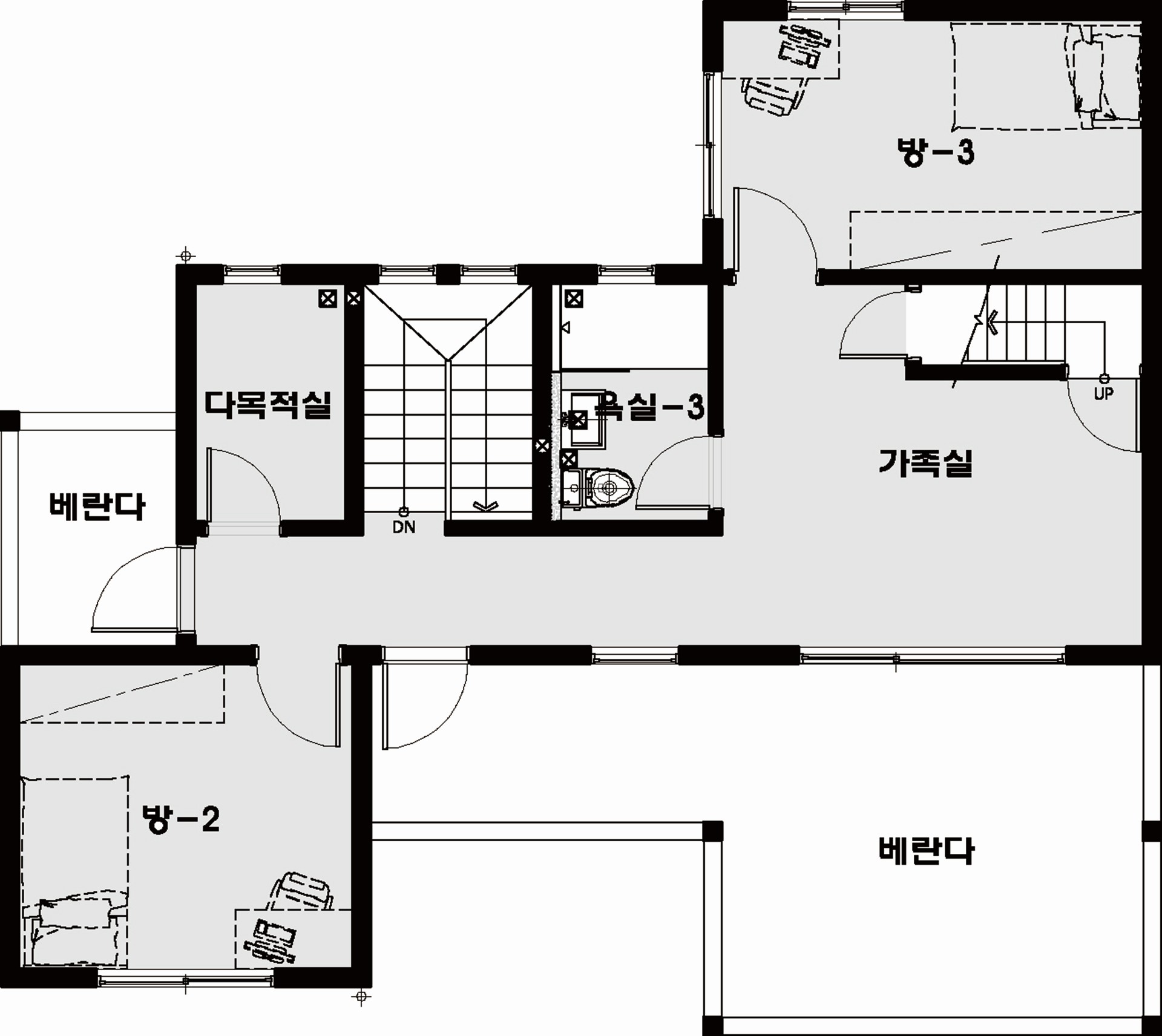 3베이 설계를 할경우 각각의 실이 너무 좁게나와 과감히 2베이를 선택하고 후면을 활용하는 설계를하여 각실의 크기를 확보하였고
