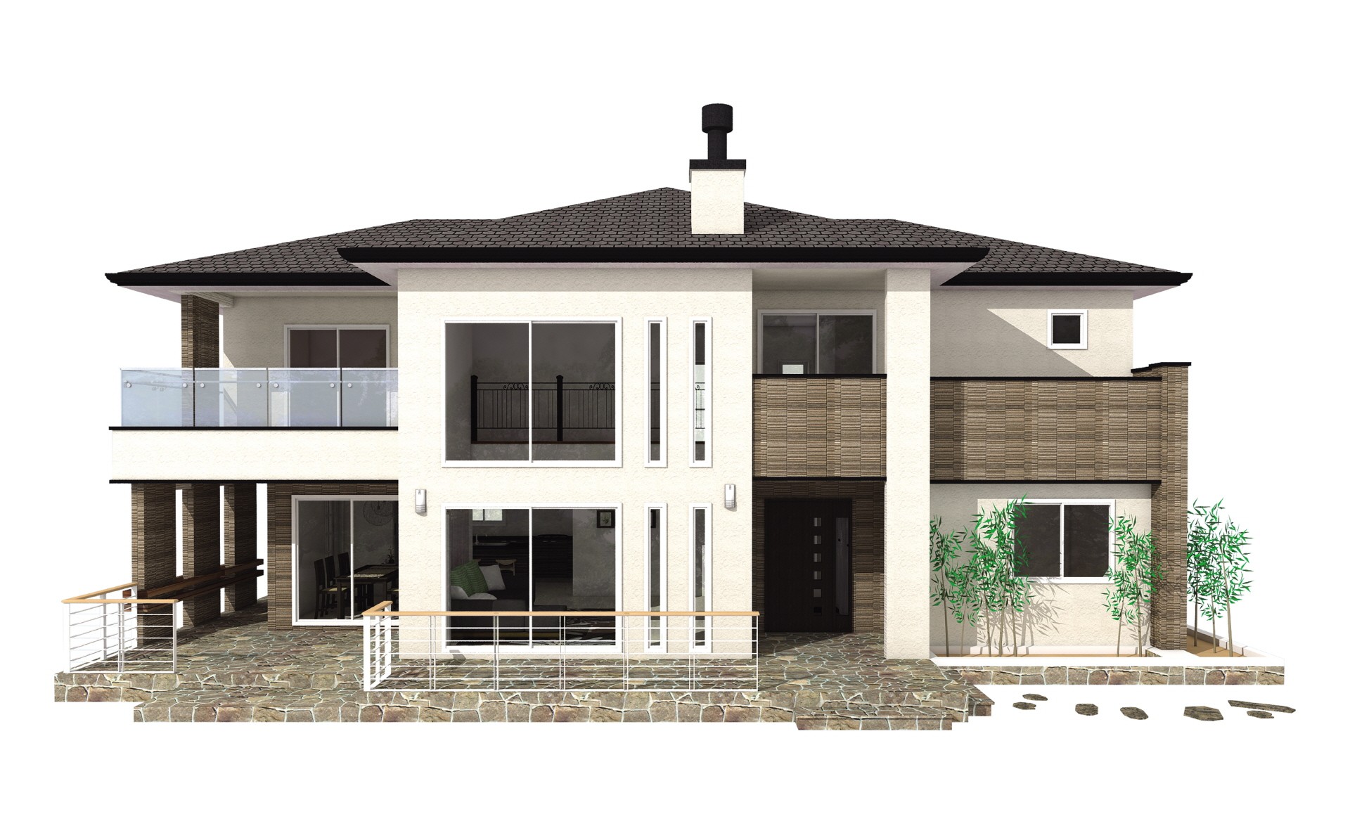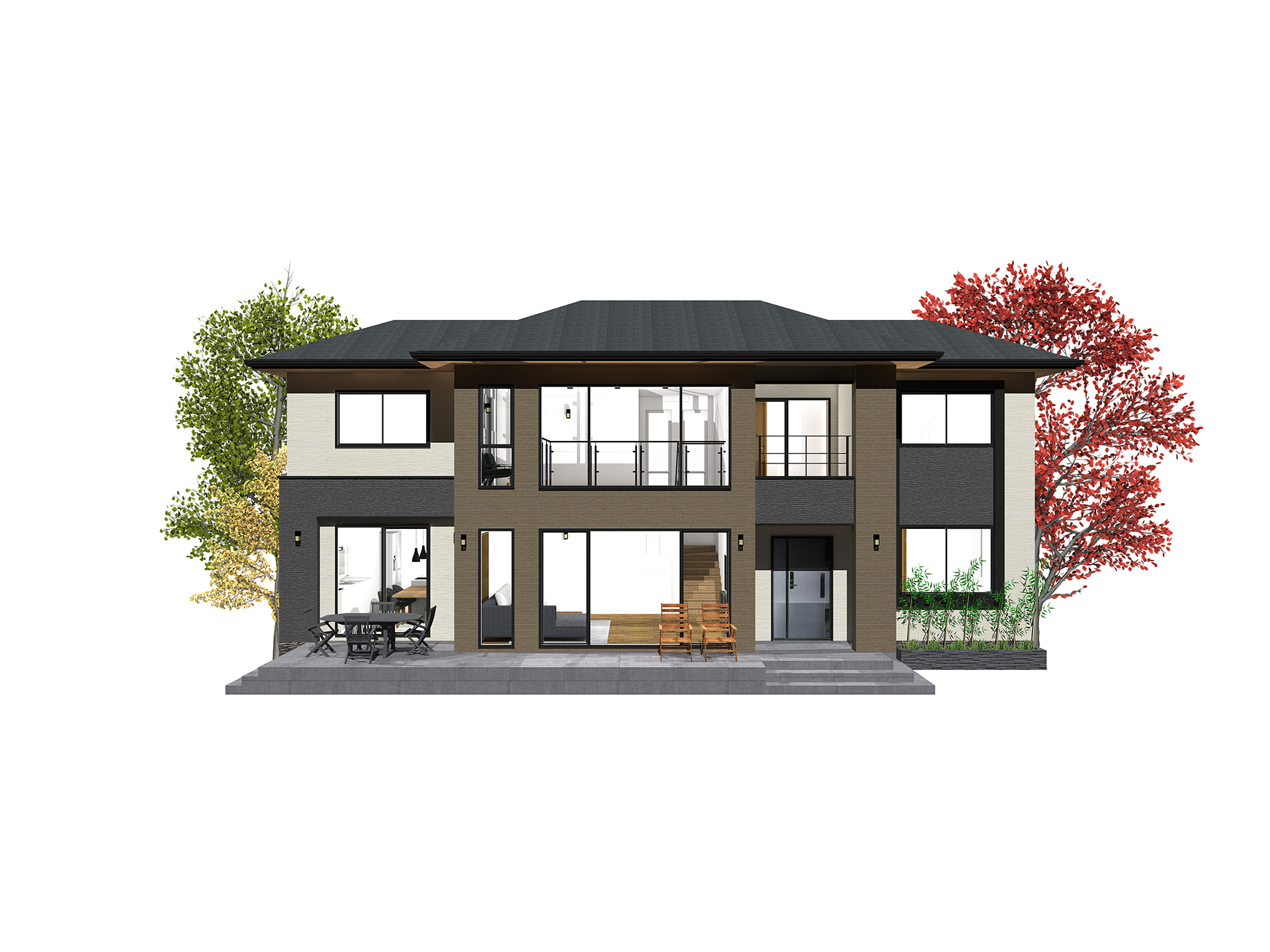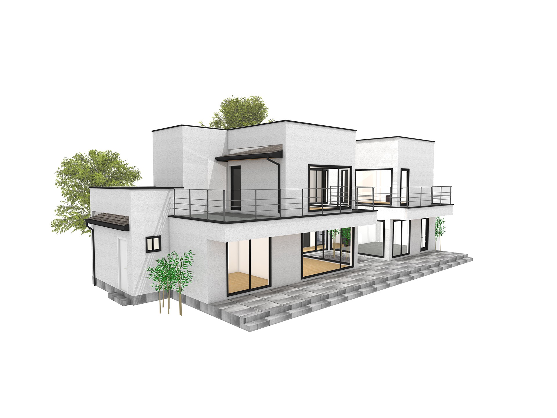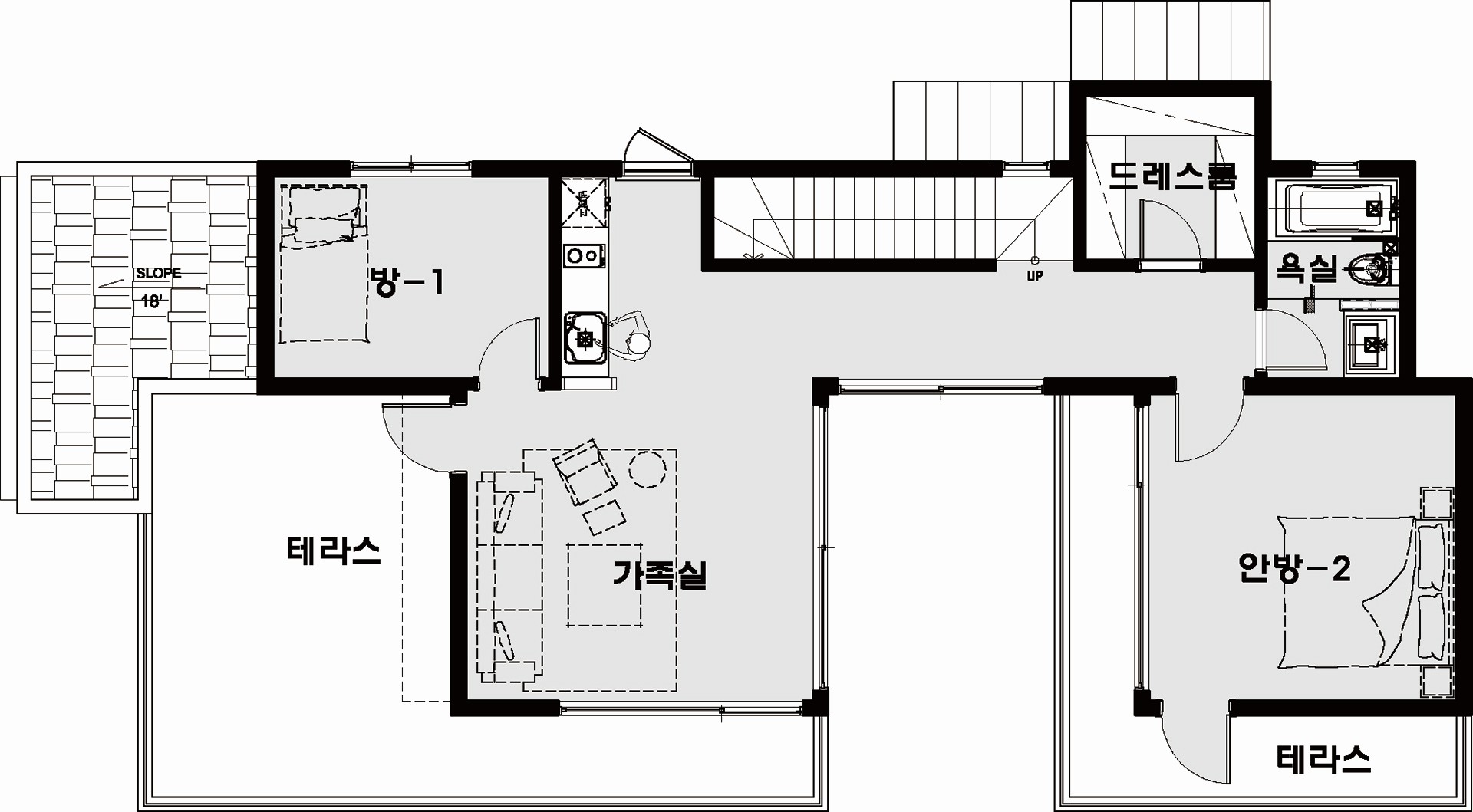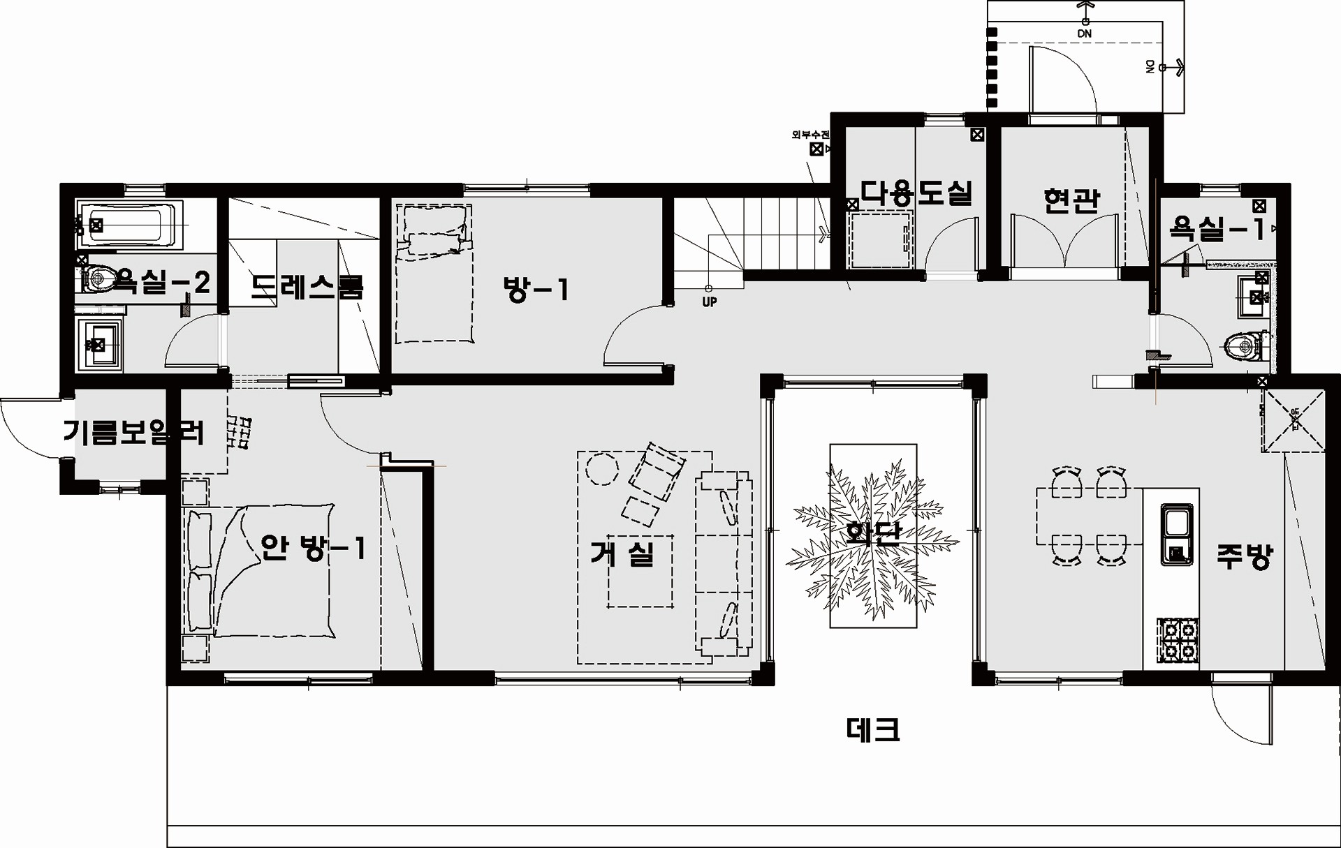 56평형 태안 방갈리|단조로운 직사각형 평면에 중정을 계획함으로써 프라이버시와 여유로움을 부각한 모던 스타일 주택 1층의 주방, 식당, 그리고 거실은 중정과 데크쪽으로 완전히 개방된 구조로 디자인하였고, 가족이 모여 의사소통을 할 수 있는 거실과 가족실은 넉넉하게 계획하여 자연광을 충분히 받아 밝은 분위기 연출이 가능하도록 하였다.