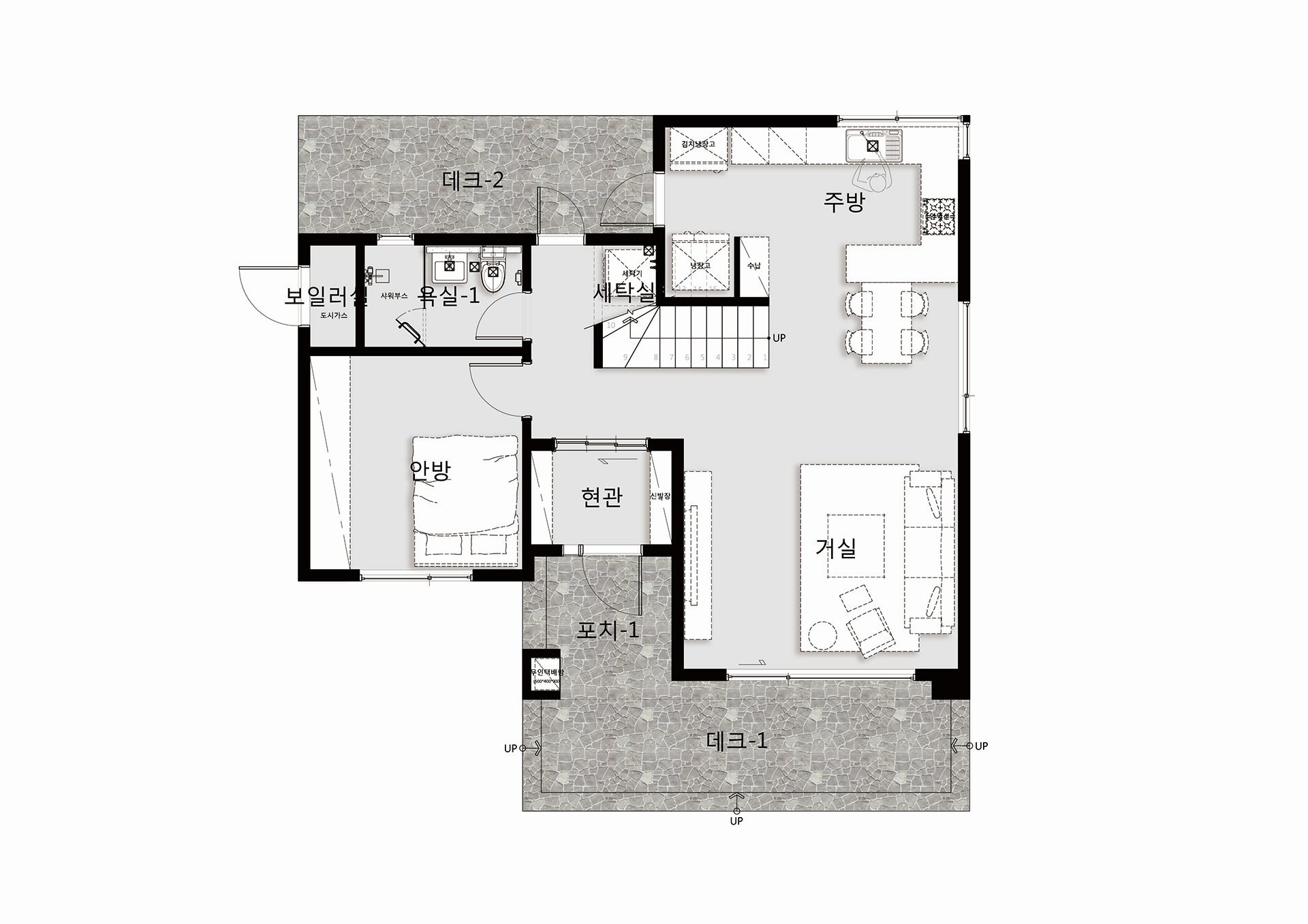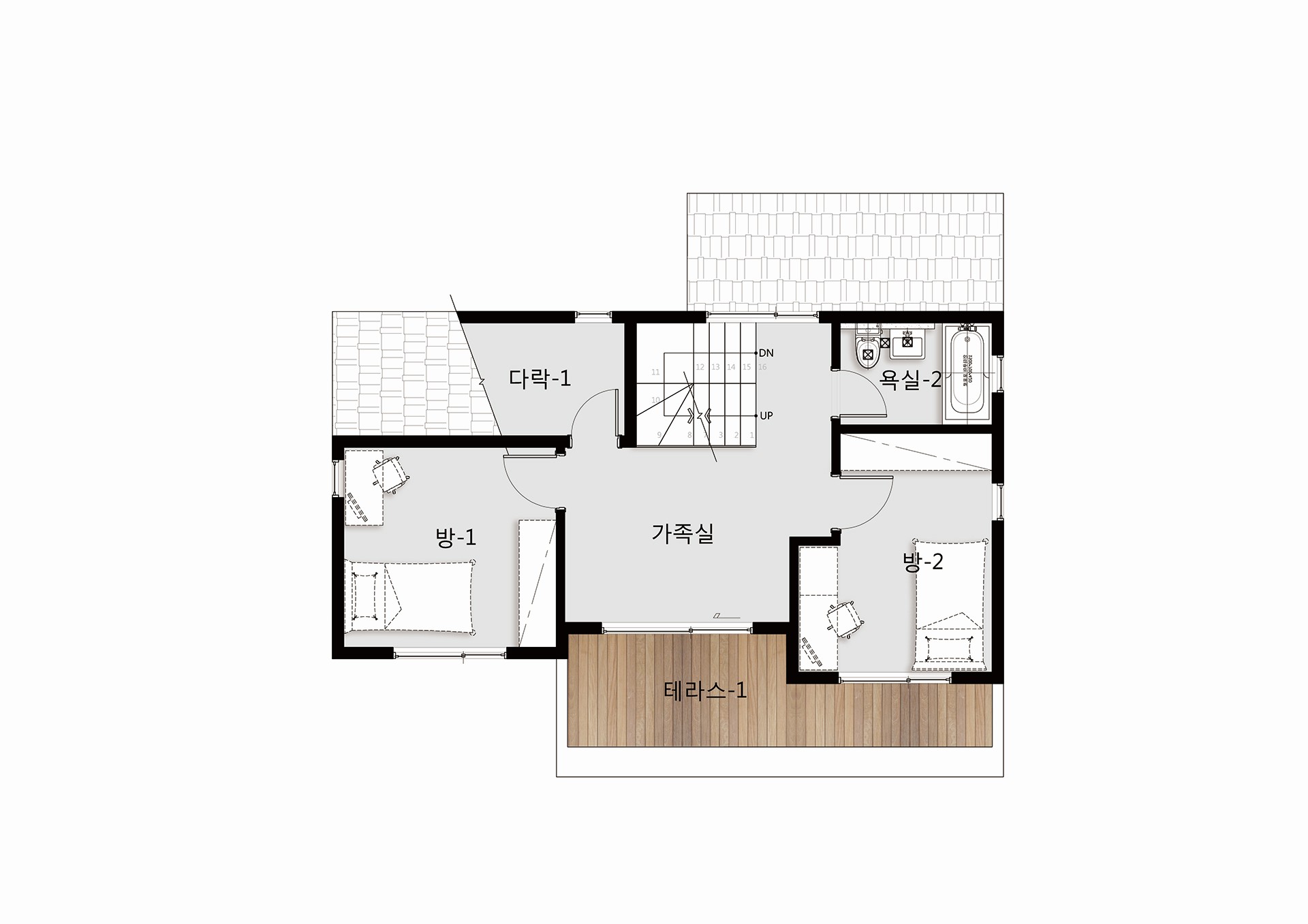 38평형 김포단지 (B-TYPE)|B블럭 - 일본식의 다락이 있는 도심형 전원주택 1층 안방과 공용공간인 화장실과 세탁실과 주방 및 뒷데크까지 짧은 동선으로 순환될수 있는 구조로 주부의 동선을 고려안 설계안을 계획하였고, 지붕의 경사각을 이용하여 자연스러운 다락공간을 확보해 공간활용이 돋보일수 있도록 하였다.