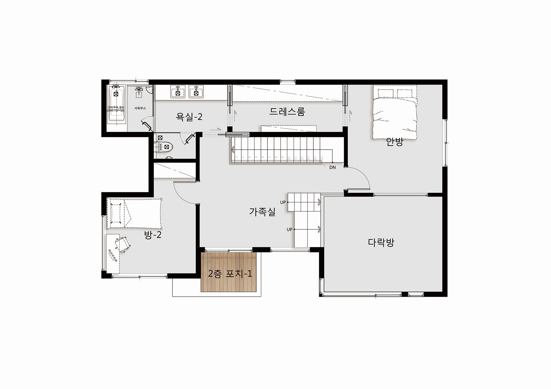 거실 상부 2층에는 다락방이 있어 전원주택에서 다락방의 매력적인 공간으로 사용할 수 있는 공간이다.