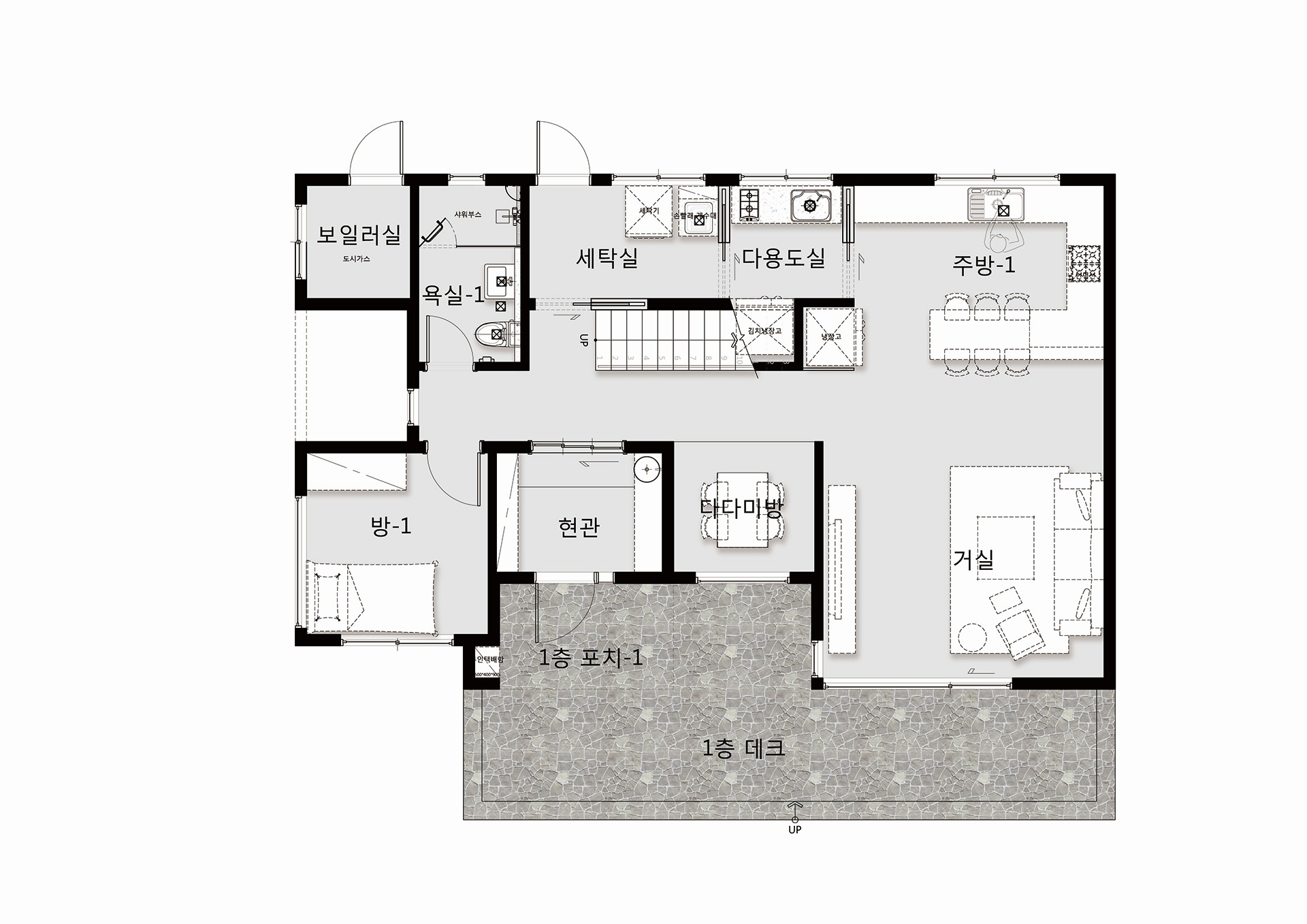 주부의 동선을 고려한 효율적인 주방 배치로 주방동선을 편리하게 이용할 수 있도록 계획하였다.