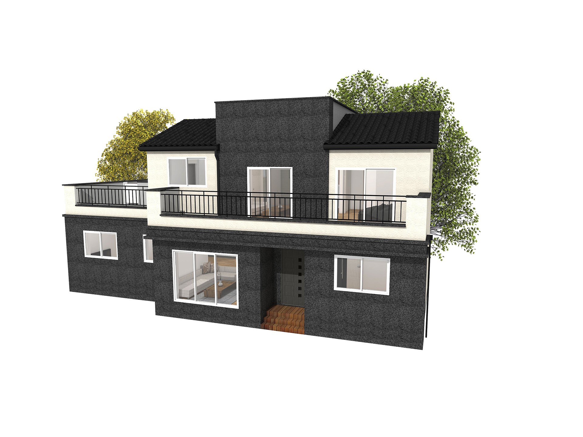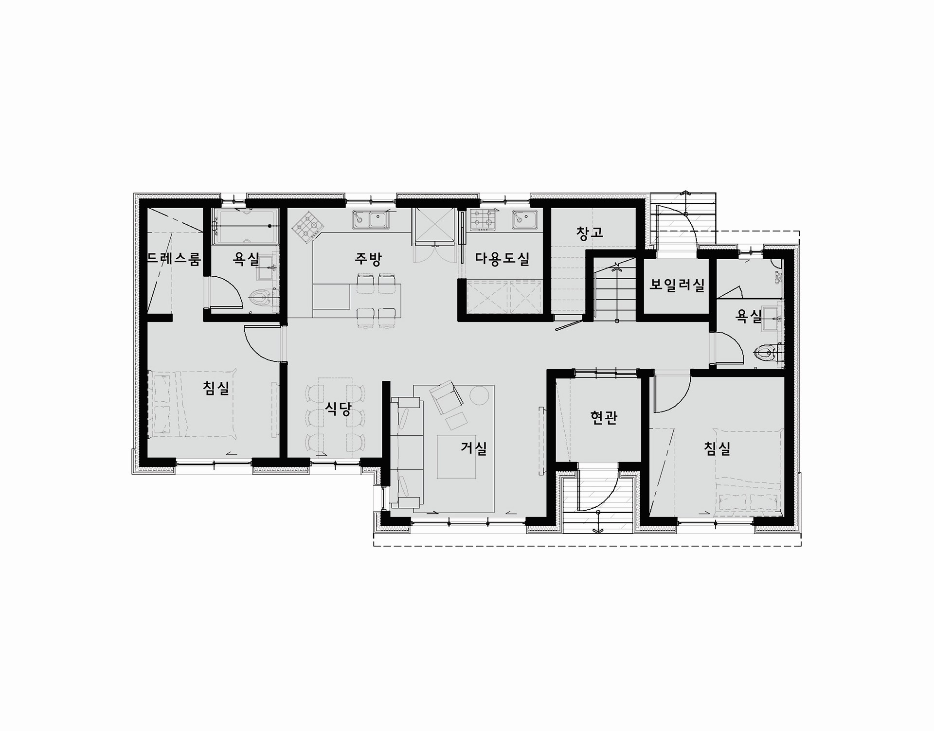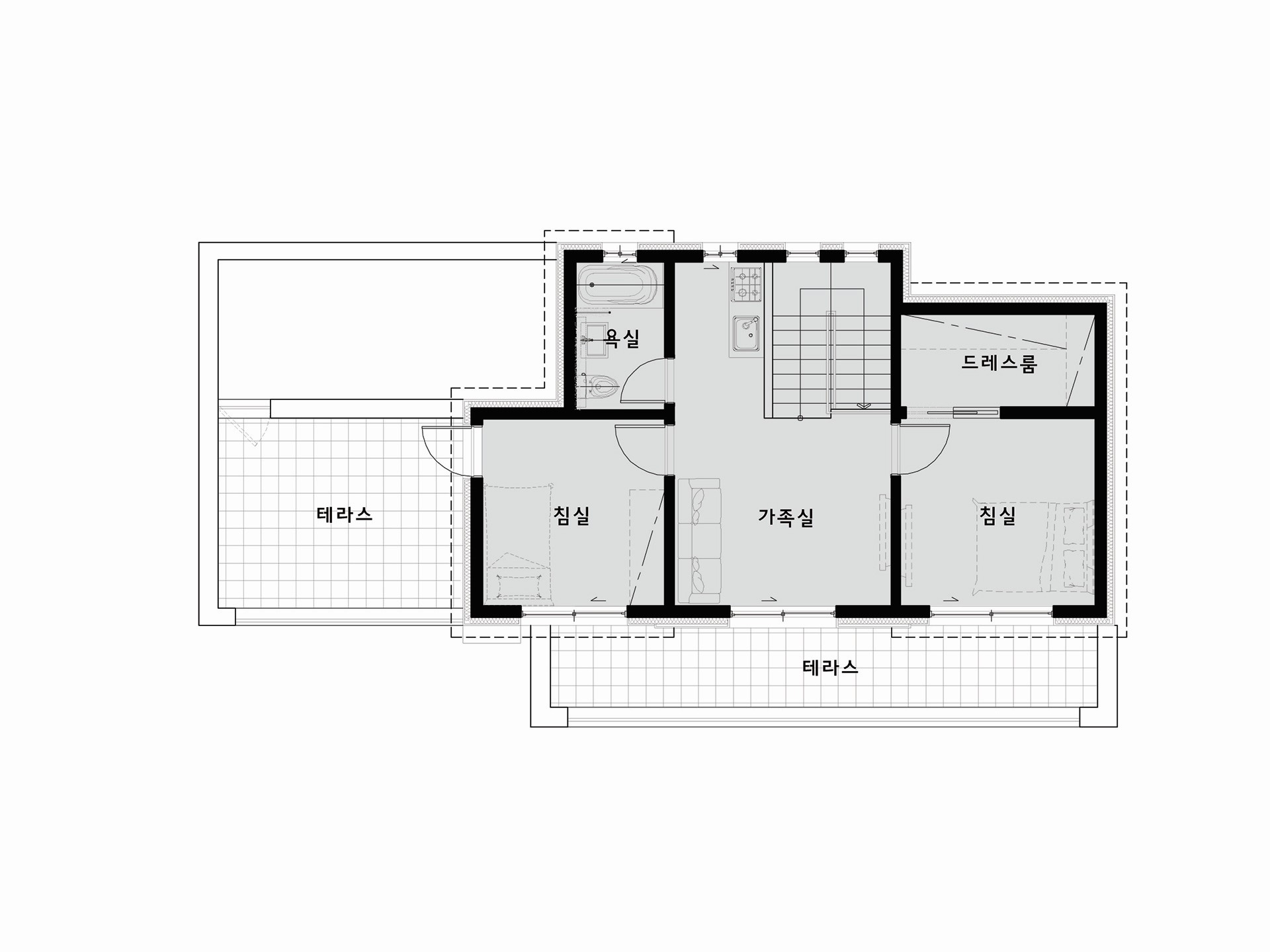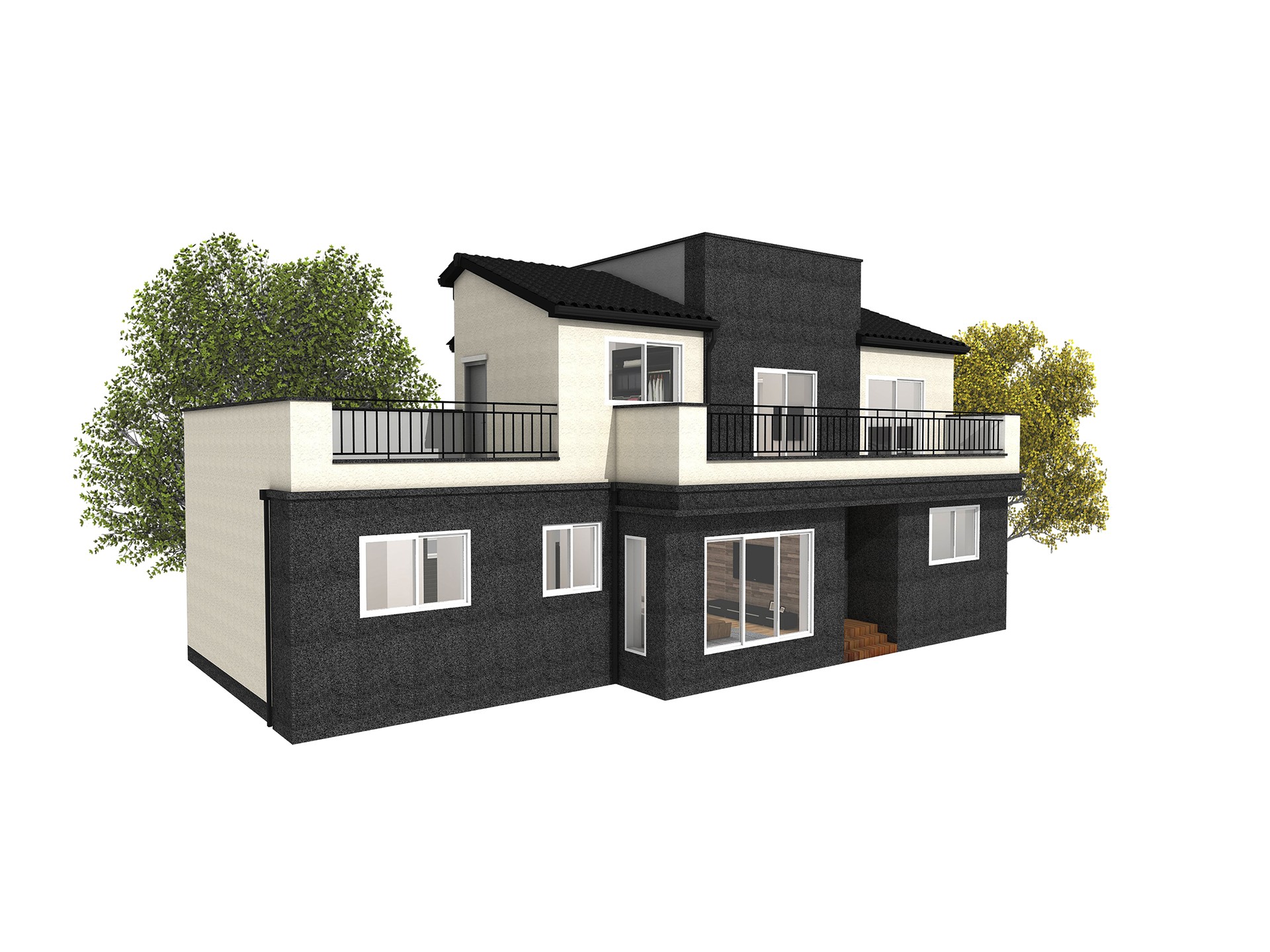 47평형 음성 병암리|블랙&화이트 계열의 화강석과 스타코를 사용하여 모던함을 베이스로 기와지붕을 통한 클래식한 느낌을 더한 디자인 연세가 많으신 부모님을 모시고 사시는 건축주 가족의 집으로서 기본 계획을 잡고 설계되었다. 거동이 불편하셔 여러가지 손잡이와 노인을 배려하기 위한 장치를 마련하였고, 2층은 부부의 공간으로서 가족의 테라스 공간과 부부의 테라스 공간을 별도로 사용할 수 있도록 설계하였다.