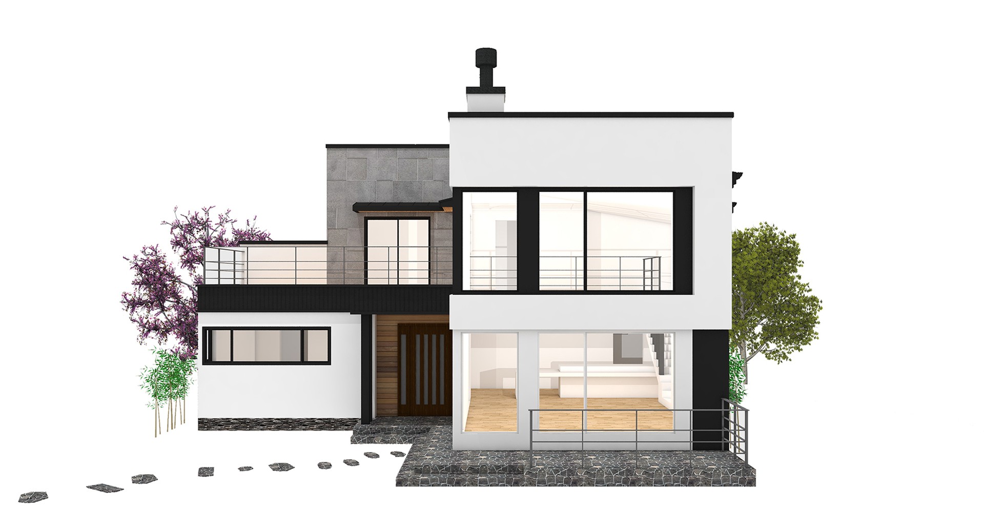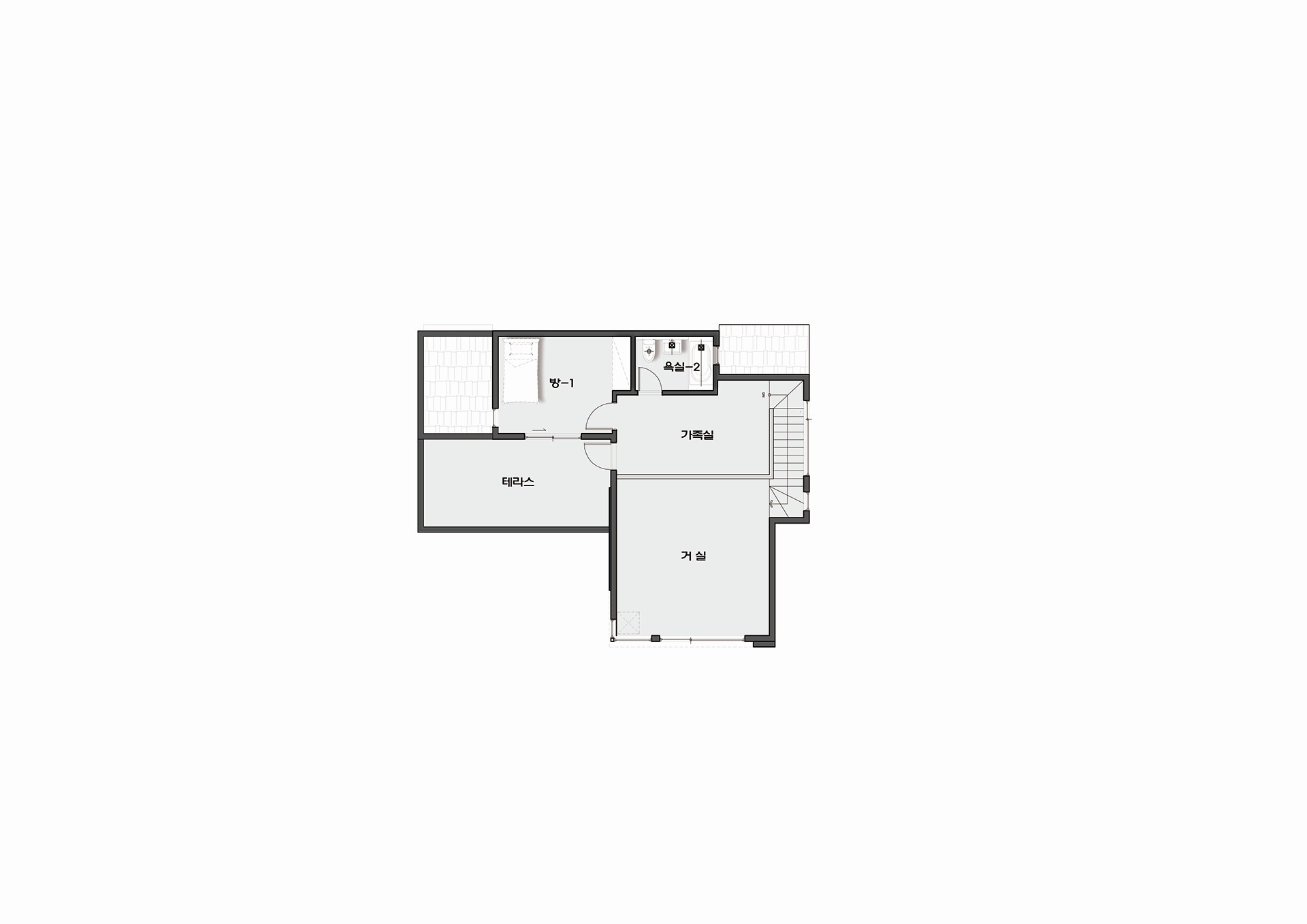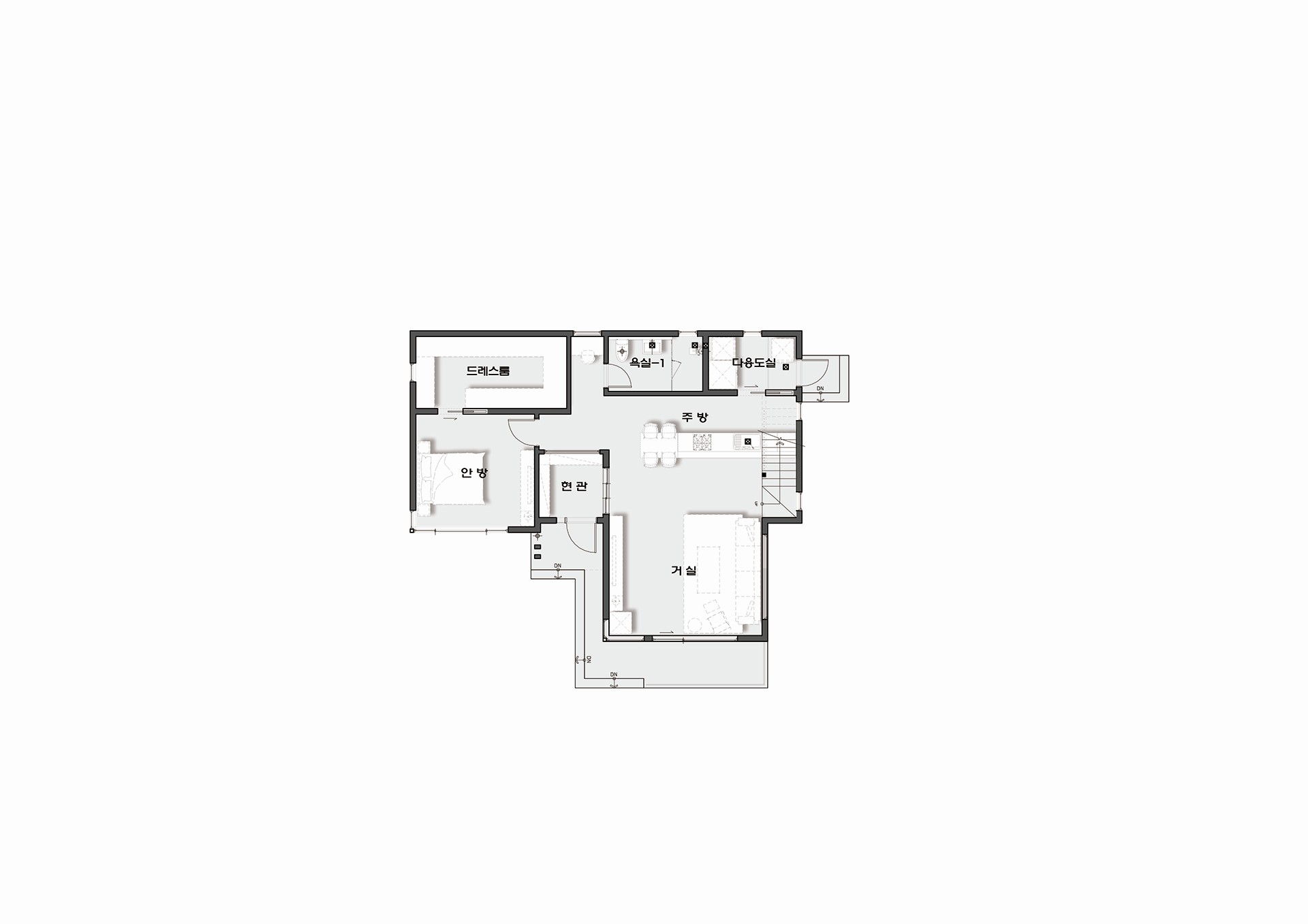 49평형 경산 울옥리|블랙&화이트 계열의 화강석과 스타코를 사용하여 모던함을 베이스로 현관문쪽 중심부에 따뜻한 느낌의 합성목재를 사용한 모던주택 현관을 들어가면 넓게 펼쳐지는 거실과 주방, 그리고 정면으로 보이는 일자계단을 설계하여 넓어보이는 평면을 구성하였으며, 2층의 넓은 테라스를 통해서 확 트인 경치를 구경할수 있다.