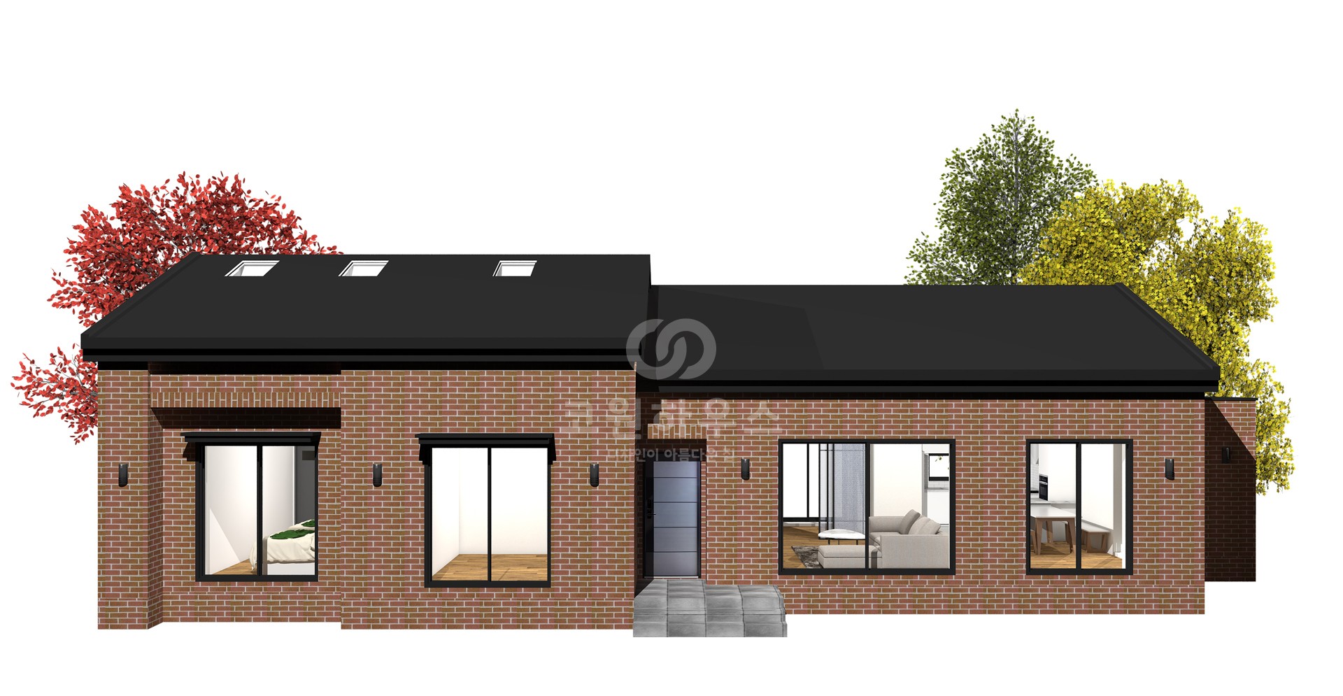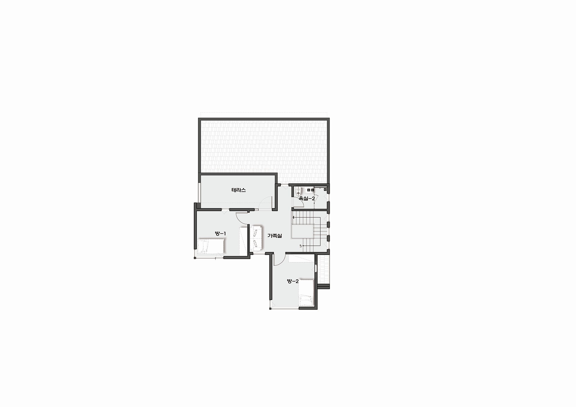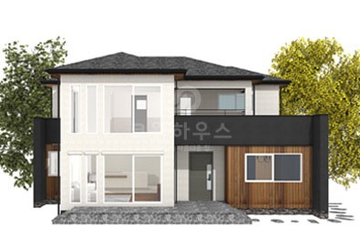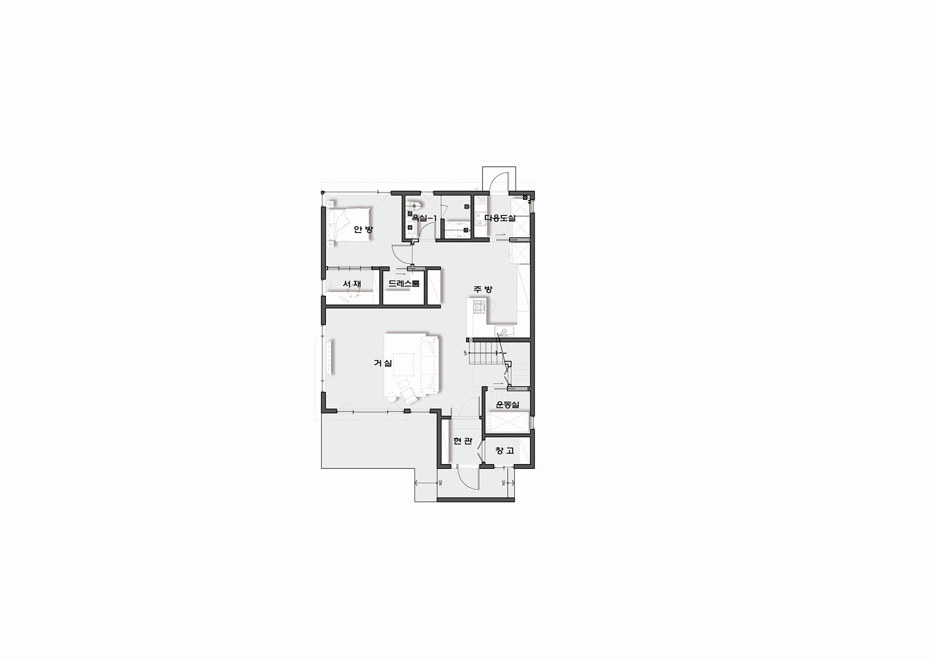 49평형 고양 성석동|투톤느낌의 모던한 박스형태에 창호로 포인트를 준 모던주택 진입로부분 현관에 조명디자인적으로 포인트를 줬으며, 프라이버시를 강조한 평면으로, 현관을 들어섰을 때 거실은 단층이지만, 오프닝 계단실을 통해 답답하지 않은 구조를 갖고 있으며 거실과, 주방은 인접하되 분리를 시켜 구성을 하였다.
