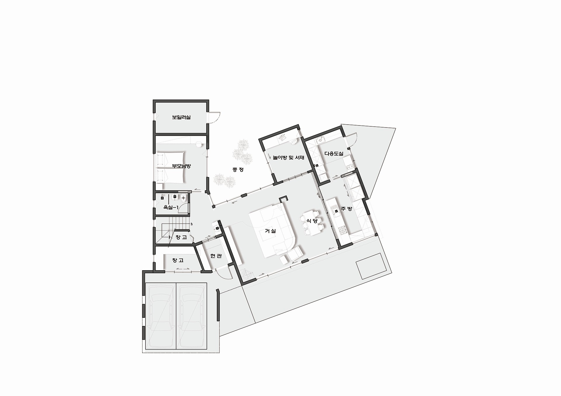 배면에 중정이 포인트인 단독주택으로써, 개인공간과 공용공간을 분리시켜 프라이버시를 확보하였으며,