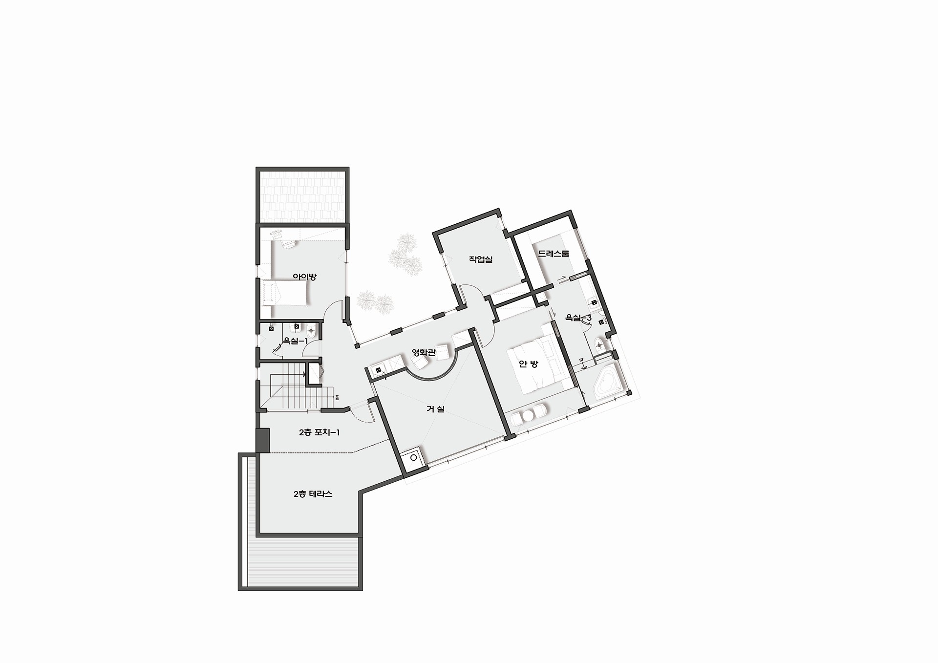 2층으로 올라가면 넓은 포치및 테라스가 있으며, 거실오픈 하이실링 부분을 활용하여 영화관을 계획하였다.