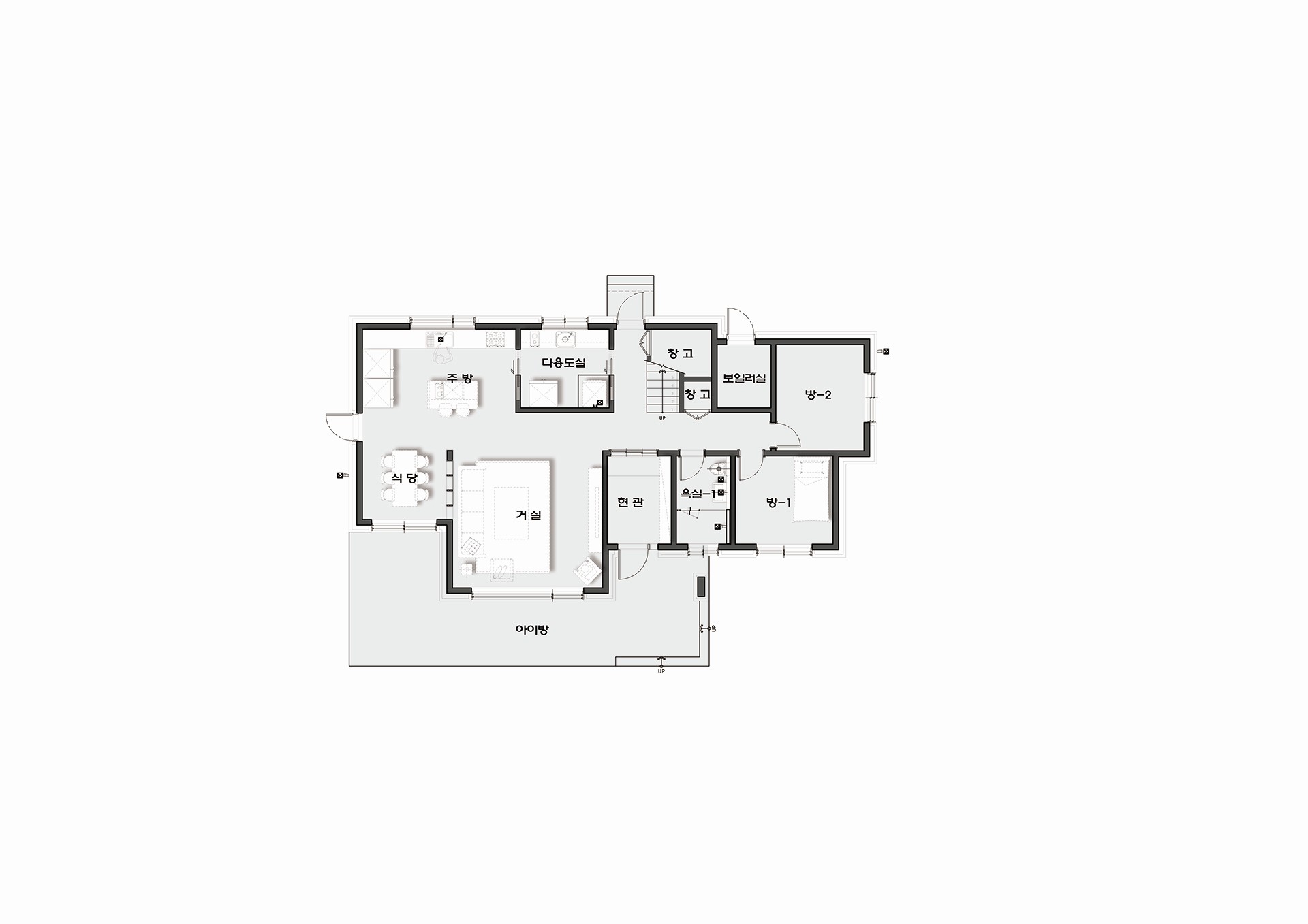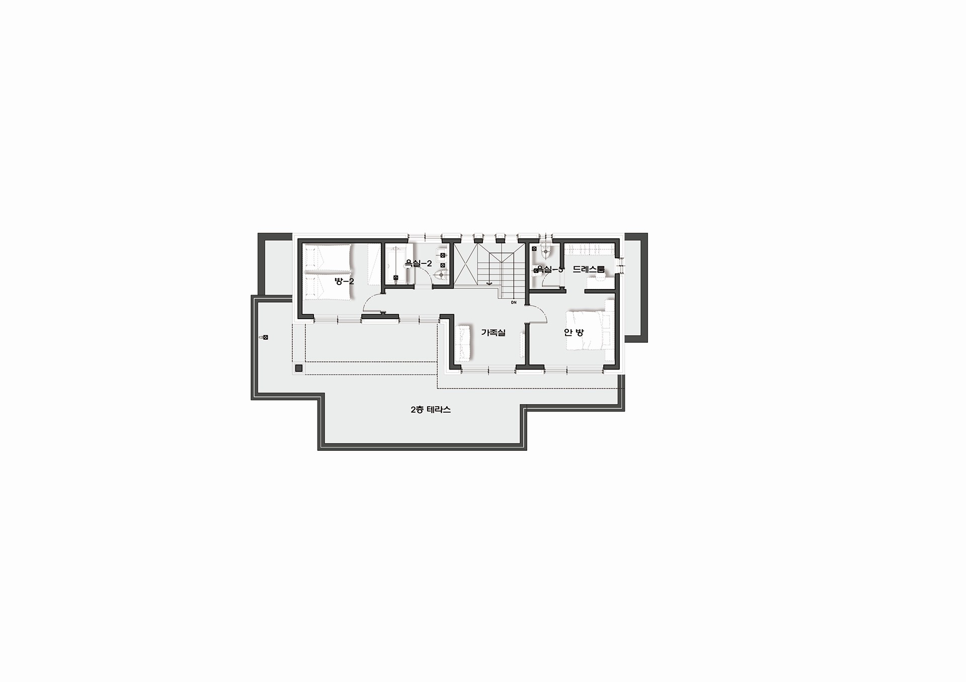 현관을 기점으로 공용공간, 개인공간이 불리된 프라이버시가 확보된 평면으로써 2층의 넓은 테라스가 인상적이다.