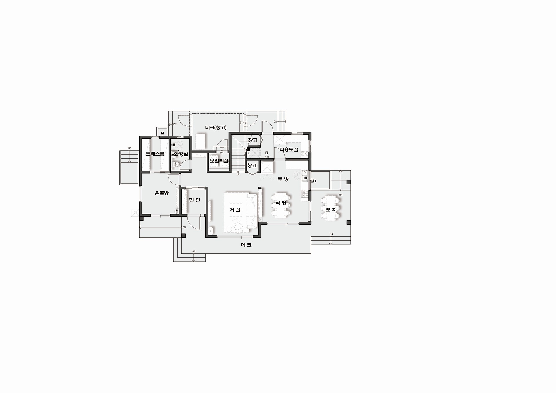 주방과 연계된 외부 포치를 넓게 하여 언제든 외부에서 식사와 휴식을 할 수 있도록 하였다.