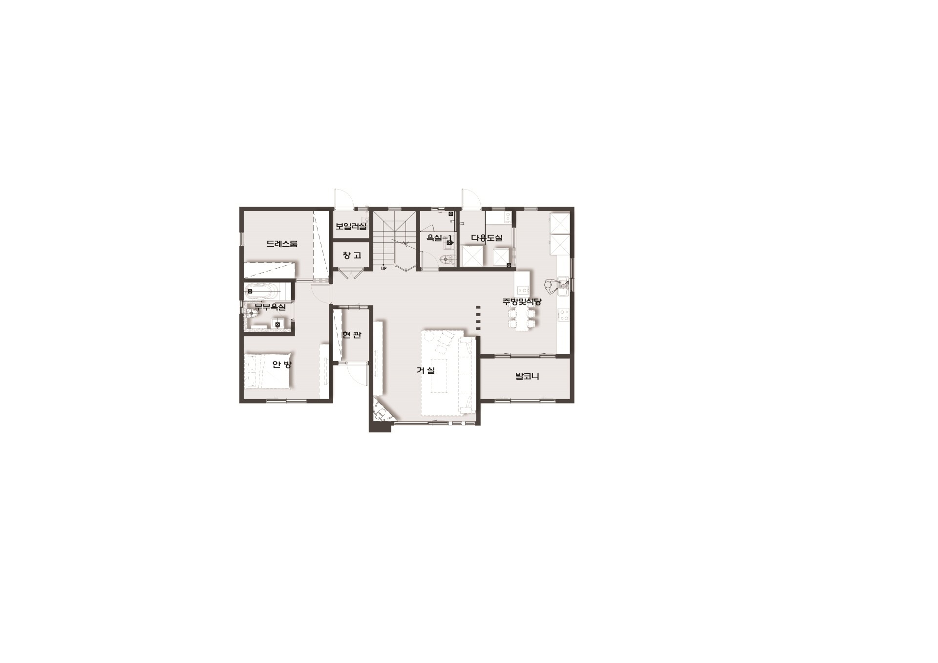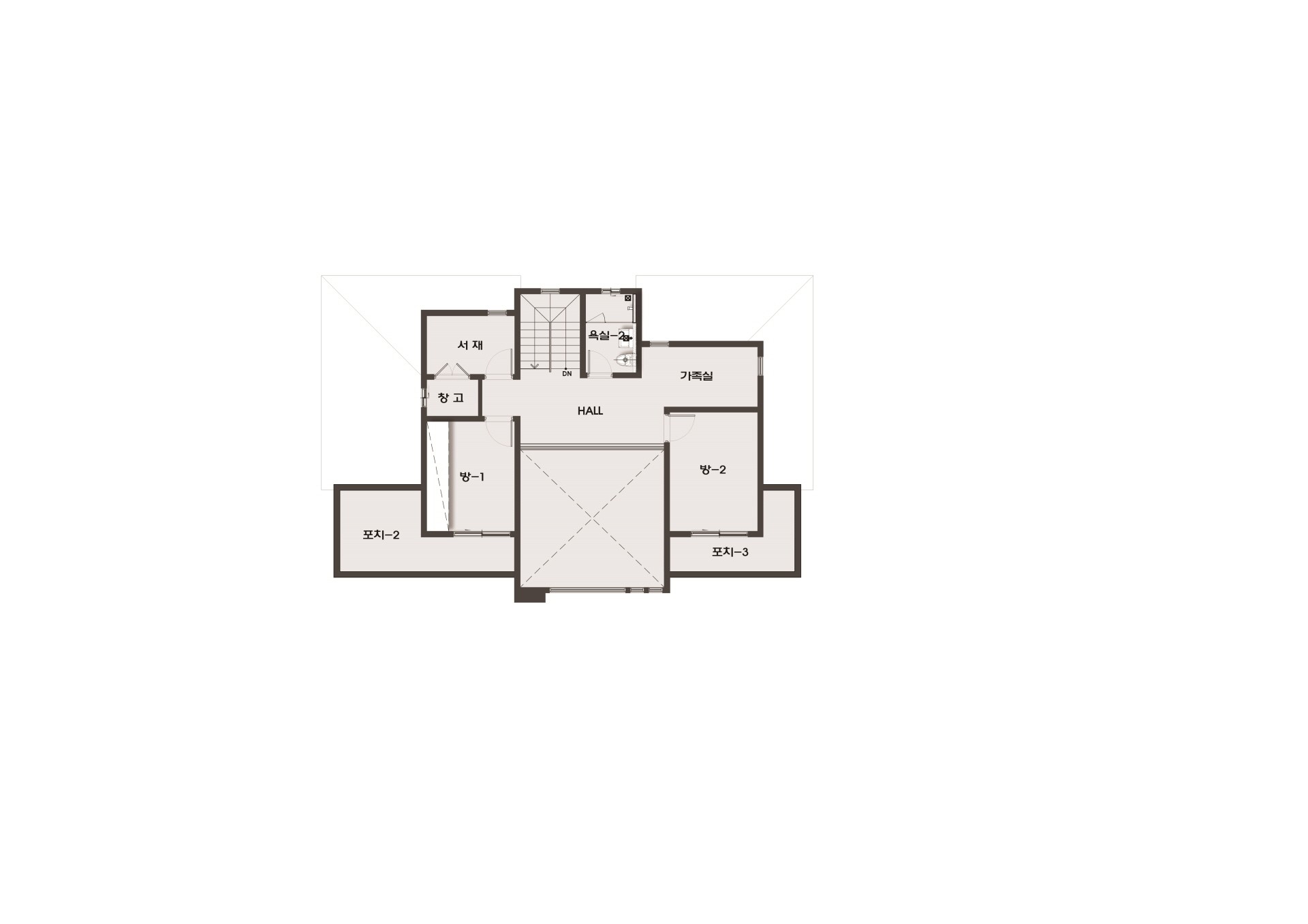83평형 완주 황운리 단독주택|노년을 준비하는 건축주의 주택으로 자녀들의 분가 전 노년을 준비하며 아파트를 벗어나 전원생활을 위해 건축 설계의뢰를 하였다.화분 키우기와 작은 식물들을 집안에 두고 싶어하는 사모님의 요구로 주방앞 작은 발코니를 형성하여 겨울에도 식물들이 자라날수 있도록 하였고 넓은 1층에 비해 2층은 시간이 지나면서 게스트들을 위한 계획을 하였다. 외관은 건축주의 요구로 일본식 스타일을 계획하였으며 단지 끝자리에 위치한 건축물의 좌우측면에 포인트를 주었다.