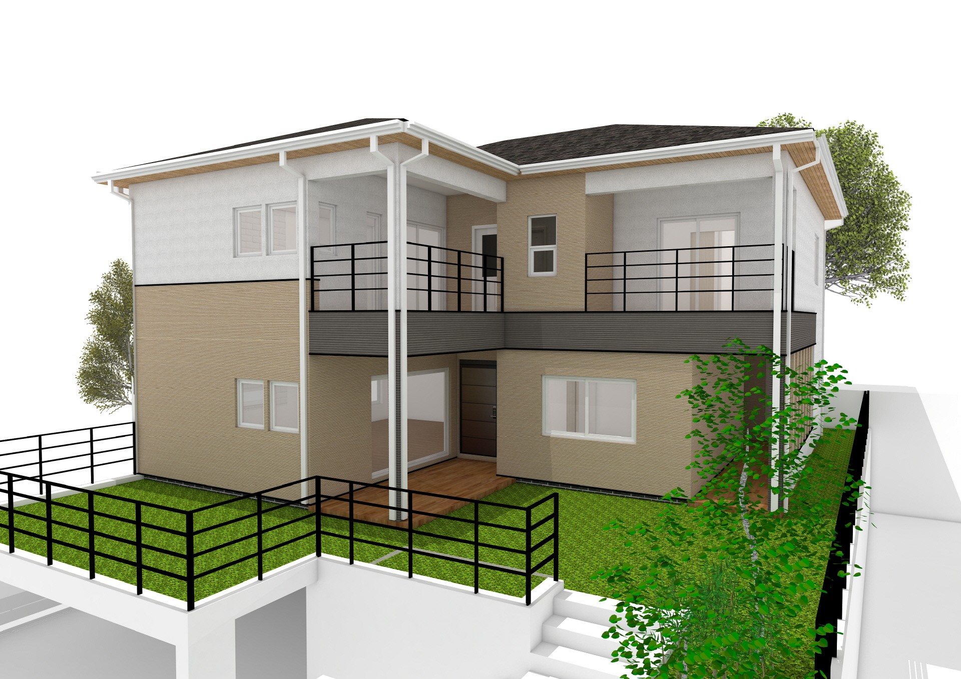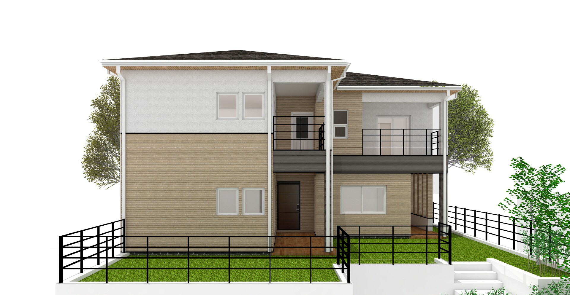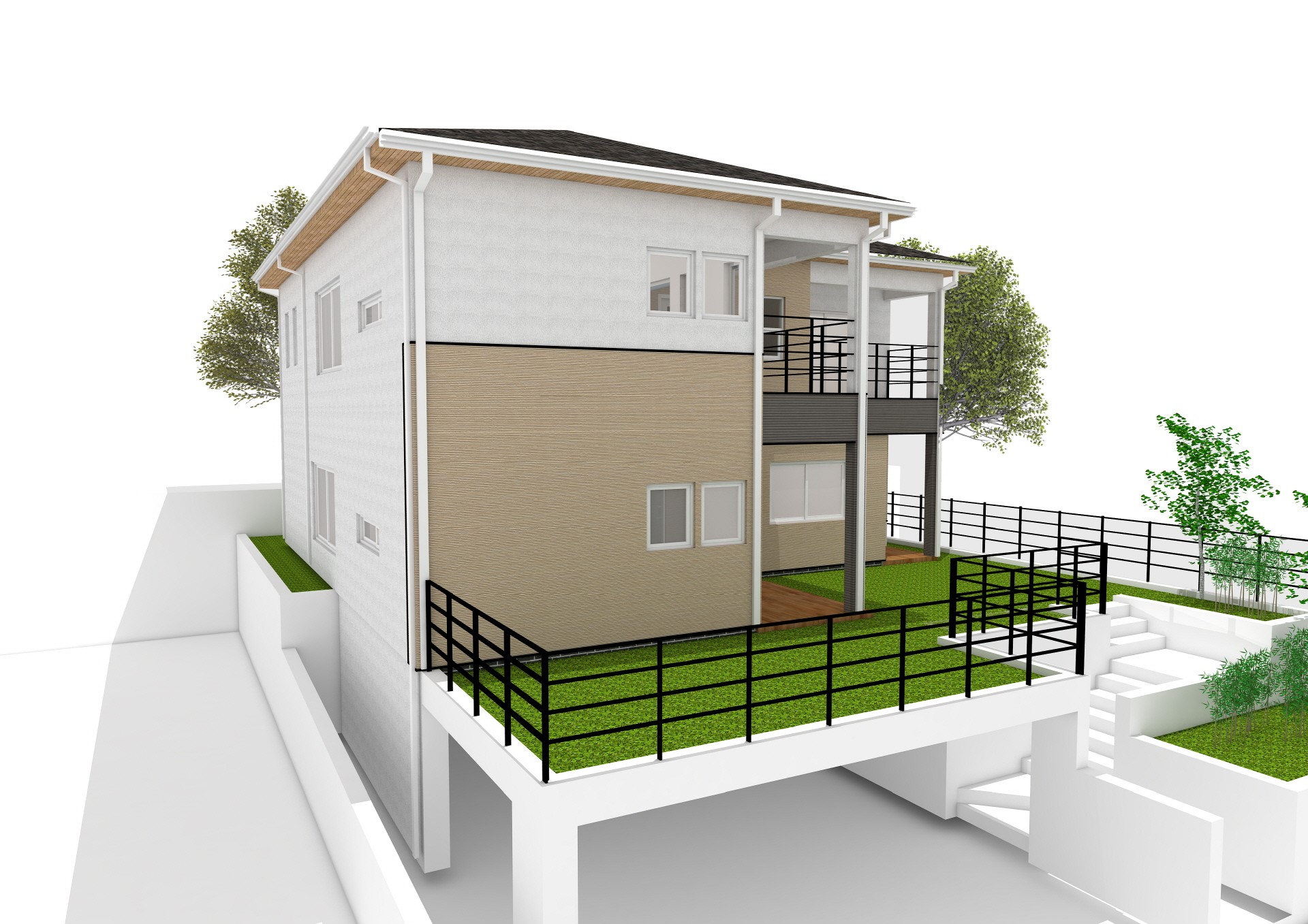 70평형 화성 반송동 다가구 주택|2세대가 함께 집을 마련하여 사는 다가구 주택. 건축주 부부가 노부모와 함께 주택을 꾸며 살아가는 주택. 1층은 노부모를 위한 설계 향후 임대 목적도 계획하여 설계진행을 하였고 그에 따른 인허가와 설비도 가구를 분리 하였다. 2층은 건축주 부부의 세대로 중학교 자녀와 함께 지내기 위해 건축설계 계획을 하였다. 캠핑을 좋아하는 가족으로 2층으로 올라가는 현관의 크기를 크게 계획하였으며, 택지계발된곳에 한가구처럼 보이게 하는것과 낮은 대지를 성토하여 높은 위치에 집을 짖는것이 건축주의 요구사항이였다. 그에 맞게 대지를 1M성토하여 건축물이 위치하는 대지를 올리고 외관은 한가구의 모습을 띄게 되었다.