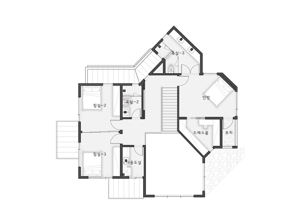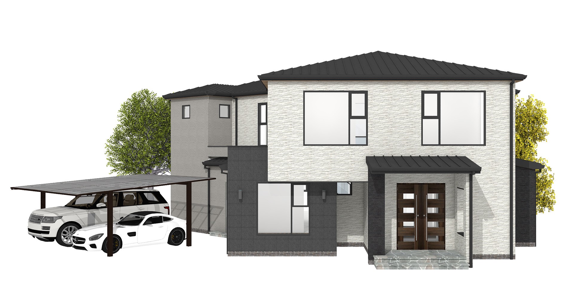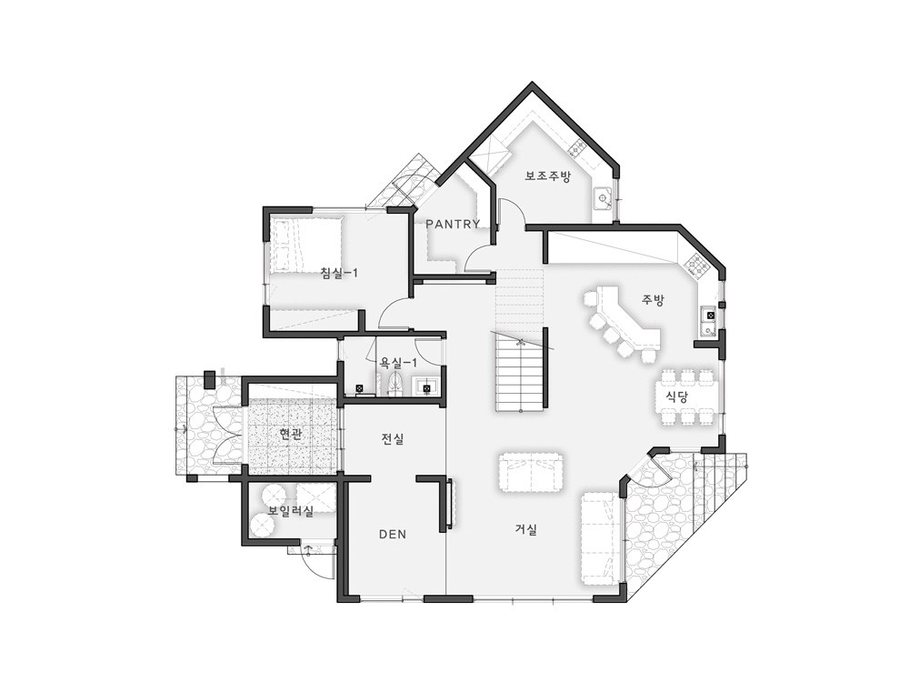 외벽재 : TORRAY 18mm 세라믹 사이딩, 스타코플렉스, 현무암 부정형 데크