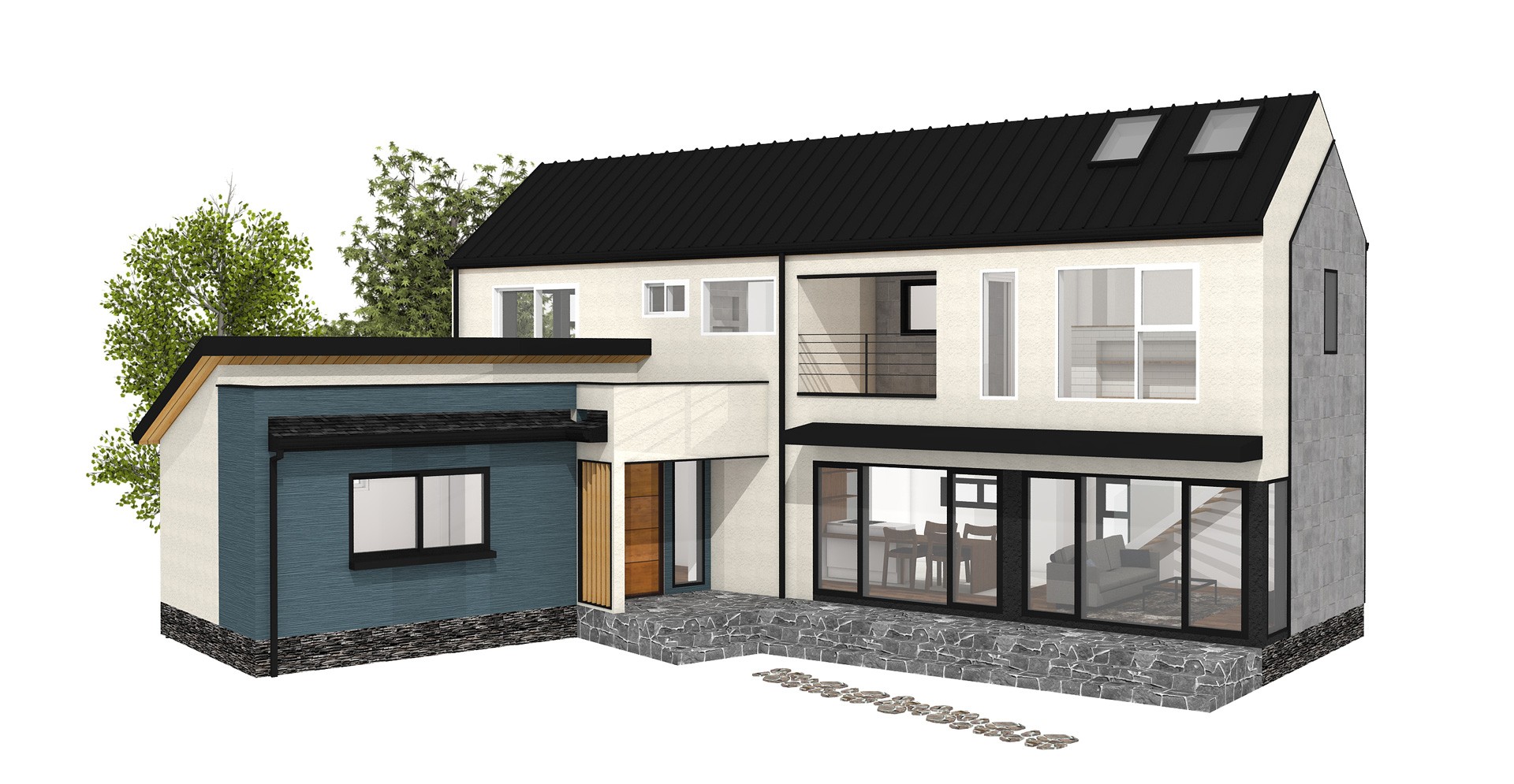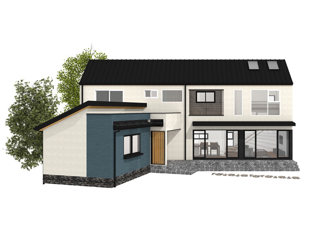 외벽재 : TORRAY 14mm 세라믹 사이딩, 현무암 정형, 스타코플렉스, 징크 포인트