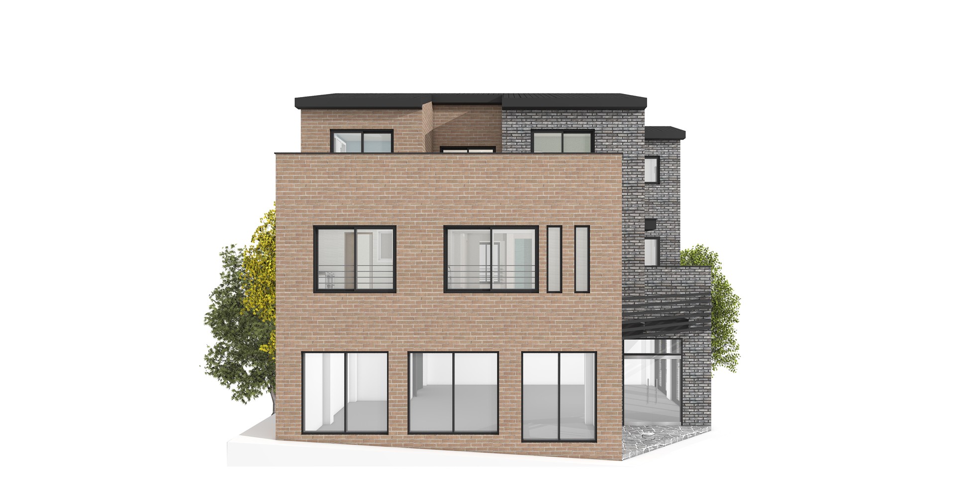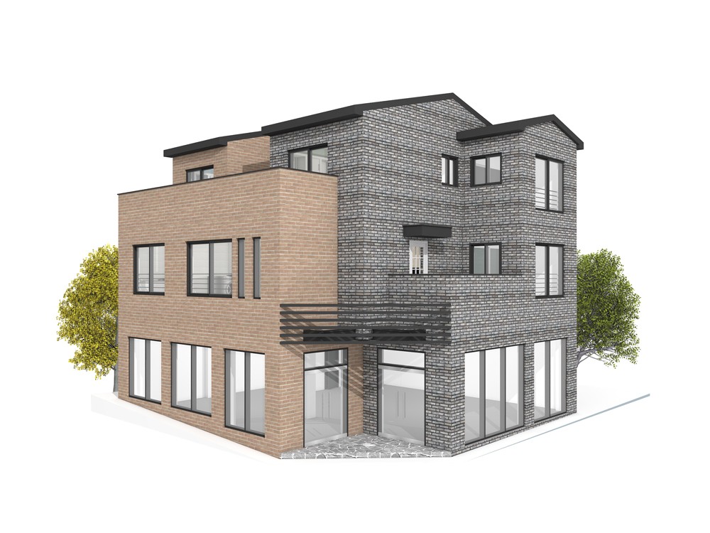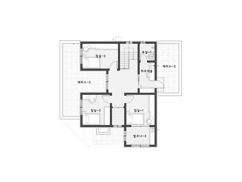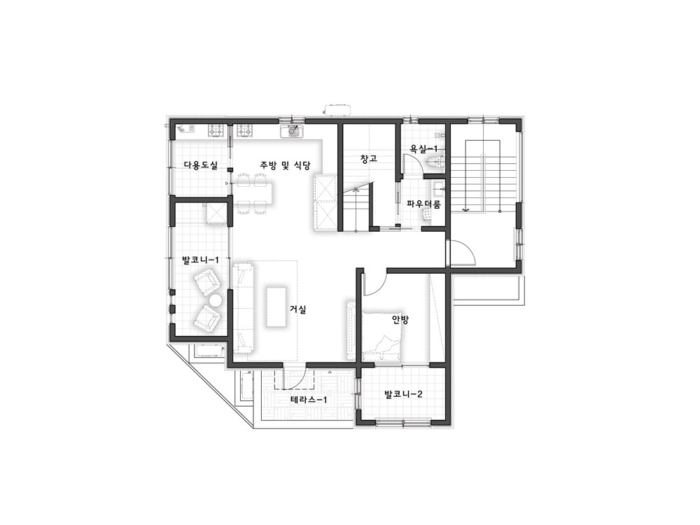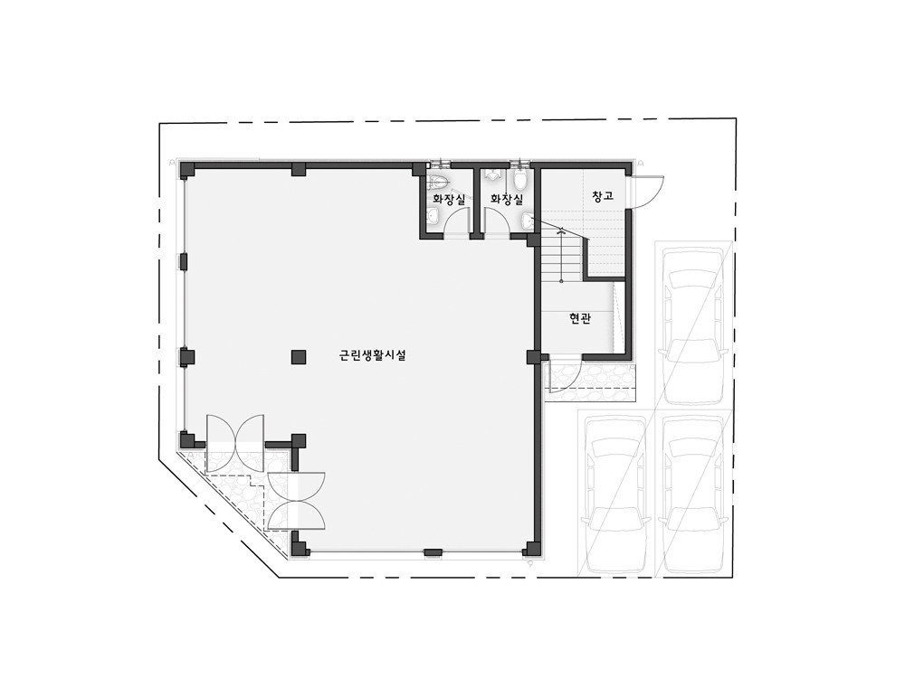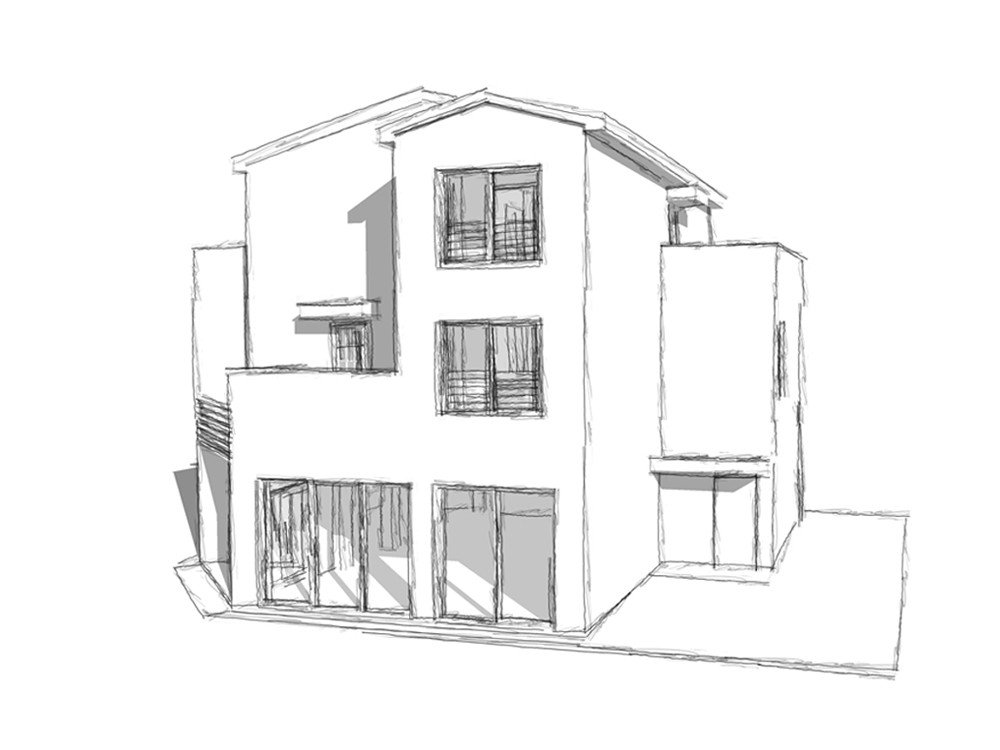 97평형 제주 노형동|코너 대지의 유리함을 이용한 1층의 상가와 2~3층 단독주택으로 설계된 상가주택. 근린생활시설은 코너에서 접근하도록 하고 주택의 주출입은 우측편으로 접근하도록 분리 구성하였다. 주택은 1층 주 계단을 현관으로 이용하여 2층의 공간 활용을 1층까지 가져온 구성으로 총 방4개와 넓은 발코니와 테라스를 활용한 설계이다.