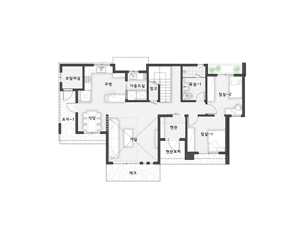 외벽재 : 스타코플렉스, KMEW 14MM 세라믹 사이딩, 합성목재 사이딩(NewTechWood), 현무암 부정형 데크