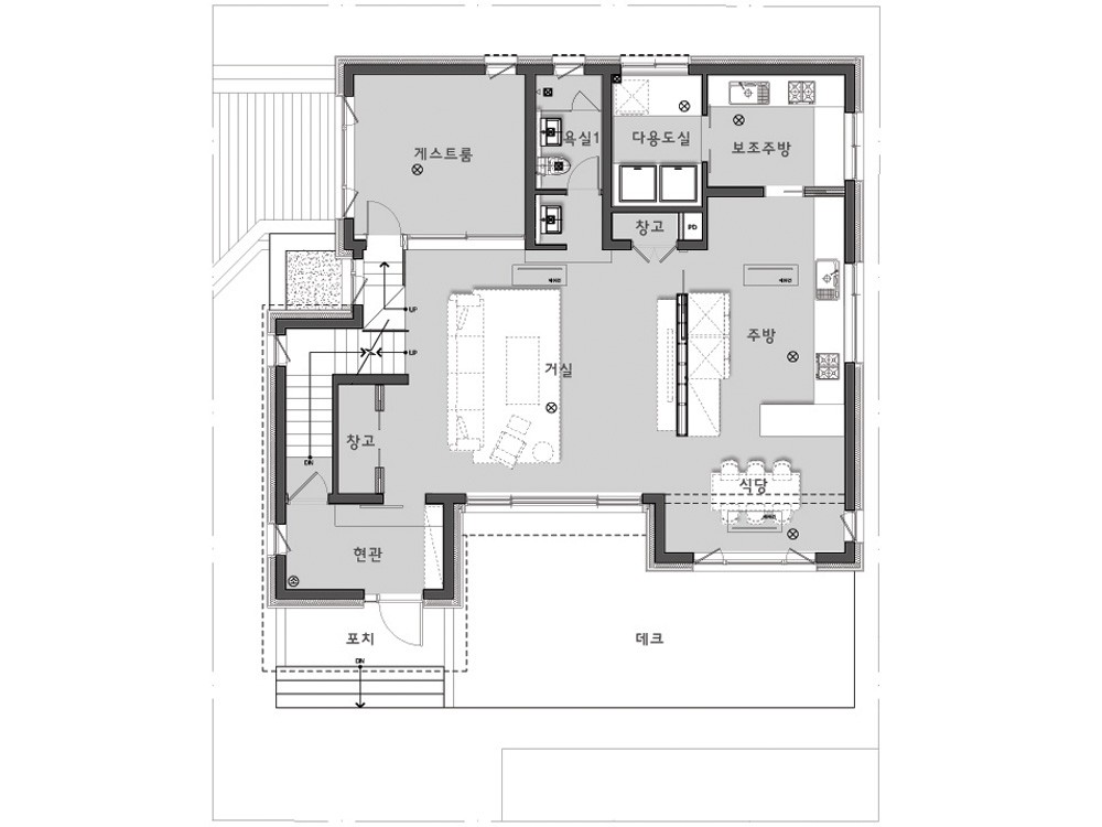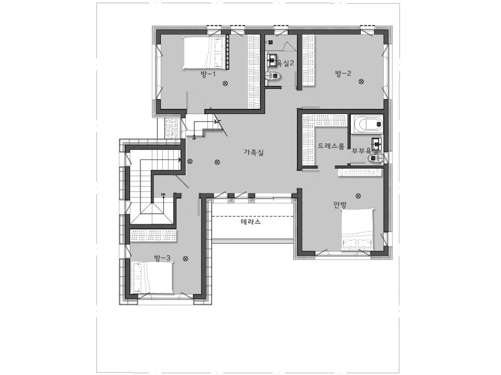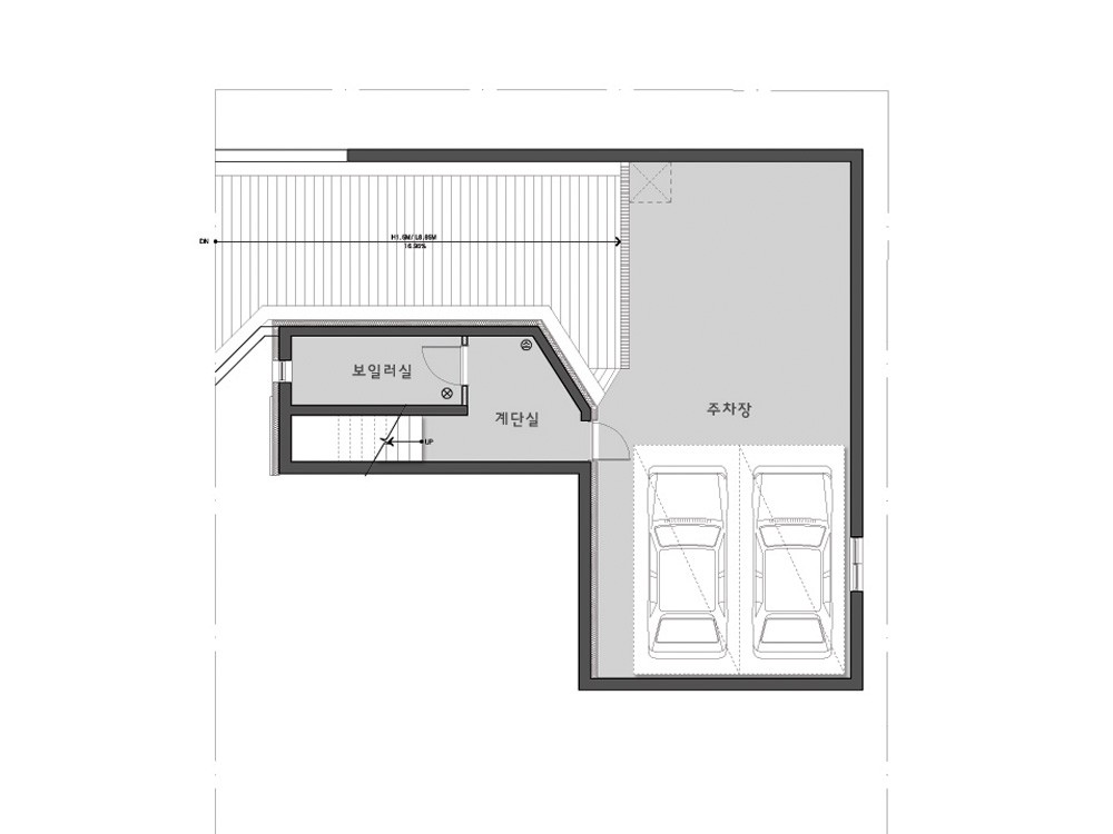 115평형 성남 운중동|서울 도심지 아파트에 거주하며 전원생활을 꿈꾸다 택지계발지역 중심에 토지를 매입해 도심에서 전원생활을 시작하는 건축주님 가족을 위한 모던 형식의 웅장한 주택. 지하주차장을 만들어 지하를 활용하고 자연스럽게 1층의 바닥을 지면을 높이는 설계를 하였다. 1층의 중심에 넓은 거실이 위치하고 단차가 나는 게스트룸을 두어 공간의 재미를 주었다. 2층은 가족을 위한 공간으로 4개의 방과 2개의 화장실을 설계하였고, 외부조방을 위한 테라스가 있다.