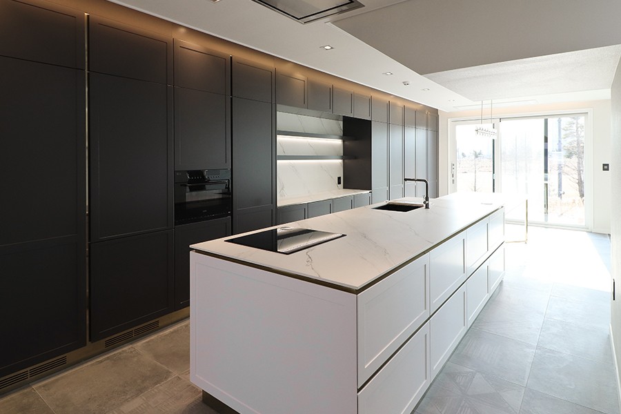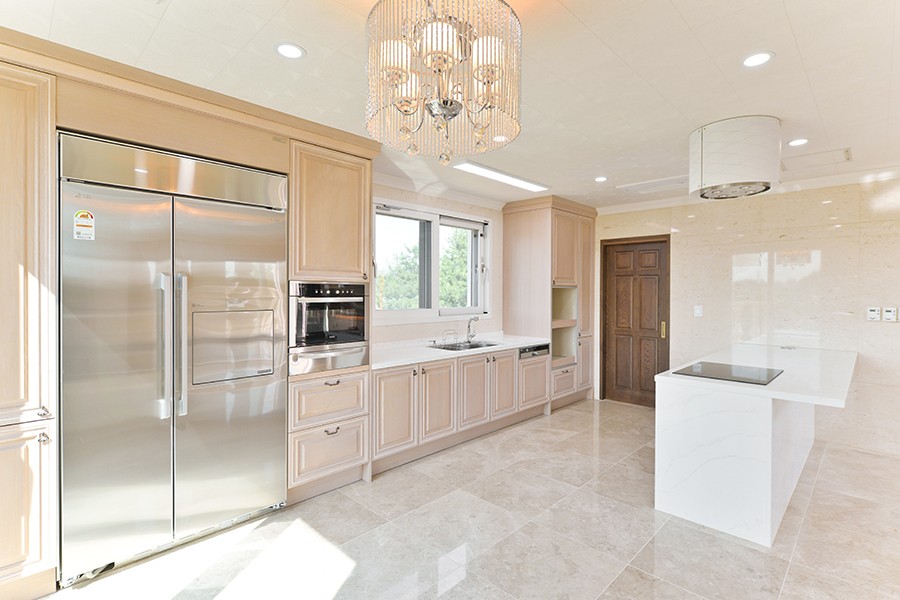 무게감 있는 다크 그레이톤과 골드를 포인트 준 청라 19호 1층 주방은 심플하면서도 고급스러운 분위기를 조성하도록 하였는데요. 빌트인 냉장고와 화이톤 가구 마감으로 전체적으로 통일감과 깨끗한 분위기를 연출하였습니다.