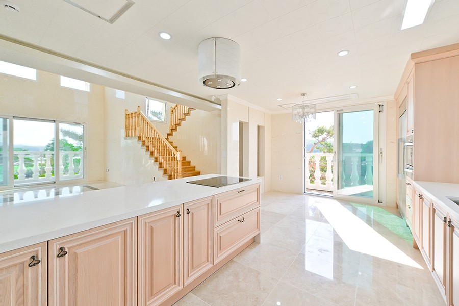 11자 형태의 주방 가구를 사용한 여주 신진동 주방은 전체적인 집 컨셉과 맞게 프로방스 느낌을 살려 인테리어 하였는데요. 핑크 톤과 화이트 컬러를 사용하여 오래 보아도 질리지 않는 공간을 연출하였습니다.