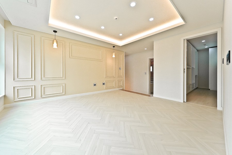 클래식 스타일로 인테리어한 청라 18호 방을 살펴보면 아이보리 계통의 웨인스코팅 인테리어 기법과 천정 몰딩을 통해 전체적으로 깔끔하면서도 고급스러운 느낌을 연출하였습니다.