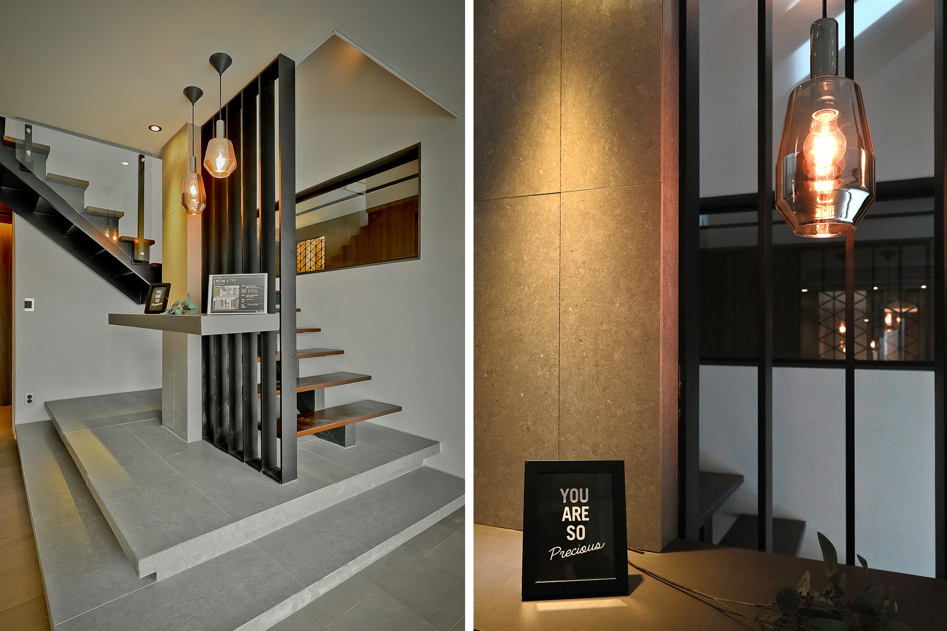 집 중심에 위치한 오더프리마3 계단 공간을 살펴보면 젠 스타일로 인테리어 하여 한층 무게감 있고 은은한 분위기로 연출하였는데요. 금속 파티션과 선반을 설치하여 밋밋한 공간에 포인트를 주기도 했습니다.